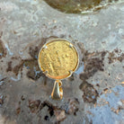 This exquisite 18Kt Gold pendant houses a 24Kt Gold Byzantine coin (Tremissis) 6th Cent AD depicting the Emperor Justinian I. On the rear, we can see the Victory holding globus and wreath; star to right.