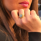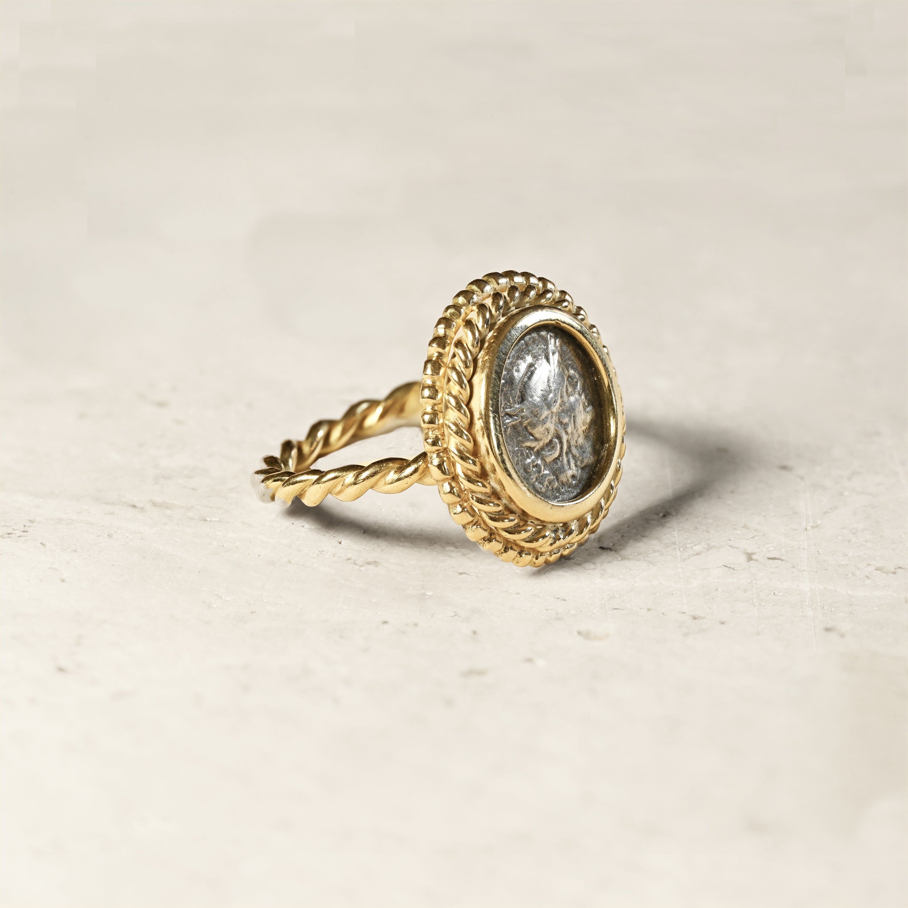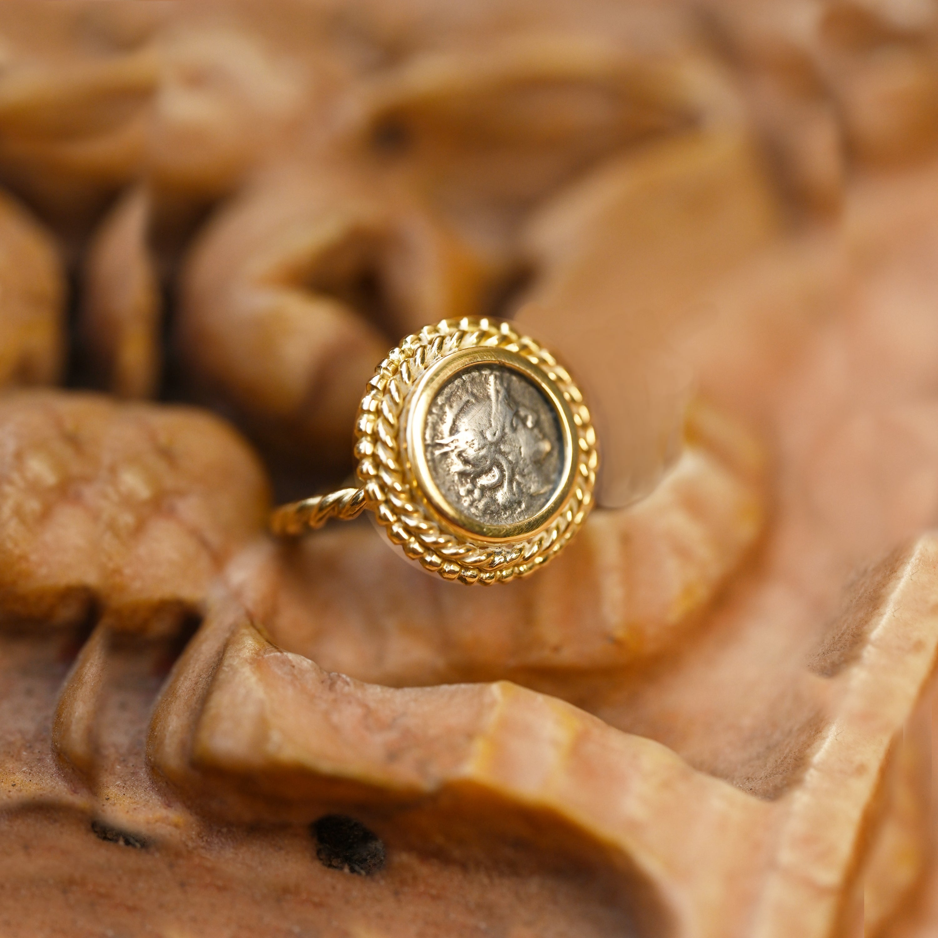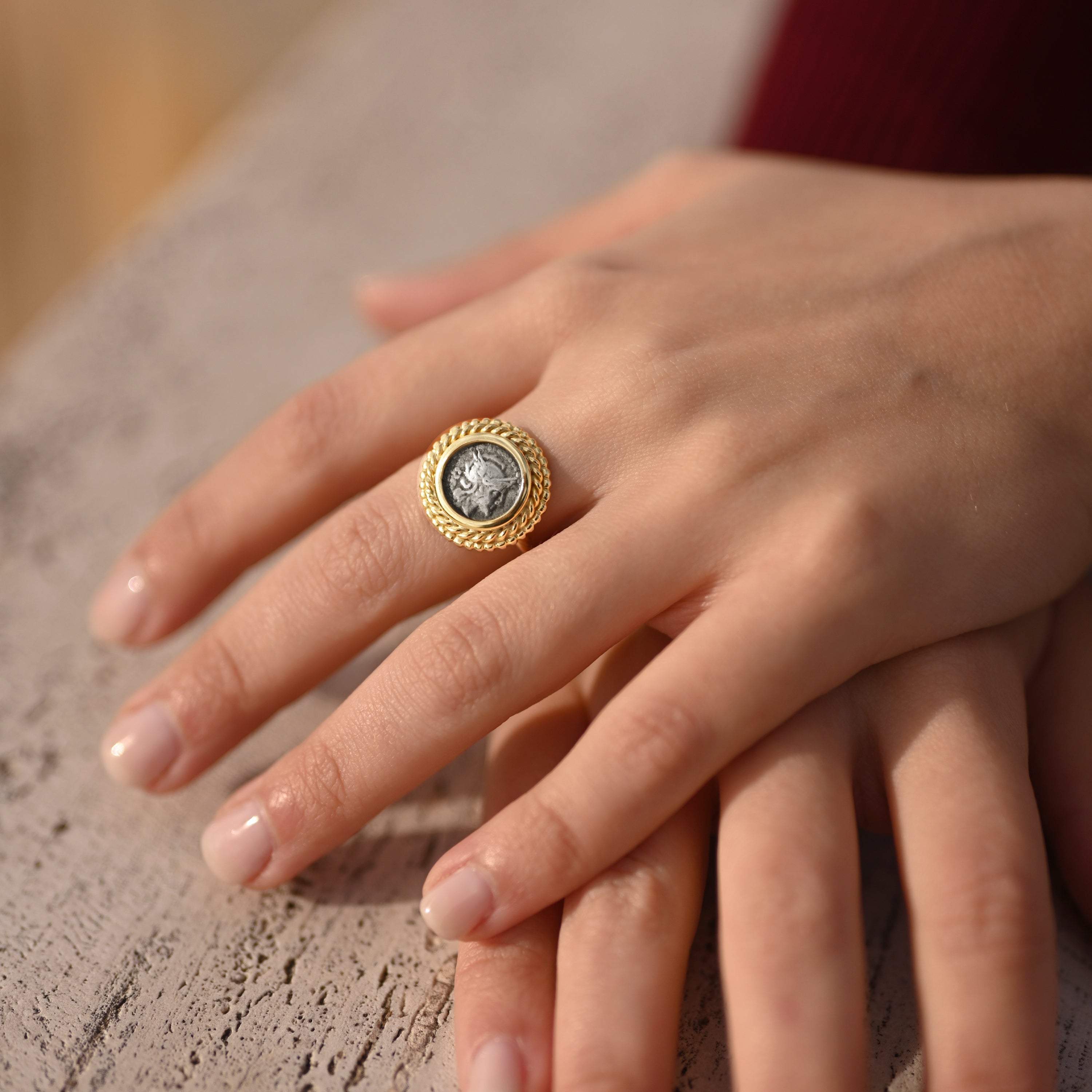 This stunning 18 kt gold ring showcases an authentic silver Roman coin, specifically a sestertius from 211 BC, featuring a depiction of the Goddess Rome. Meticulously crafted, this ring is a testament to artistic skill and attention to detail. The goddess Rome held significant importance in ancient Roman religion, symbolizing the city of Rome and the Roman state. Her representation on coins, sculptures, and architectural designs conveyed Roman political and religious ideals.