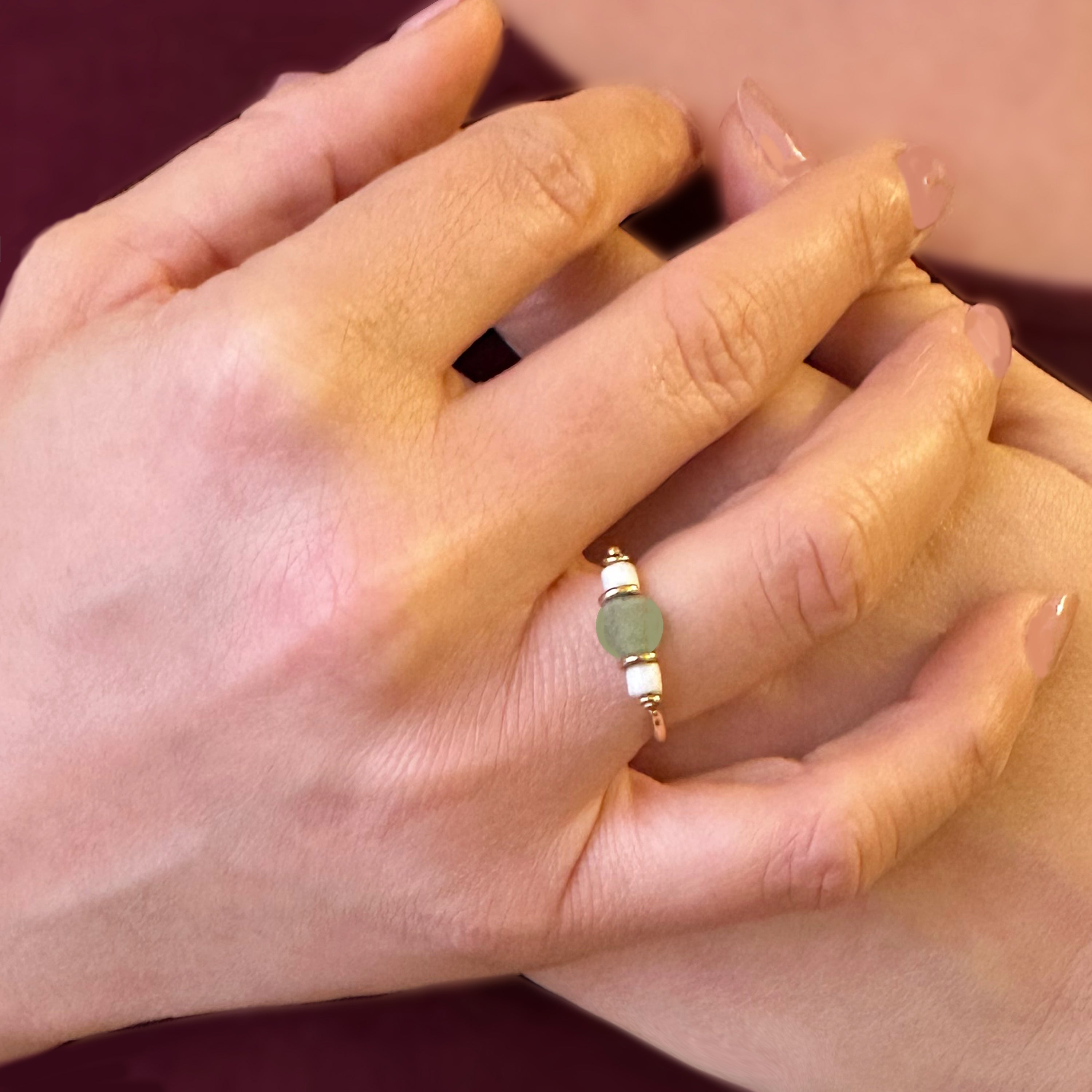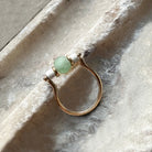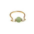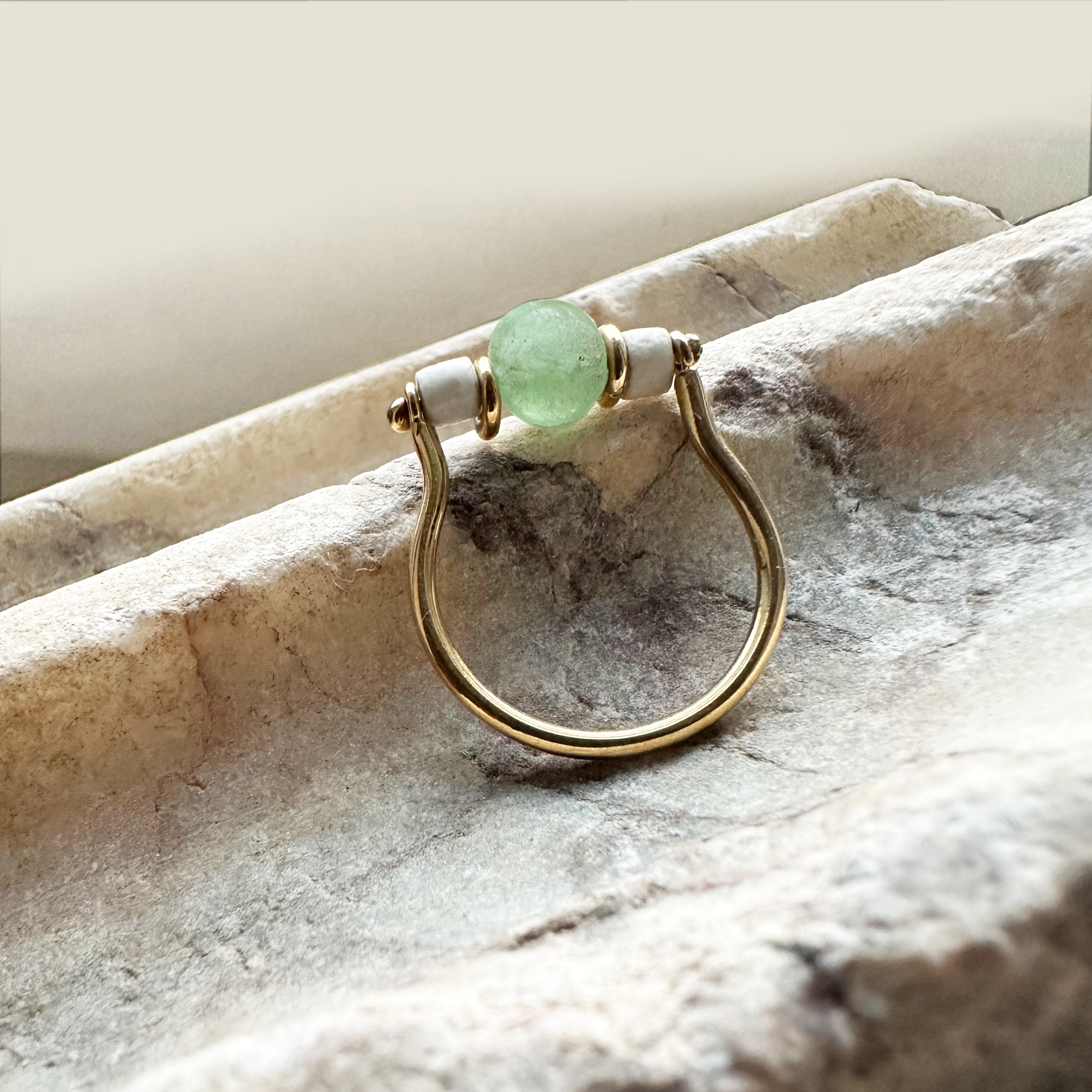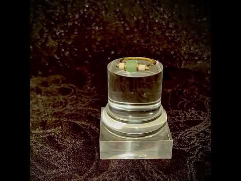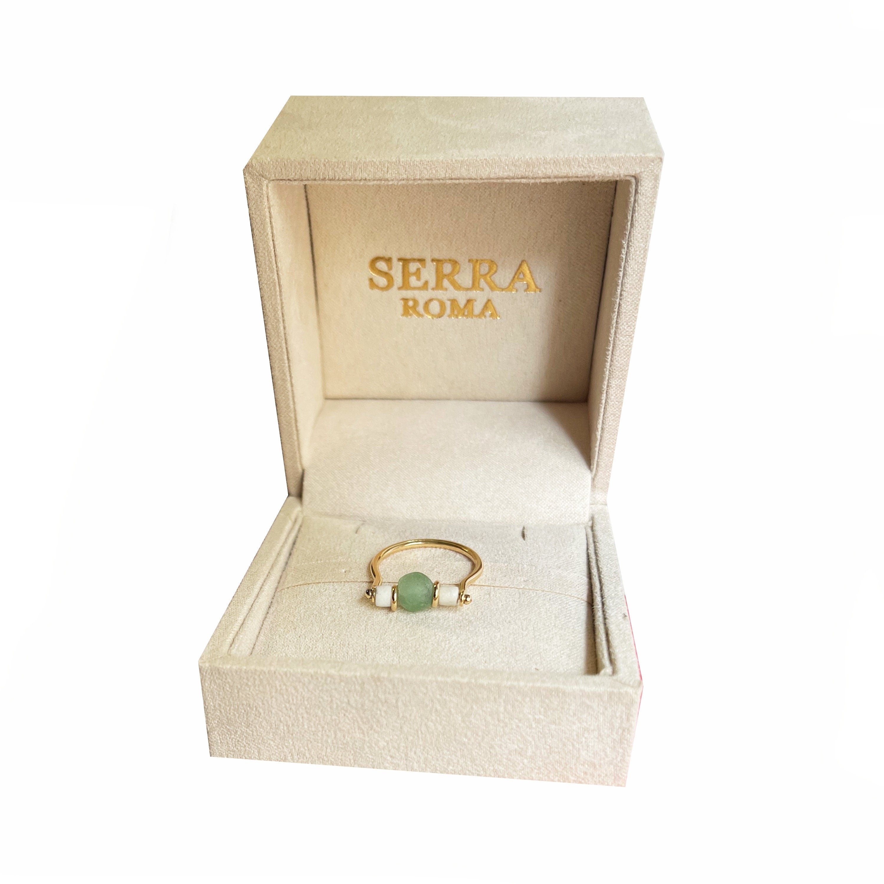 Within this 18 Kt gold ring, meticulously crafted by our skilled goldsmiths, rests a green Roman glass bead dating back to the 1st century AD. Flanking it on either side are two white faience beads also originating from that era. The lineage of Roman Glass stretches back to the early 1st century AD, employing ancient Hellenistic glassmaking methodologies initially. During this period, the primary creations in Roman Glass comprised vases and vessels designed for water transport.
