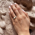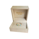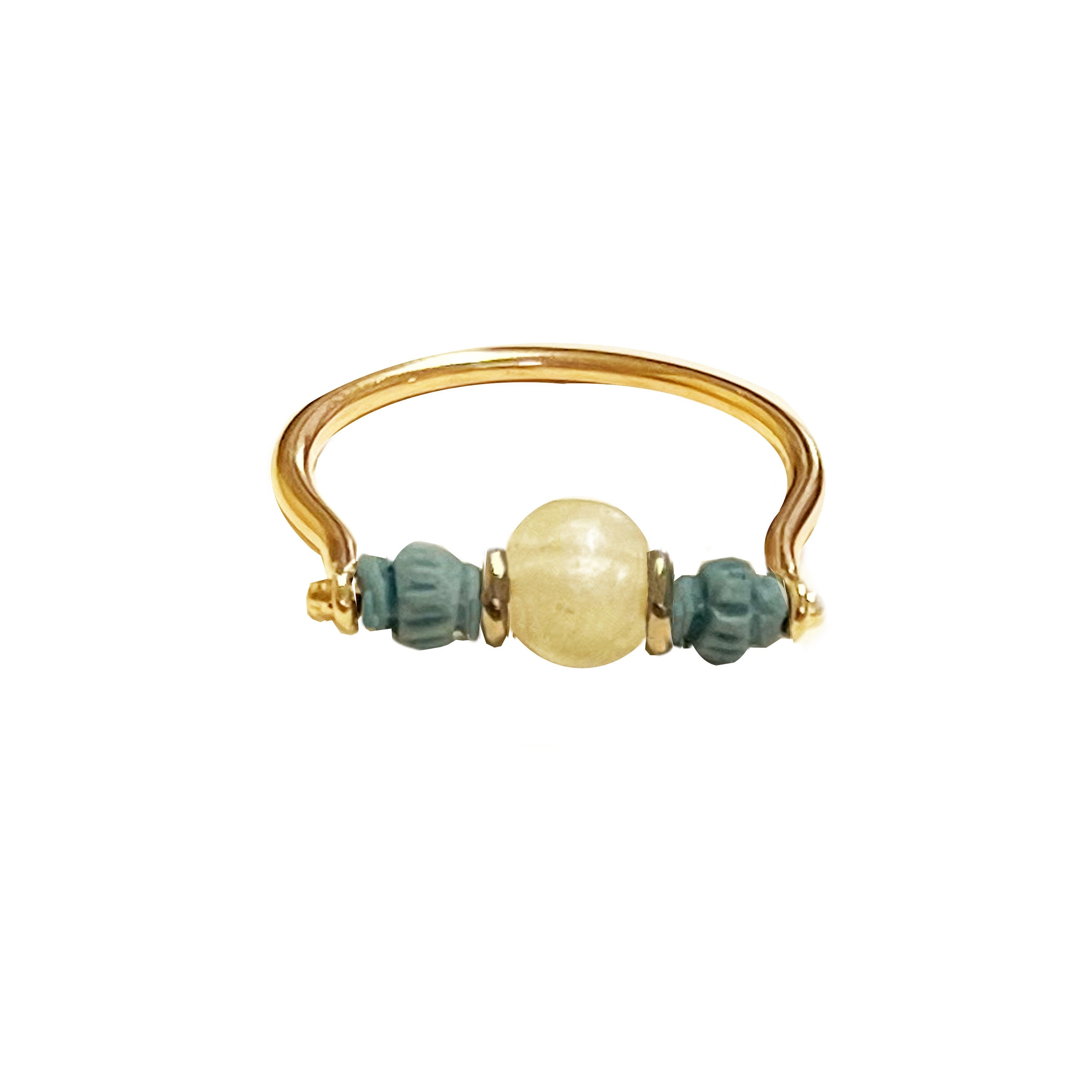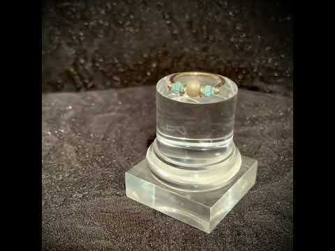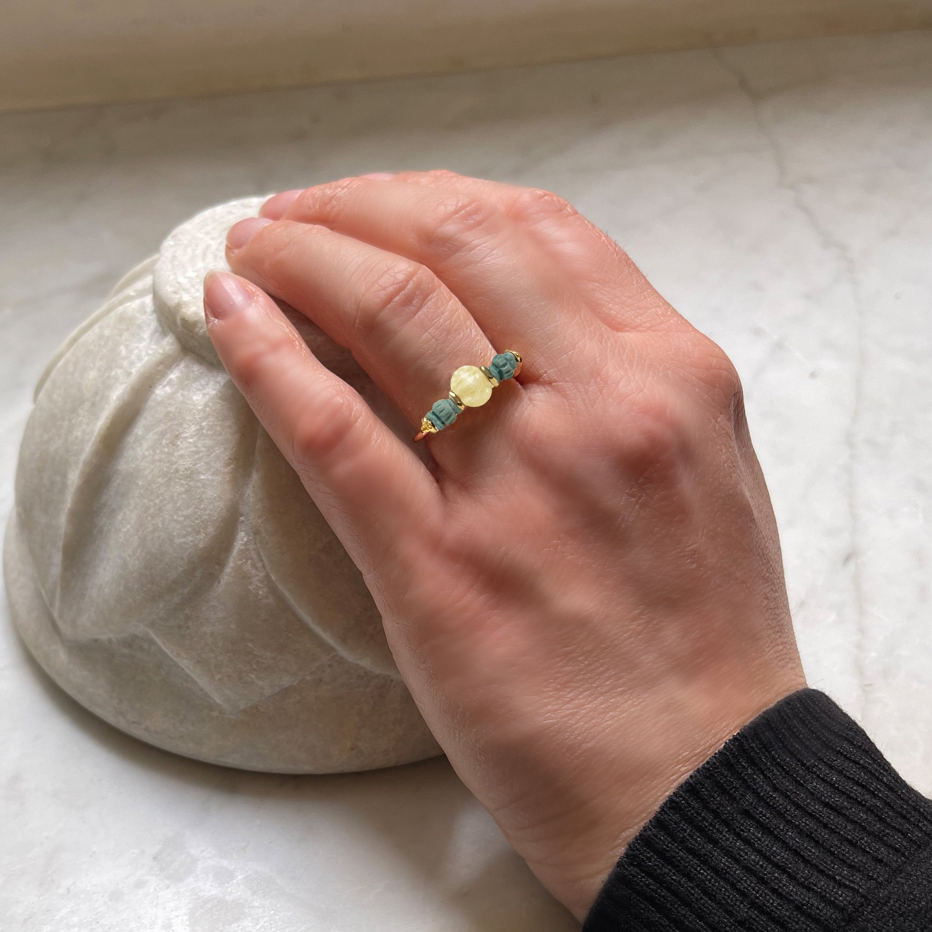 This meticulously crafted 18 Kt gold ring is a testament to artistry, featuring stunning elements—an exquisite central piece of clear Roman glass dating back to the 1st century AD, flanked by smaller blue Roman faiences, all meticulously arranged by hand.