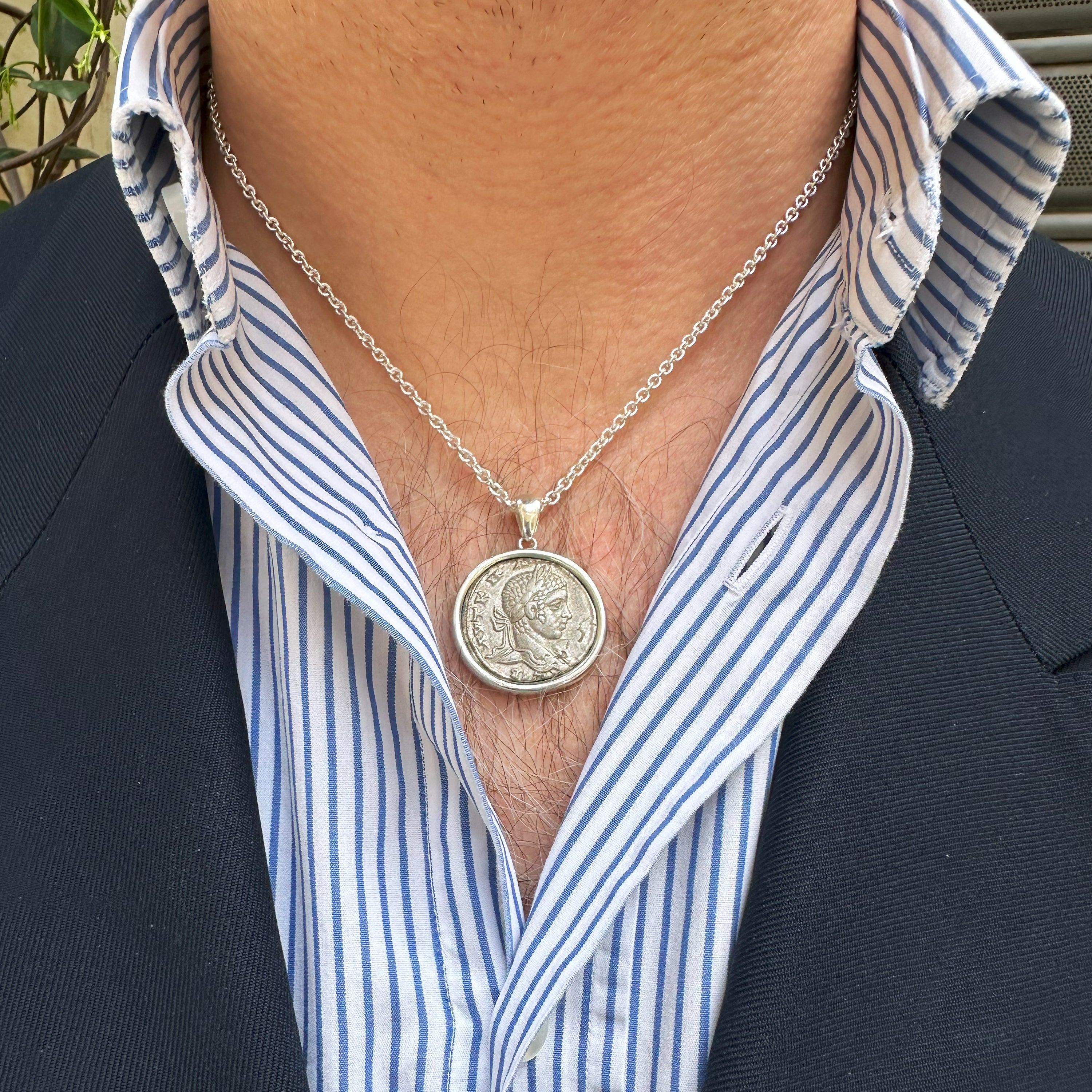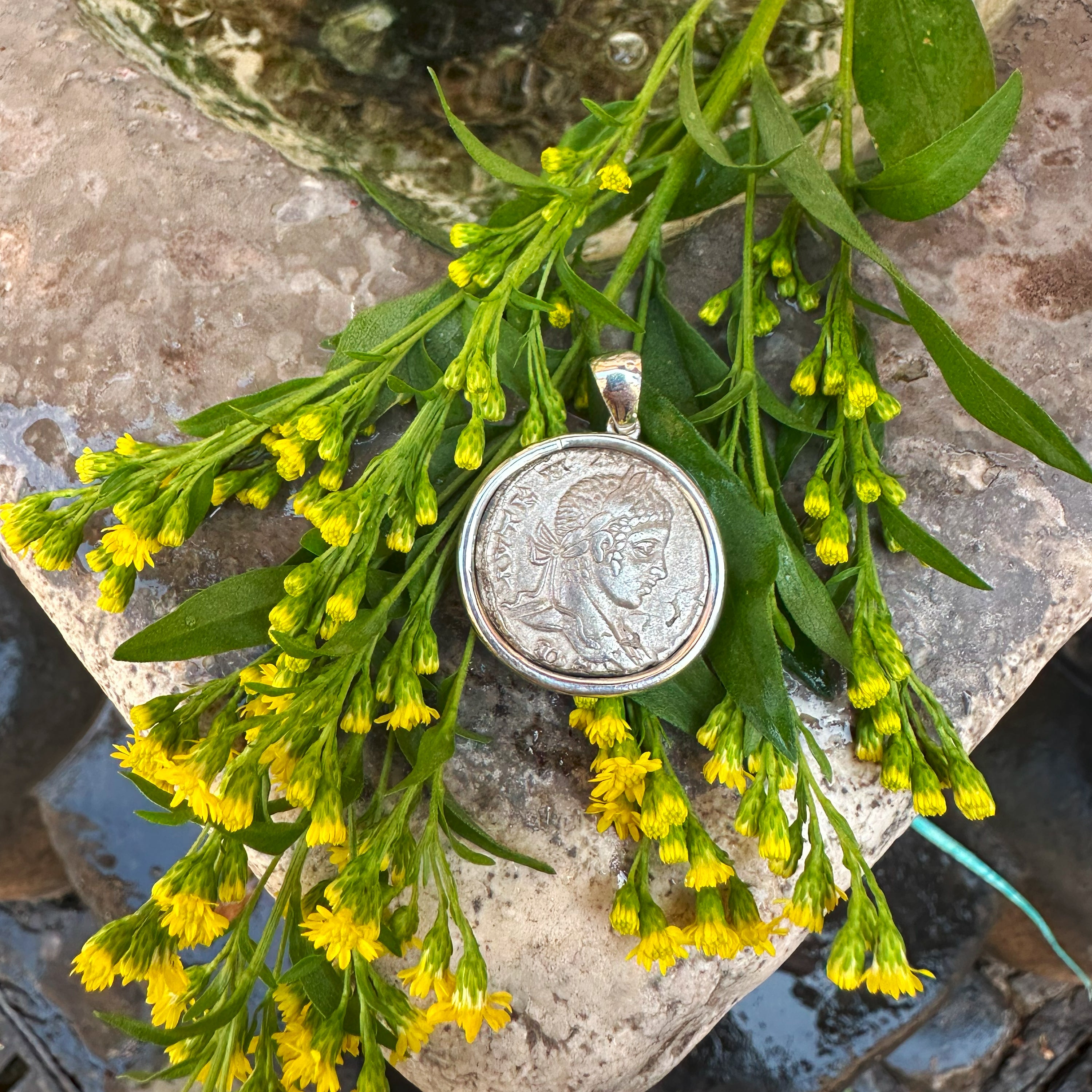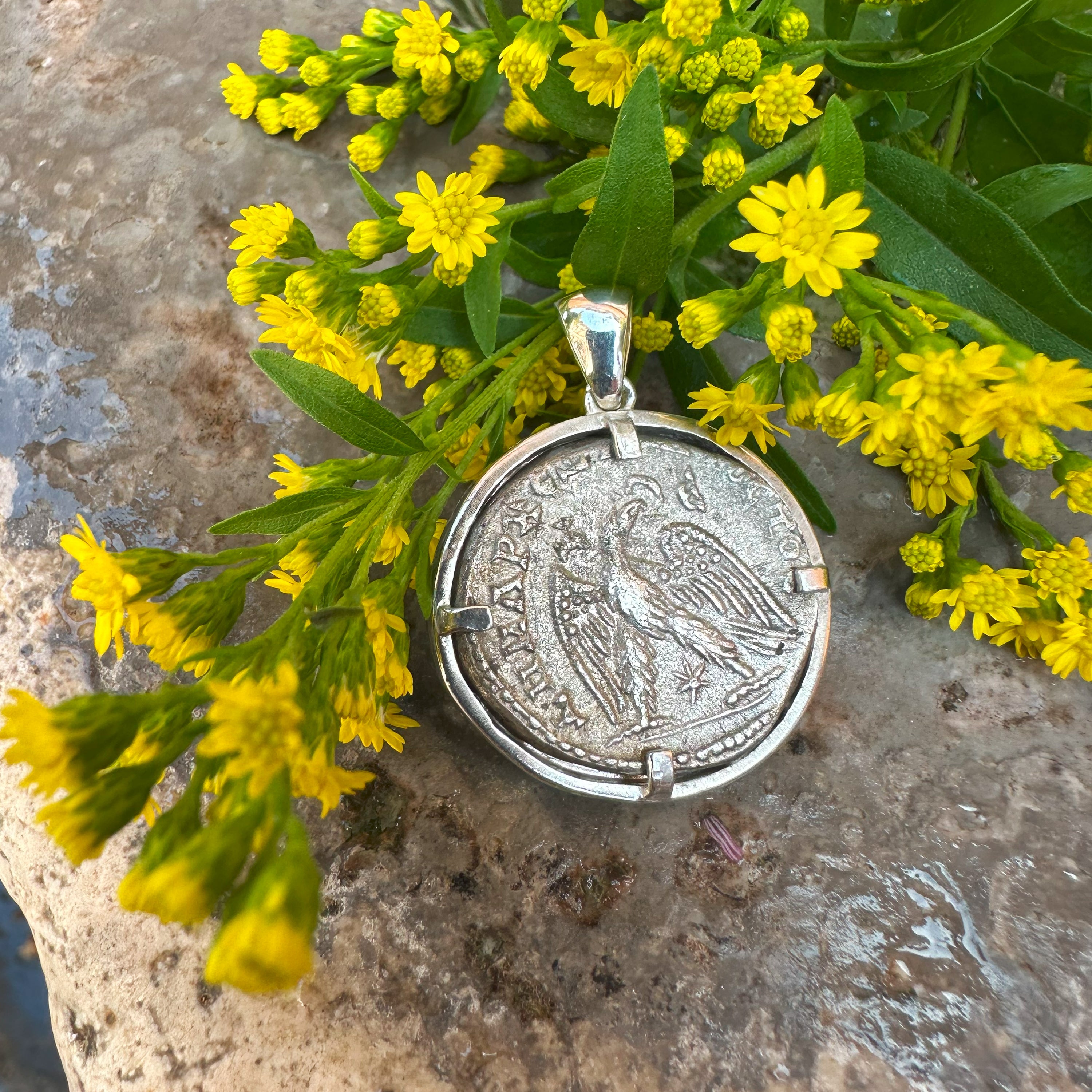 This sterling silver pendant features an authentic Roman coin dating back to the 3rd century AD, specifically a tetradrachm portraying the bust of Emperor Elagabalus on the front (obverse), while the reverse showcases an eagle grasping a laurel wreath in its beak.