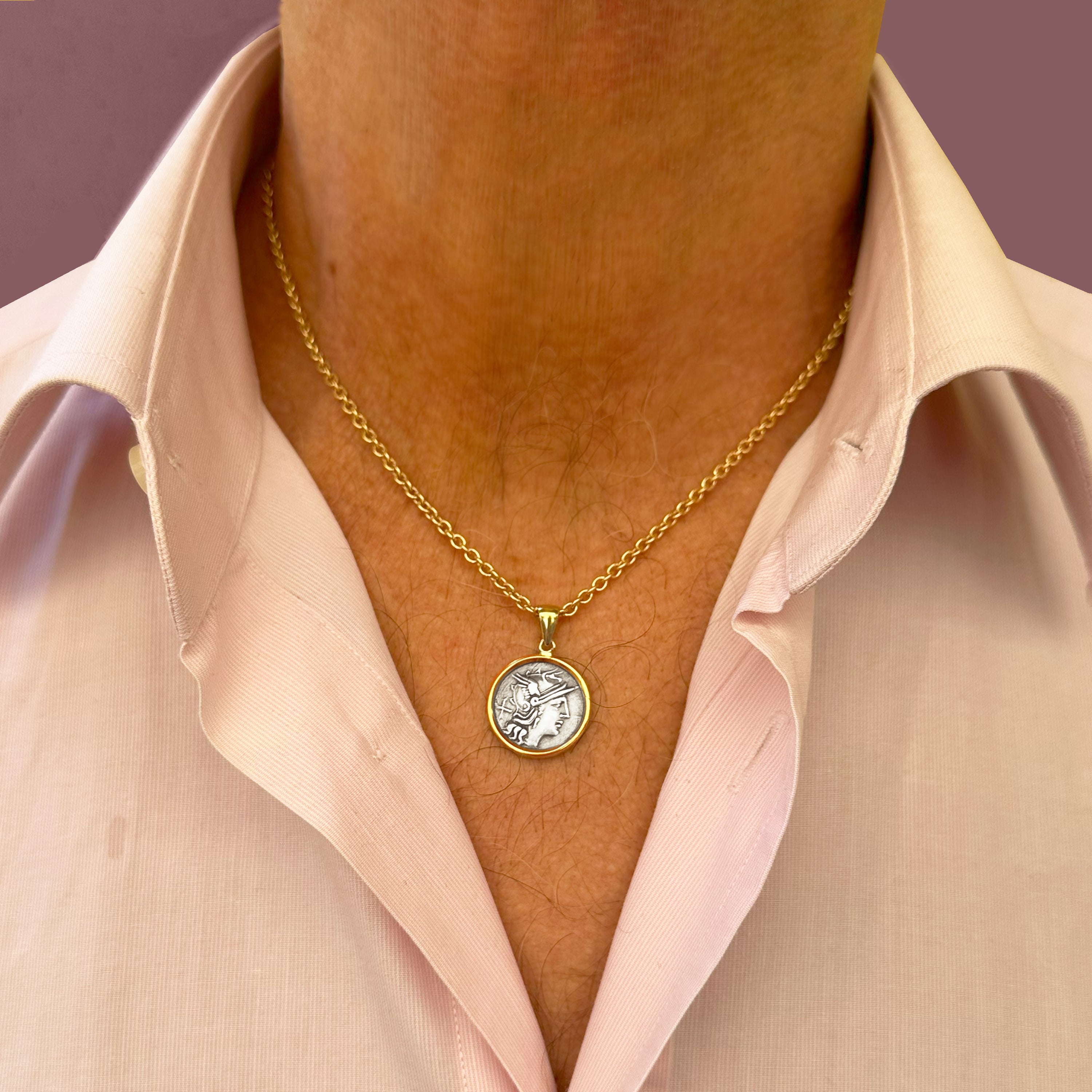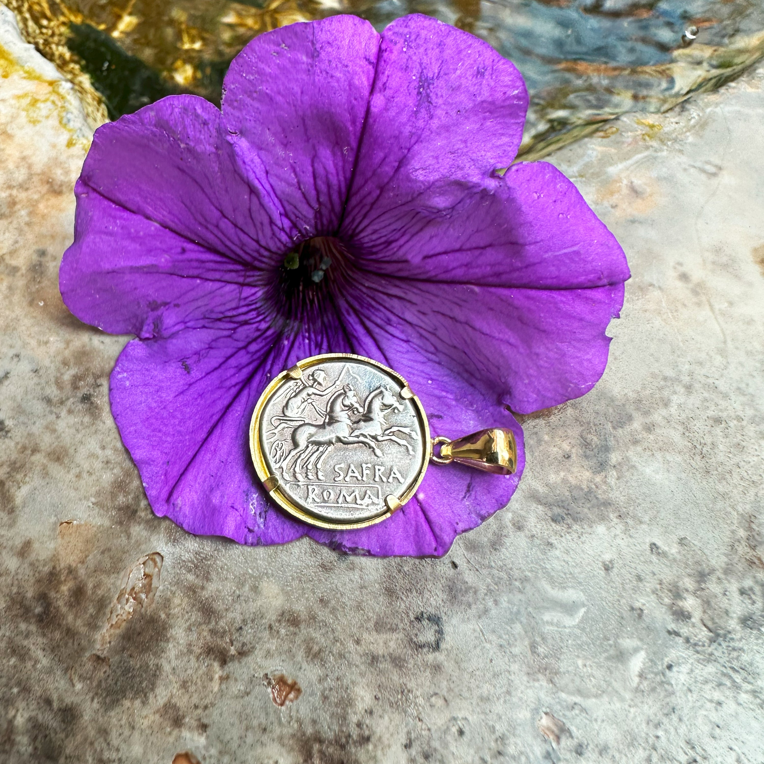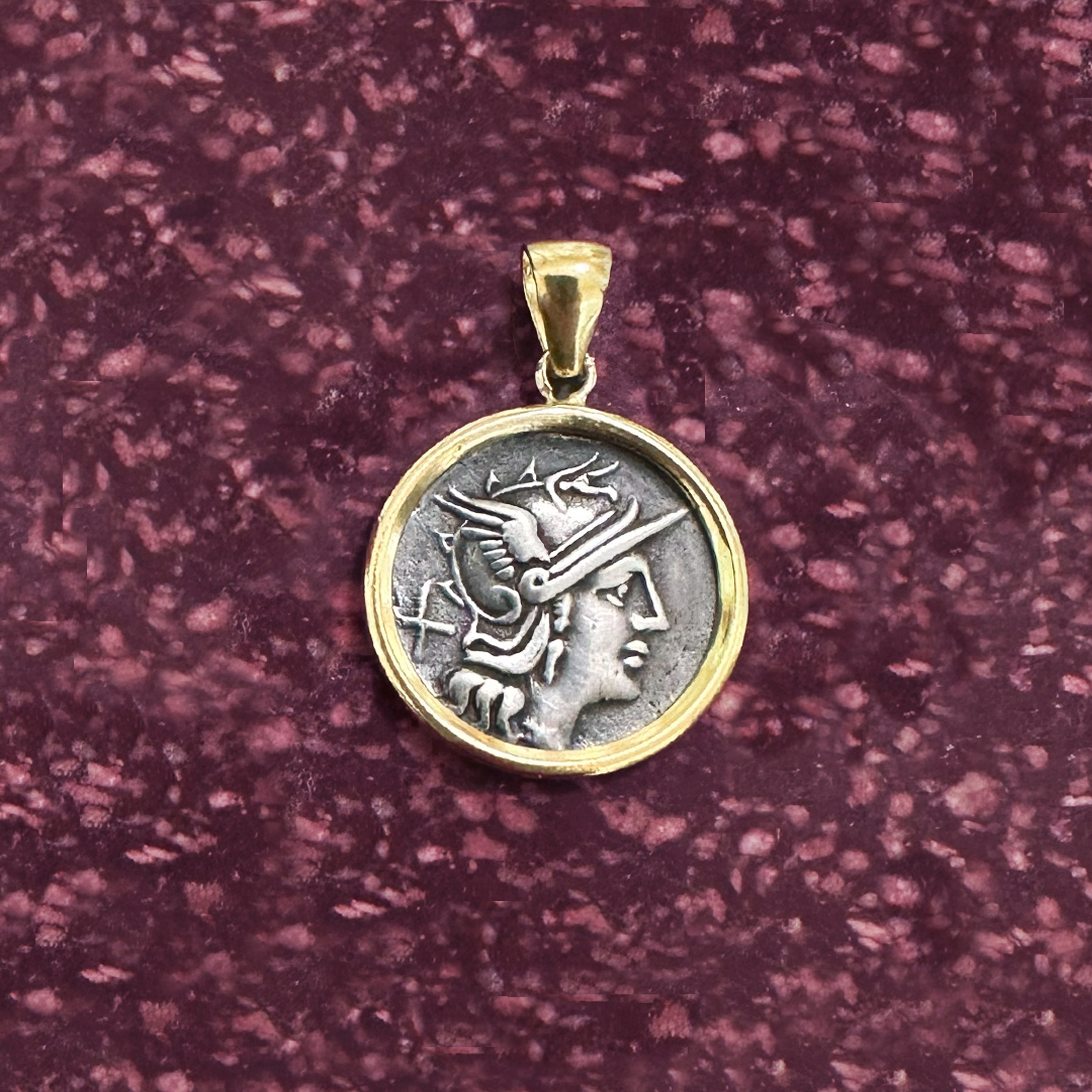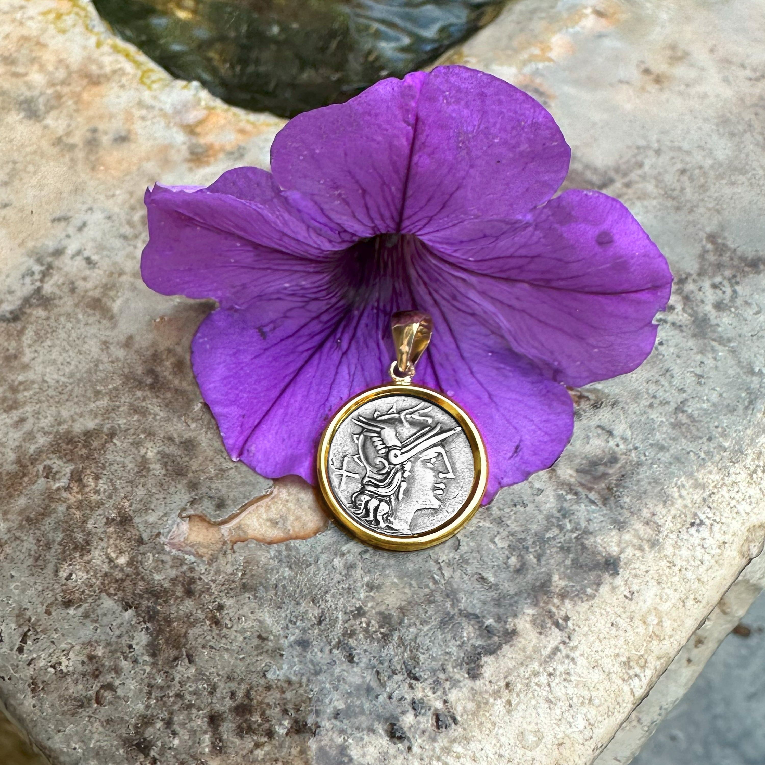 Discover a remarkable 18kt gold pendant featuring an original Roman silver coin dating back to 150 BC. This exquisite piece showcases a captivating depiction of the revered Goddess Rome. On the reverse side of the coin, you'll find the image of Victory riding a chariot.