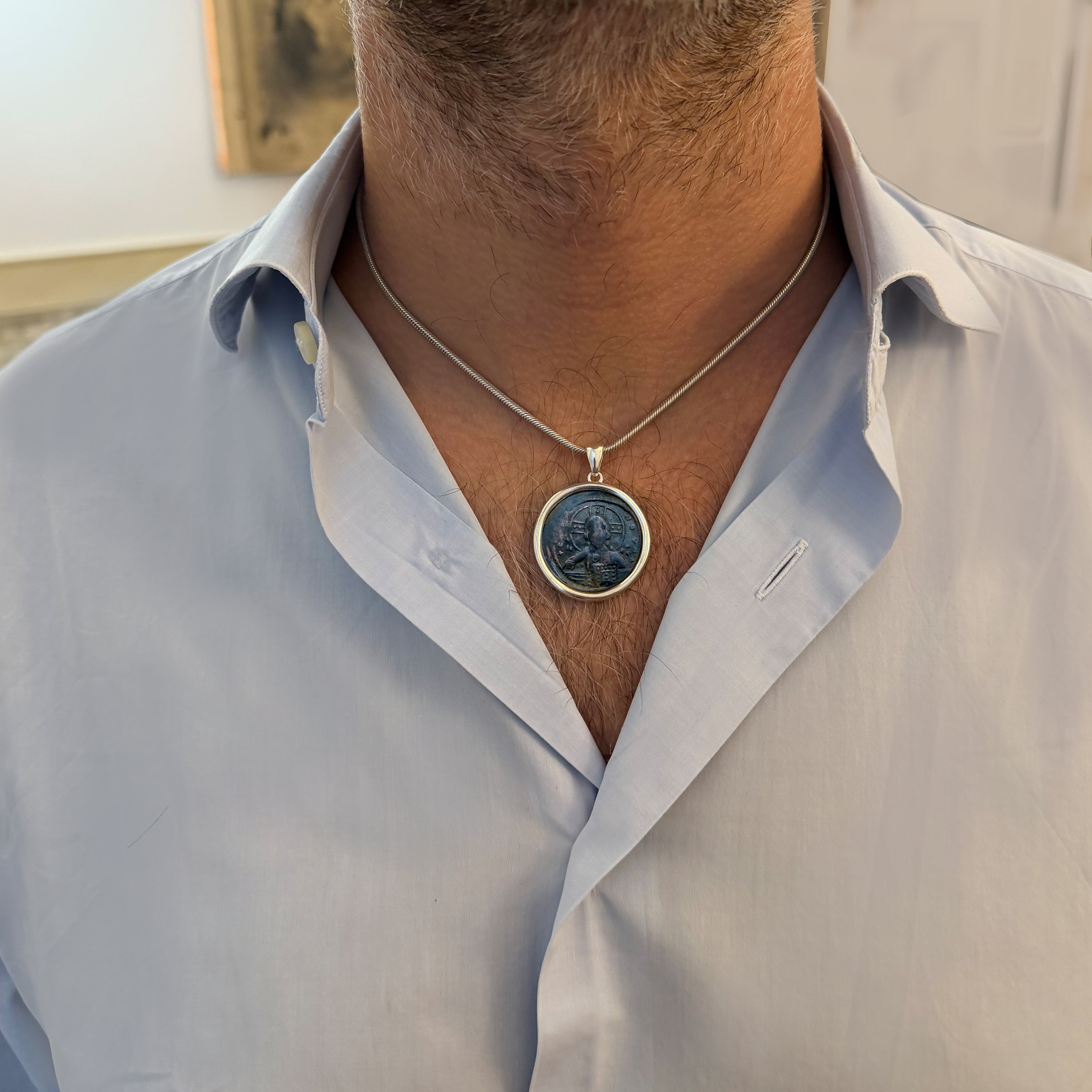 Discover a captivating sterling silver pendant set with an authentic bronze coin from the 10th century AD, depicting the face of Jesus Christ. On the reverse, an inscription proclaims "Jesus Christ, King of Kings."
