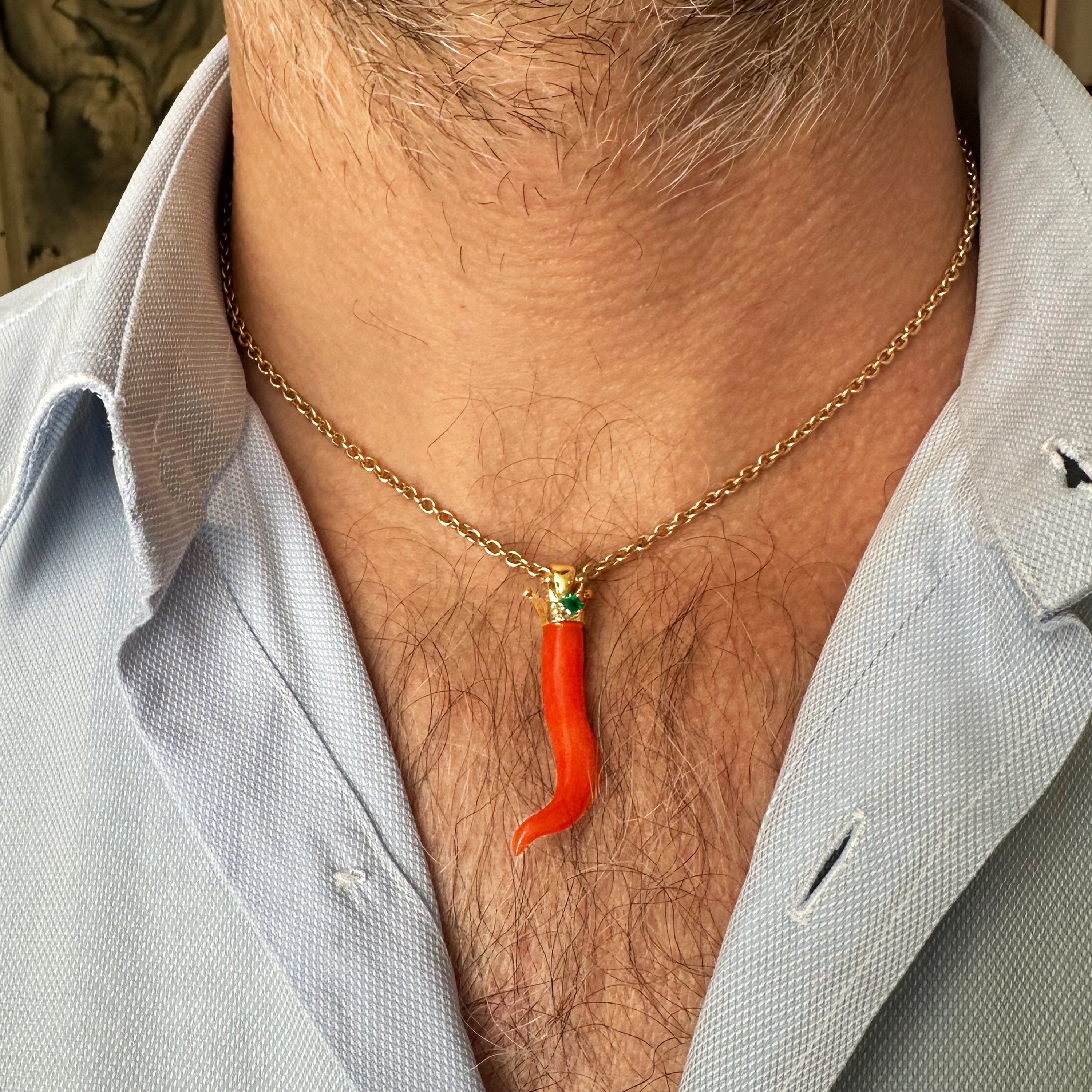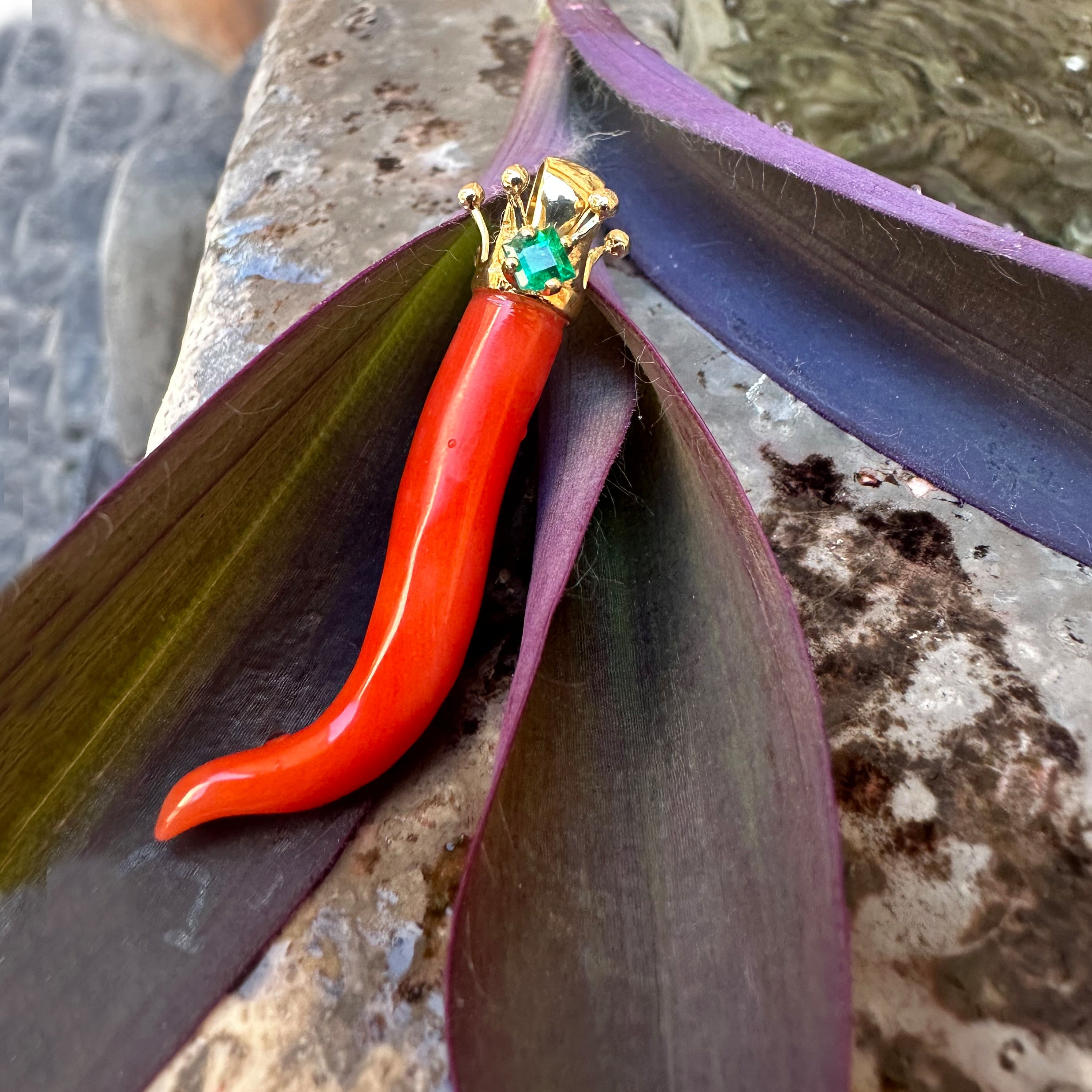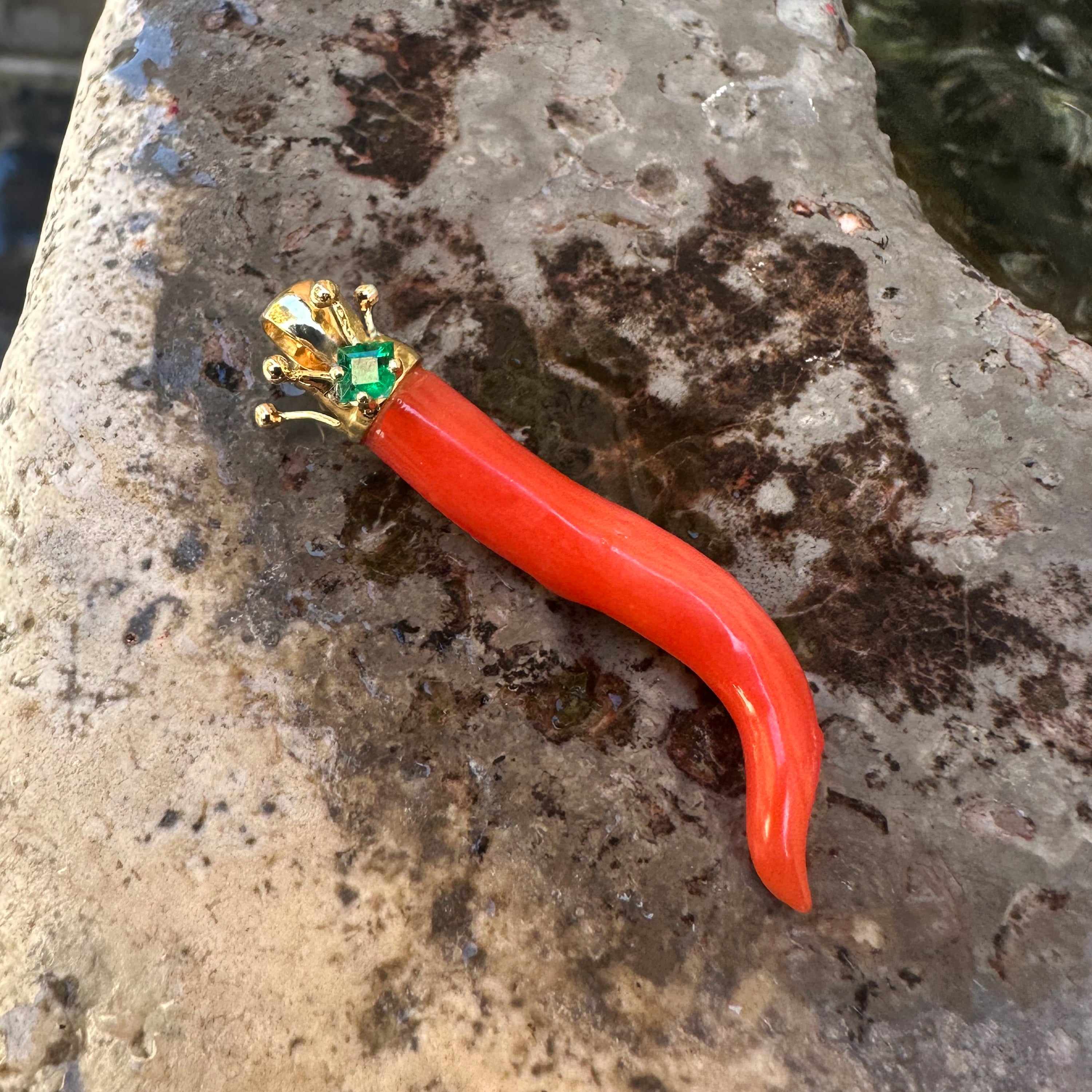Lucky horn in italian coral, with 18 Kt gold crown and an Emerald