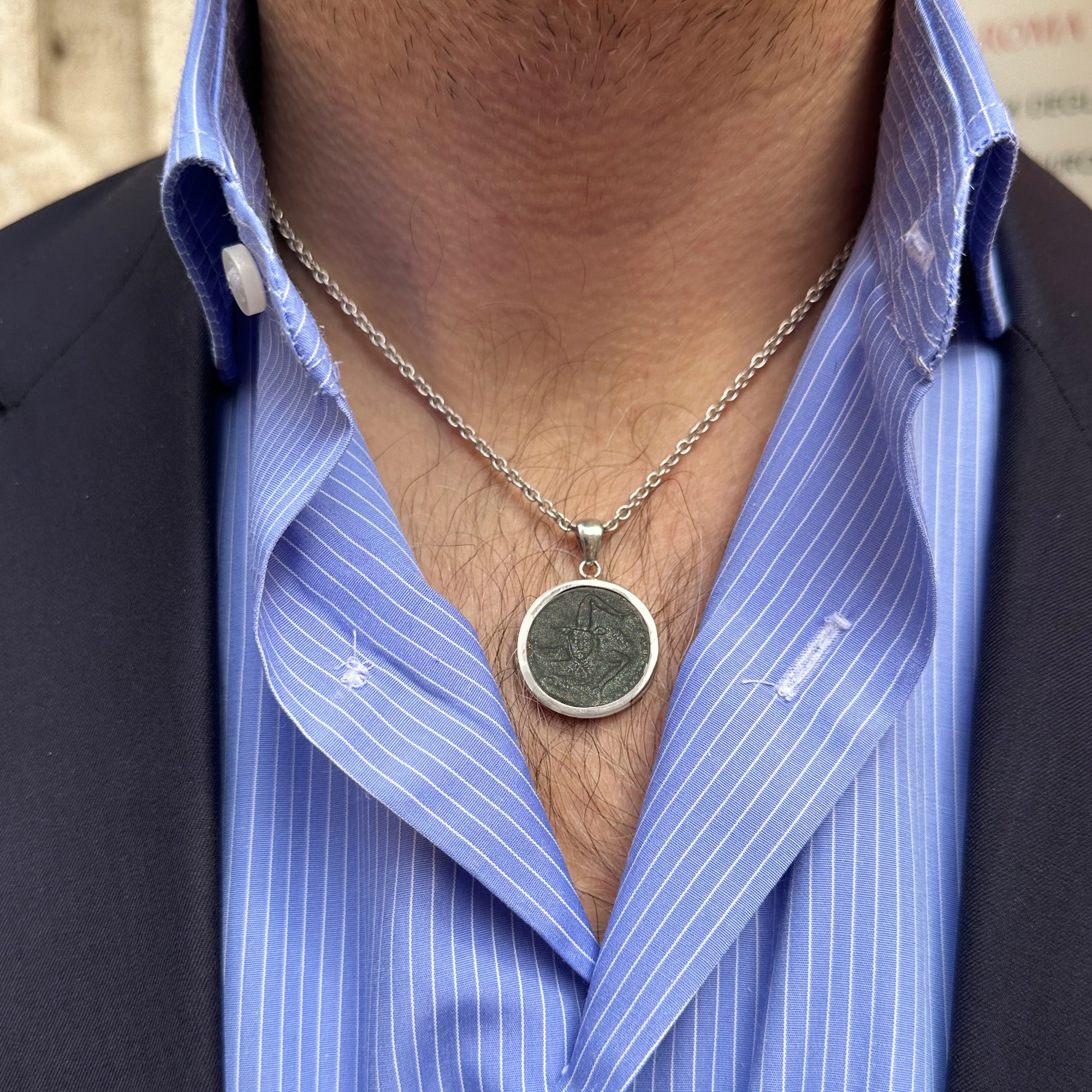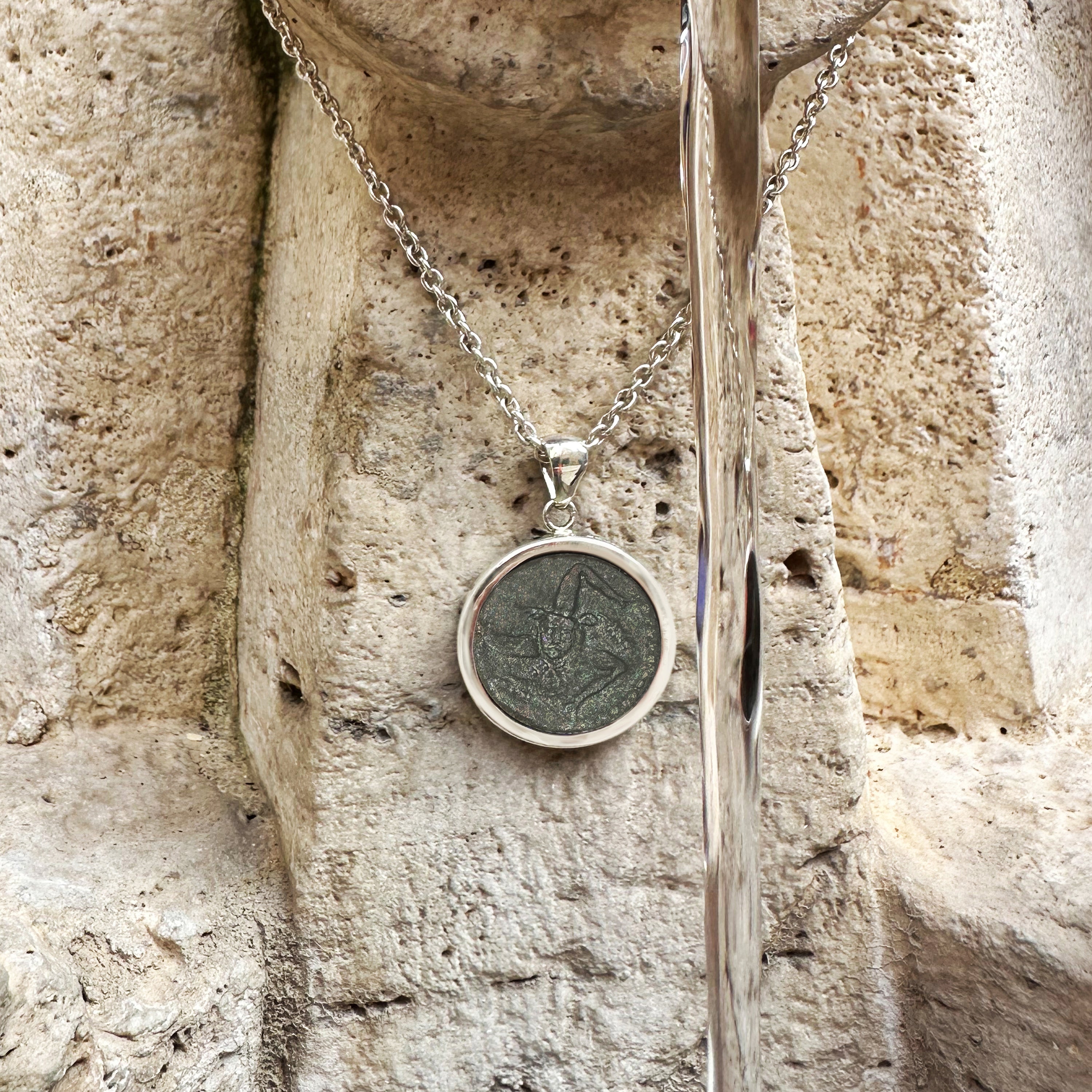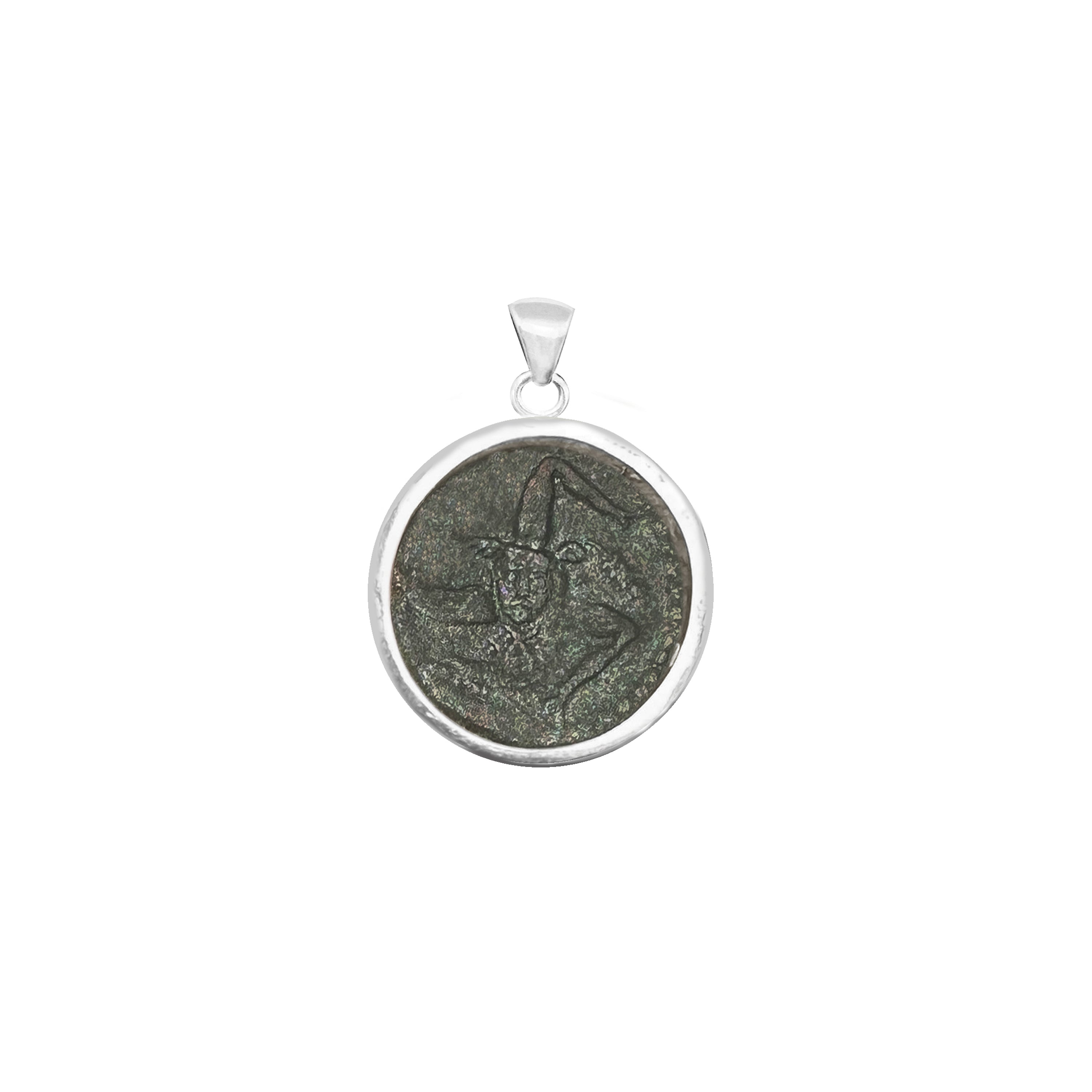 This sterling silver pendant contains an authentic coin dating back to the 3rd century BC, originating from Panormus, the modern-day city of Palermo. The coin features a triskelion, a symbol consisting of three legs radiating from a central point, and on the reverse side, the head of Athena.