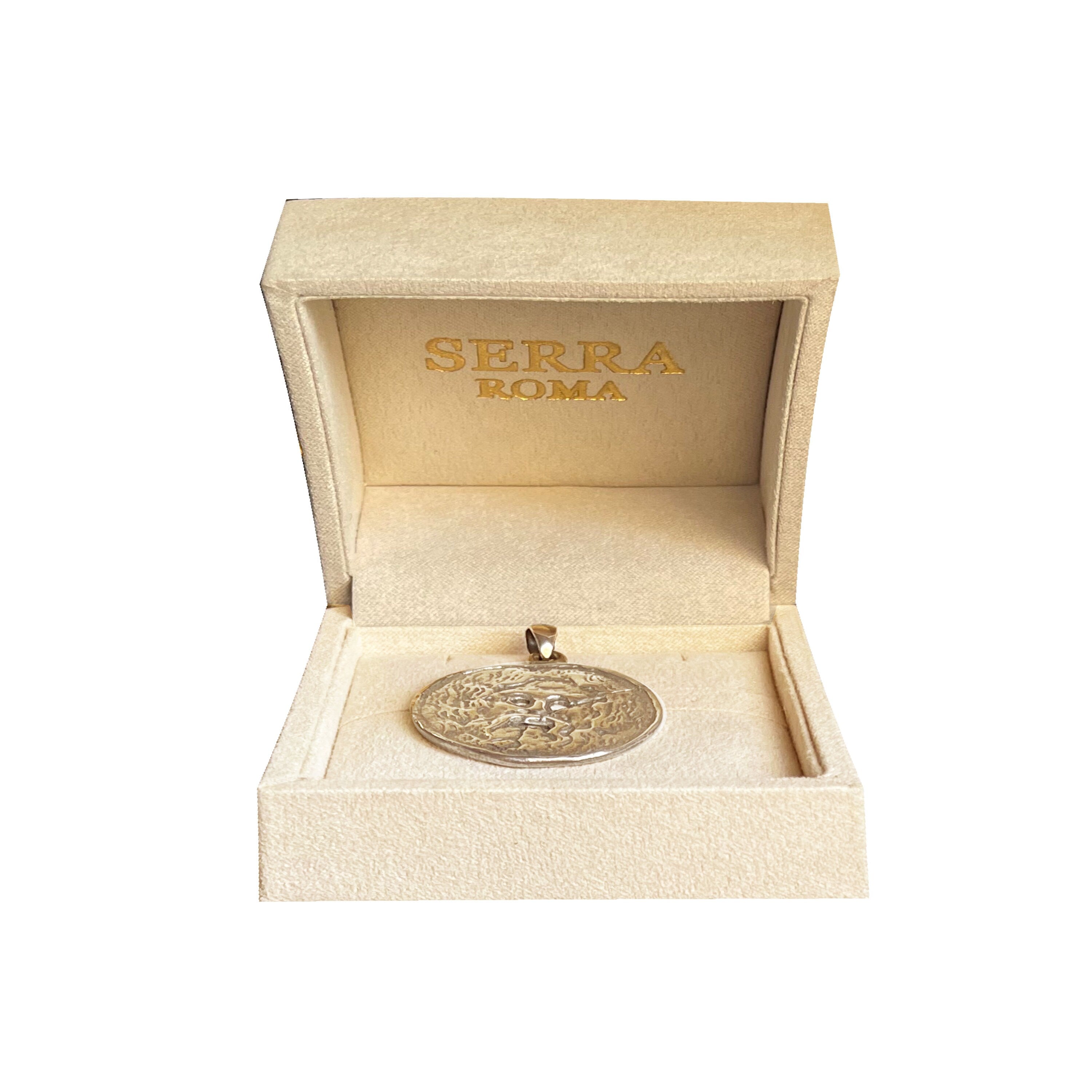 This sterling silver pendant depicts the pavonazzetto marble mask that was walled up in the Pronaos of Santa Maria in Cosmedin in 1632, known as the “Mouth of Truth.” While no one is exactly sure when or why the frieze was created, there are a number of theories.