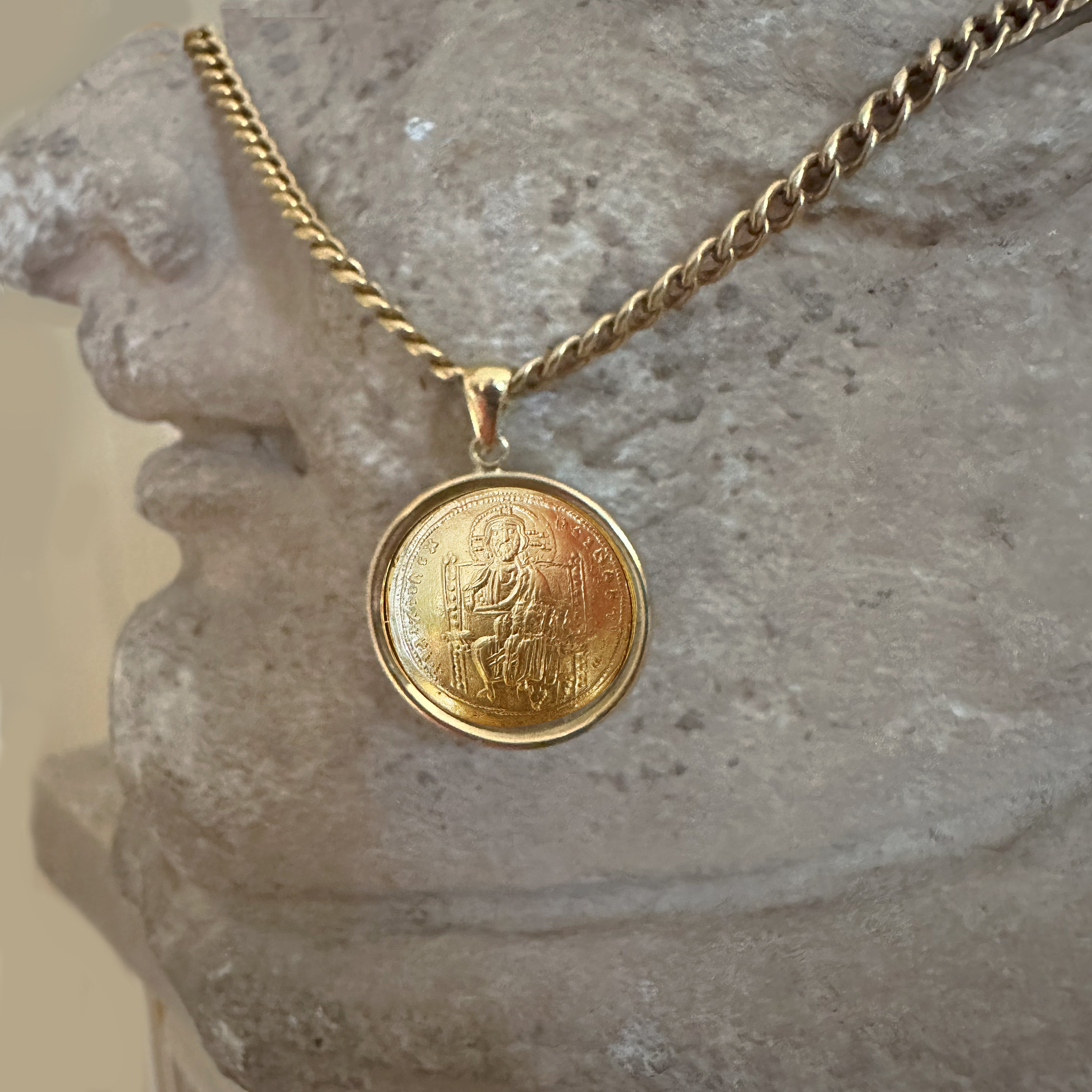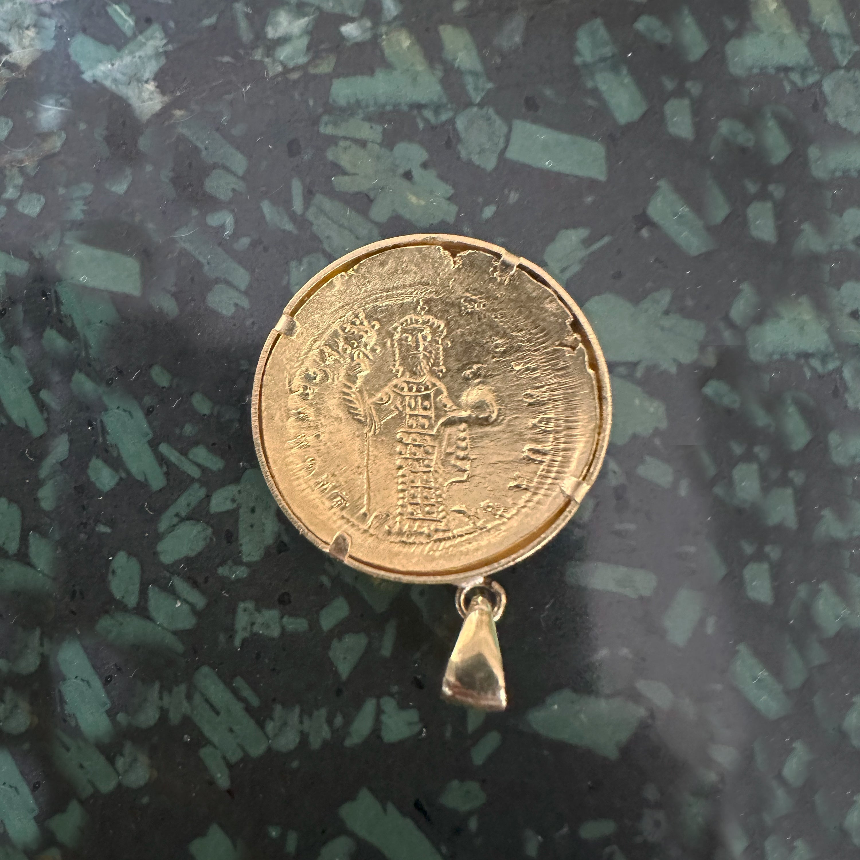 An authentic Byzantine 24kt gold coin - Histamenon - (1068-1071 AD) is set in this beautiful 18kt Gold pendant, depicting Christ crowning Emperor Romanus IV and Eudocia on the front. On the rear, we can see Michael VII, Constantius, and Andronicus.