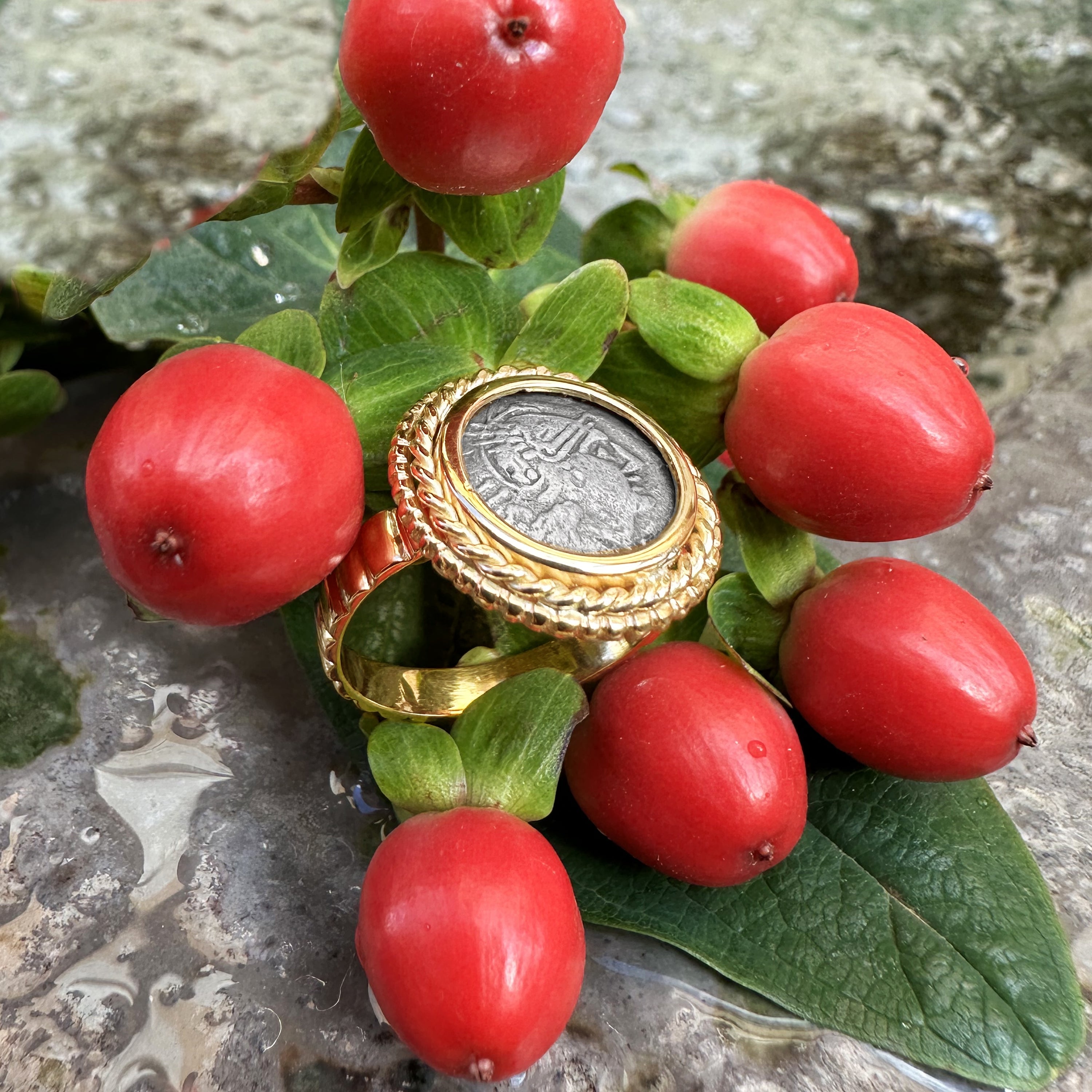 This stunning 18 kt gold ring showcases an authentic silver Roman coin, specifically a sestertius from 211 BC, featuring a depiction of the Goddess Rome. Meticulously crafted, this ring is a testament to artistic skill and attention to detail. The goddess Rome held significant importance in ancient Roman religion, symbolizing the city of Rome and the Roman state. Her representation on coins, sculptures, and architectural designs conveyed Roman political and religious ideals.