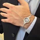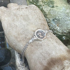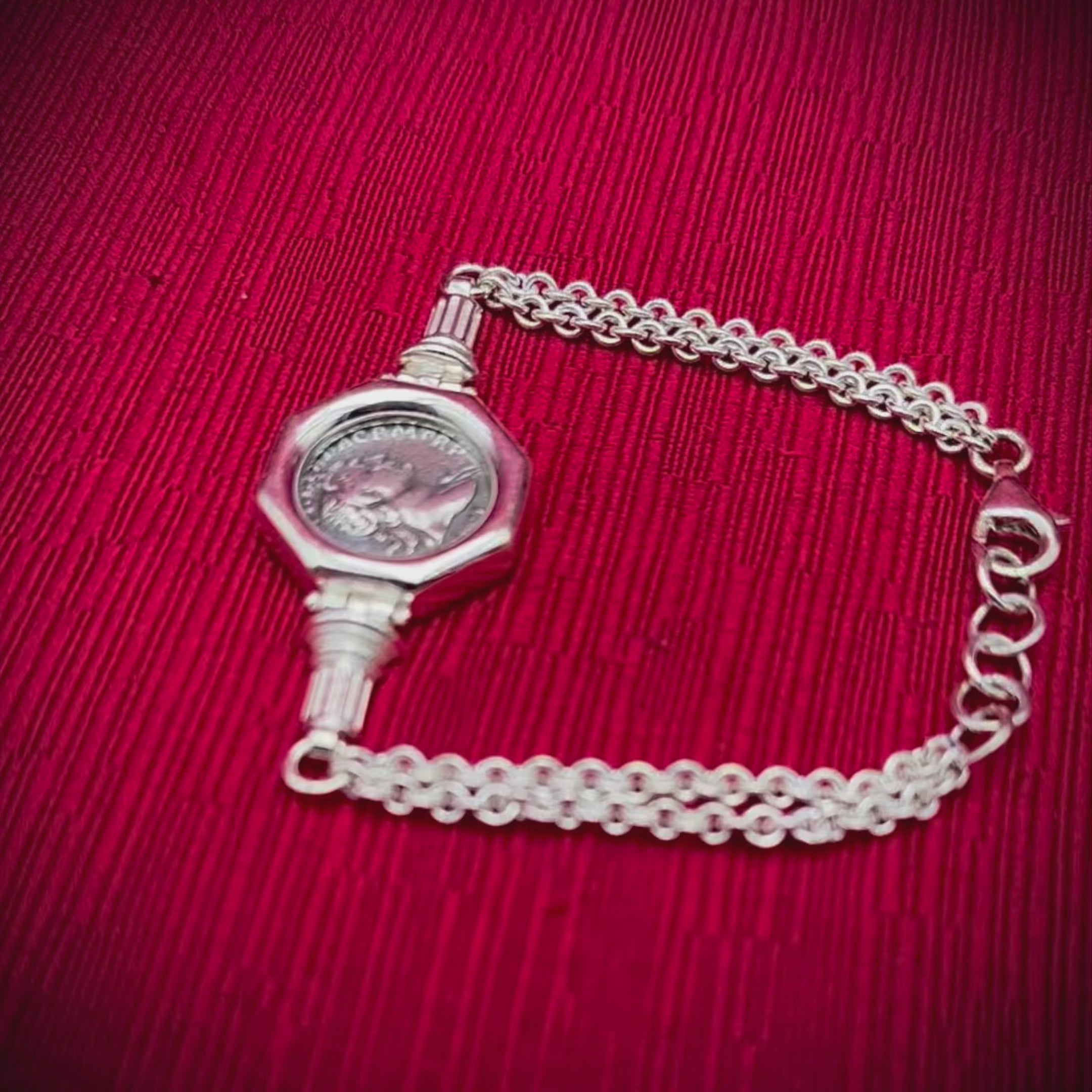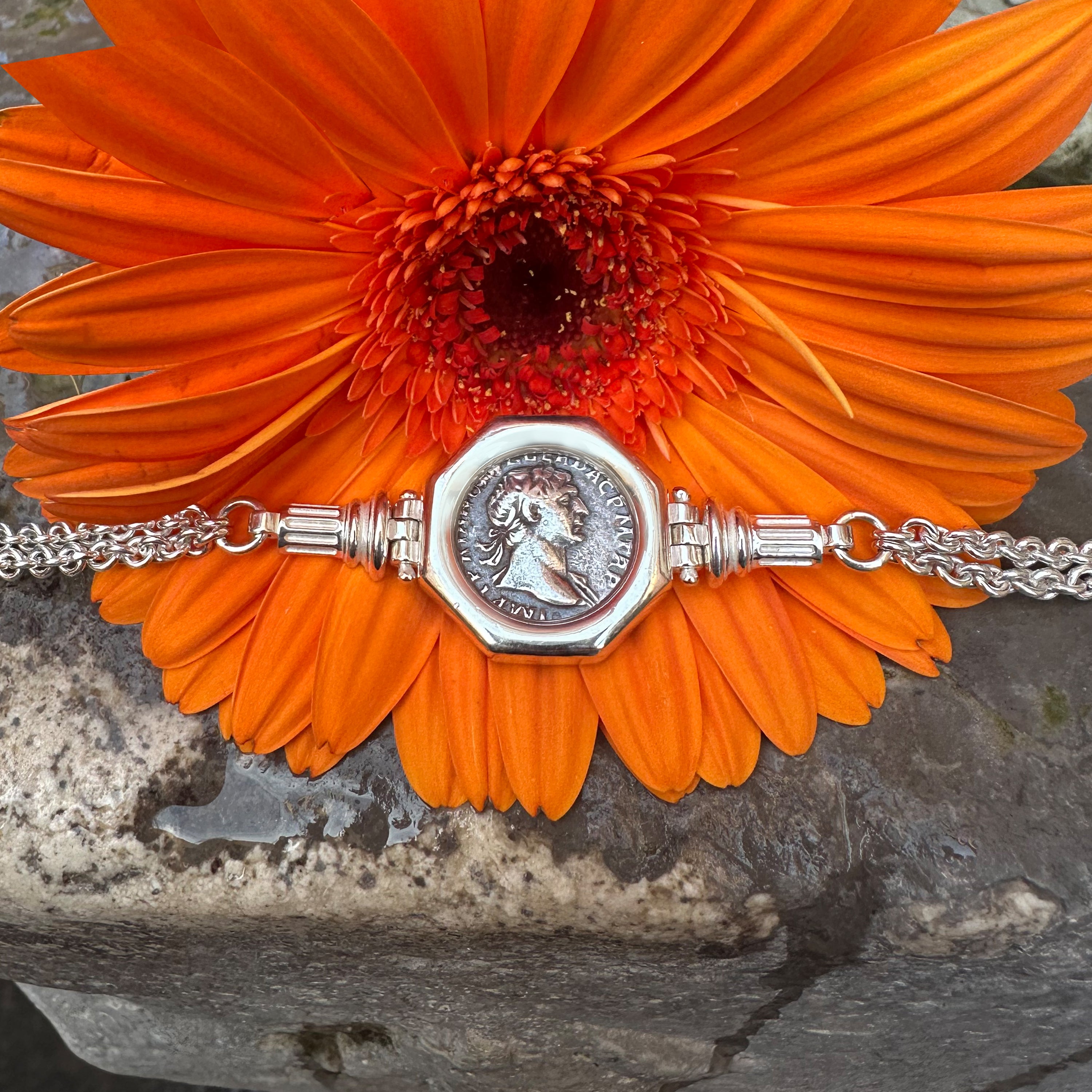 An authentic Roman silver denarius from the 2nd century AD, depicting the Emperor Trajan, has been set in this sterling silver bracelet, handcrafted by our skilled goldsmiths. The denarius is framed elegantly, with two graceful columns adorning its sides, symbolizing the architectural grandeur of ancient Rome. The reverse side features the Goddess Felicitas, embodying good fortune, prosperity, and the favor of the gods—a fitting emblem for a coin issued during one of the Roman Empire's most celebrated reigns.