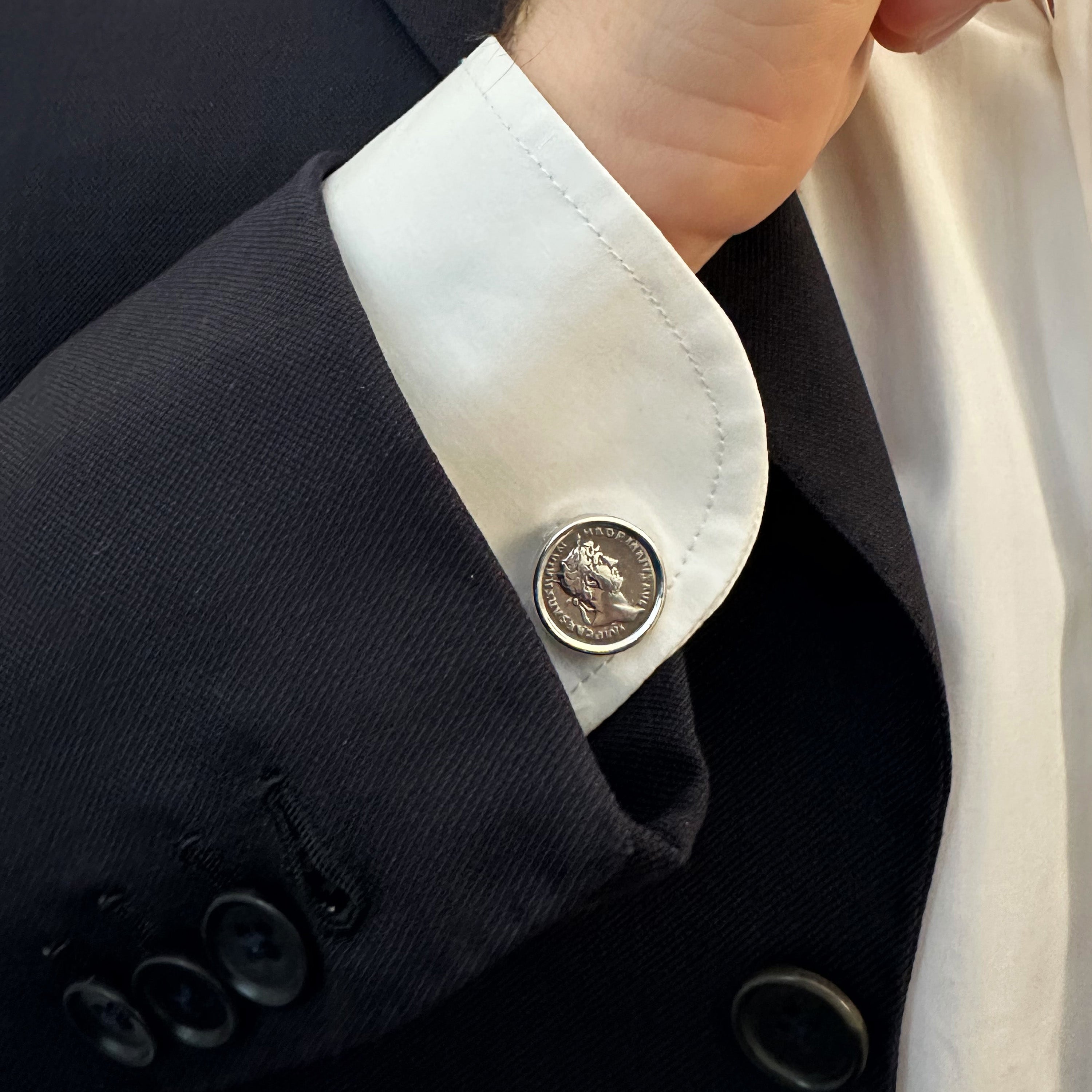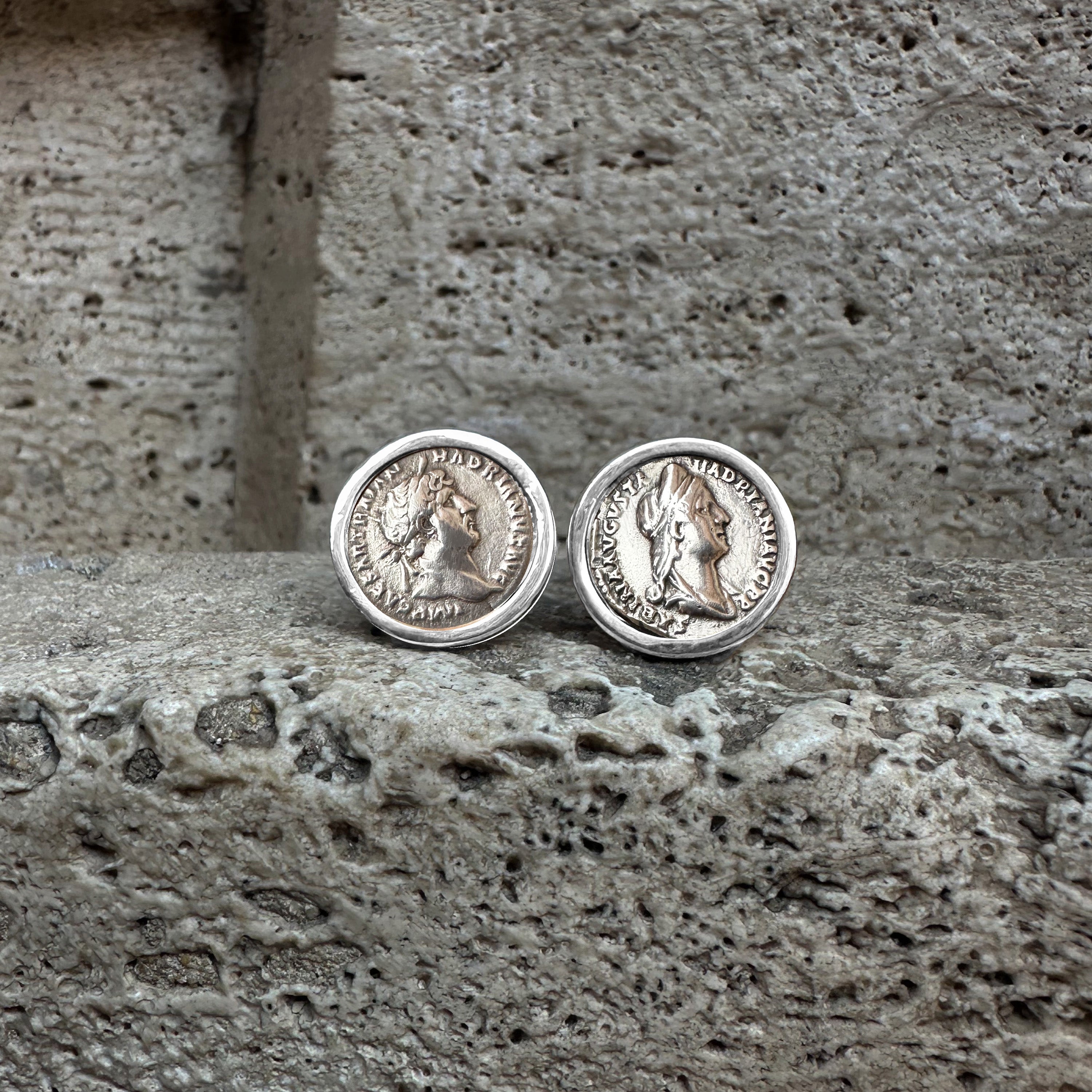 These sterling silver cufflinks were designed by me and handcrafted by the artisans at my shop, SERRA. Established in 1910, SERRA is located at Via Margutta 57 in the historic heart of Rome, just a stone's throw from the Spanish Steps! Each cufflink features an authentic Roman coin depicting Emperor Hadrian and his wife, Sabina.