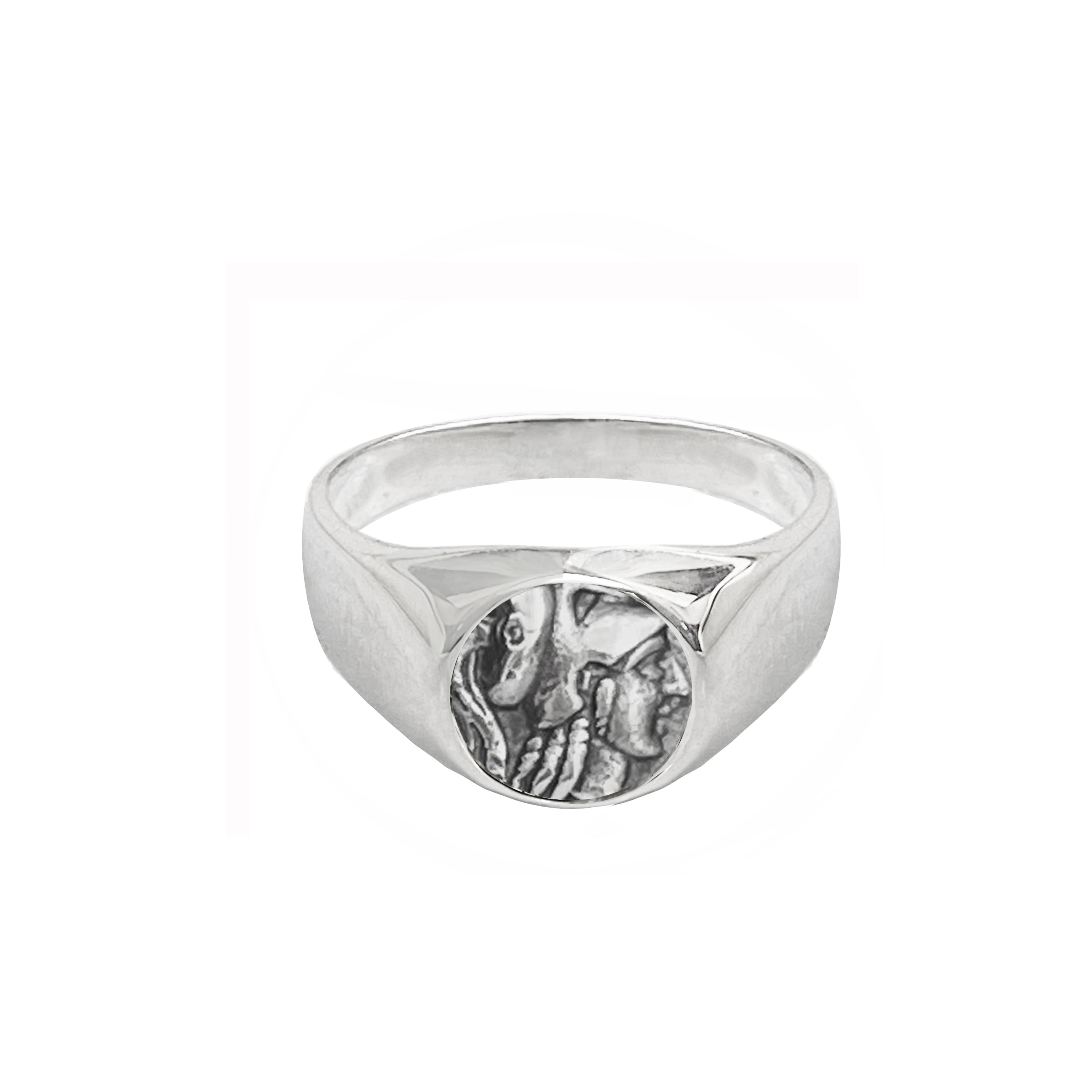 This sterling silver ring has been set with an authentic silver coin from the 4th century BC, minted by Alexander the Great, depicting the goddess Athena. On the back, in Greek, we see the writing "ALESSANDRO" and a lightning bolt.