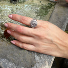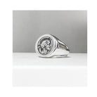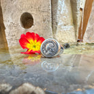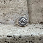 This sterling silver ring showcases an authentic Greek silver diobolus, sourced from an Athenian colony near Sybaris, founded in 443 BC. The coin's reverse side displays the image of a Bull.