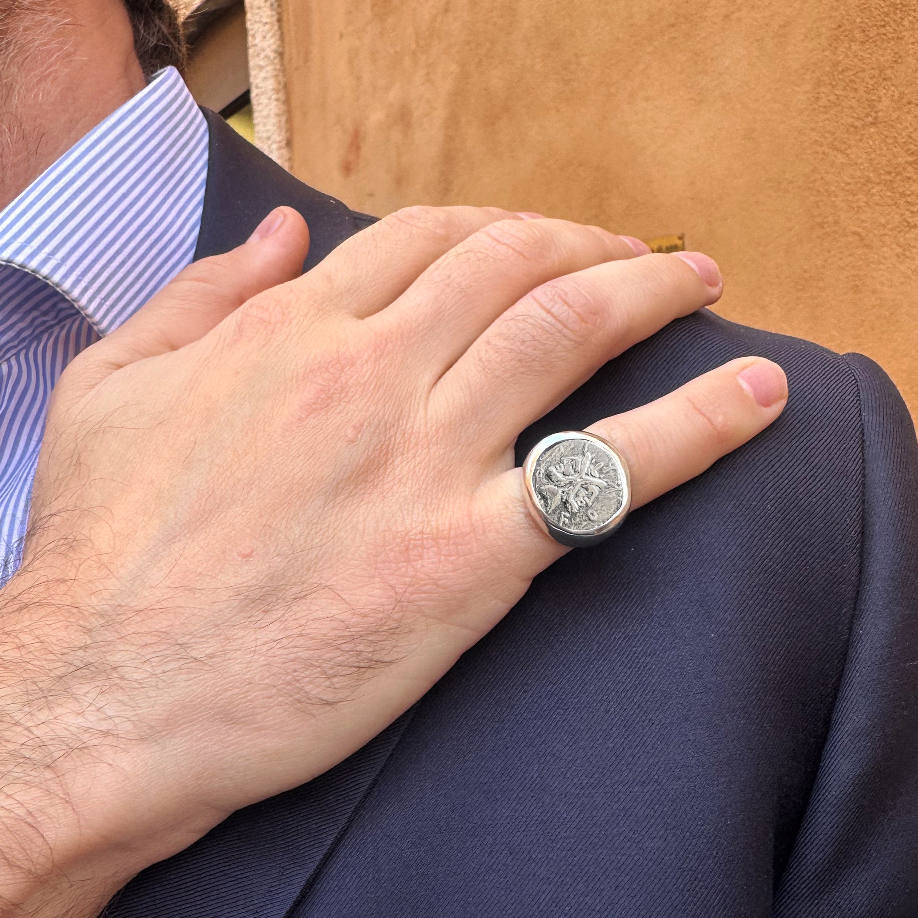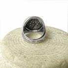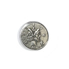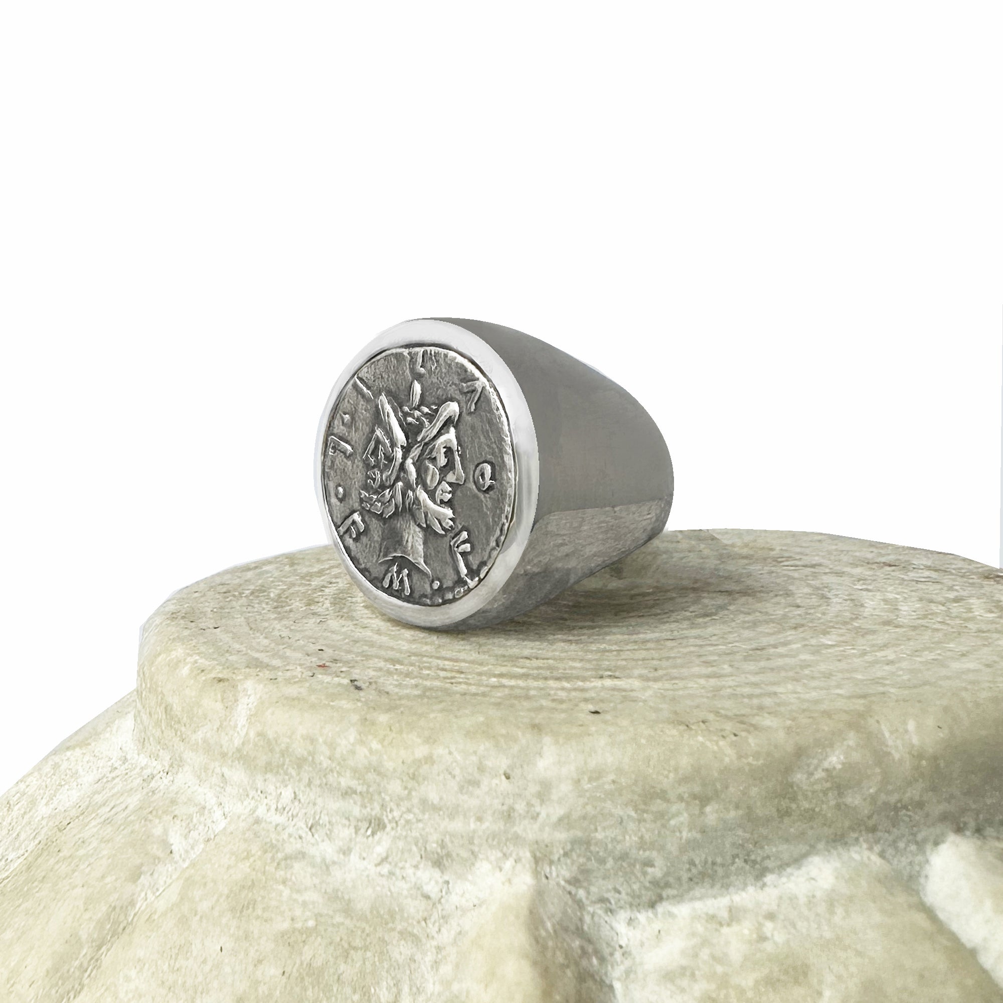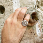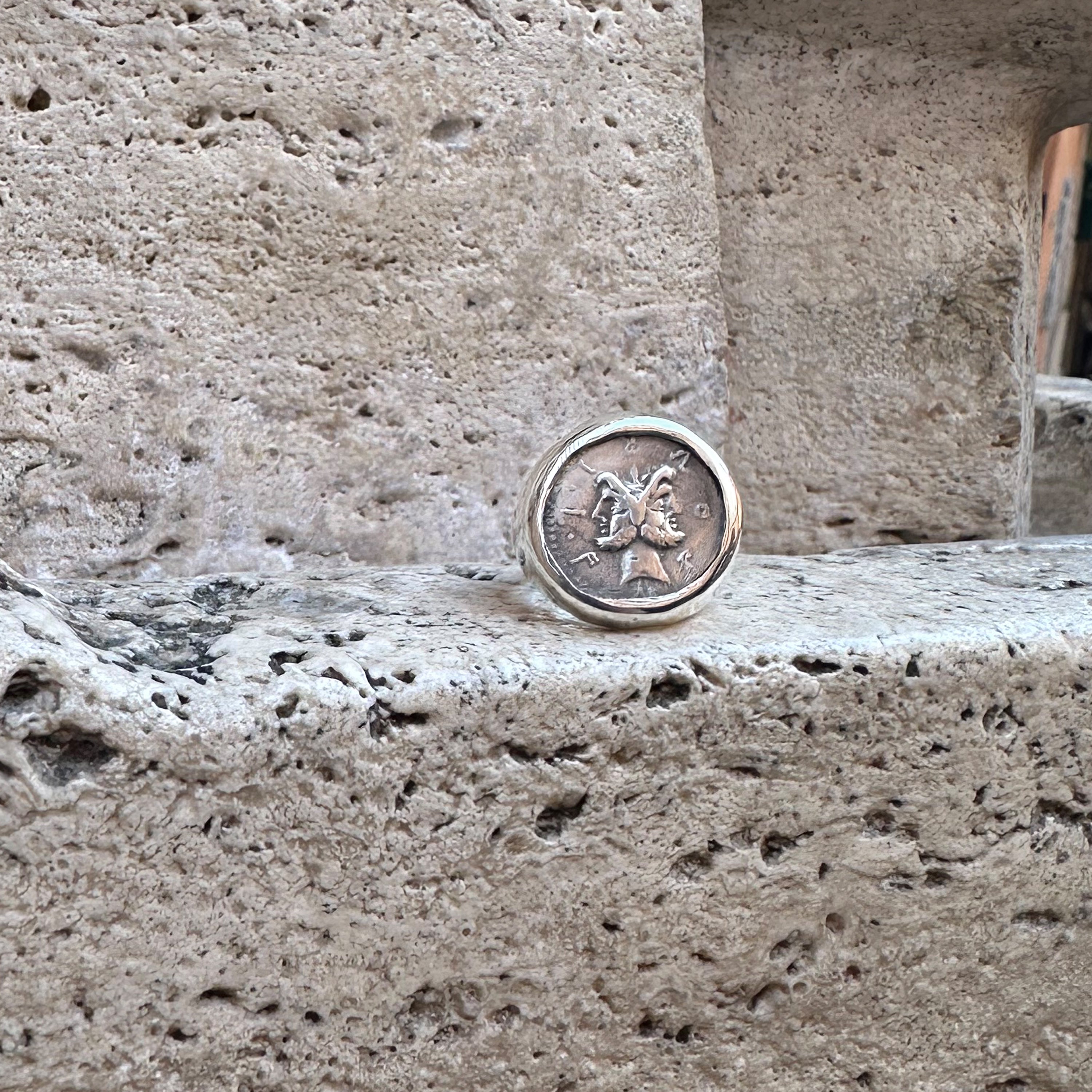This sterling silver ring showcases an authentic Roman coin from the 2nd century B.C., featuring the two-faced God Janus. On the reverse side of the coin is an image of Rome standing tall, erecting a trophy.