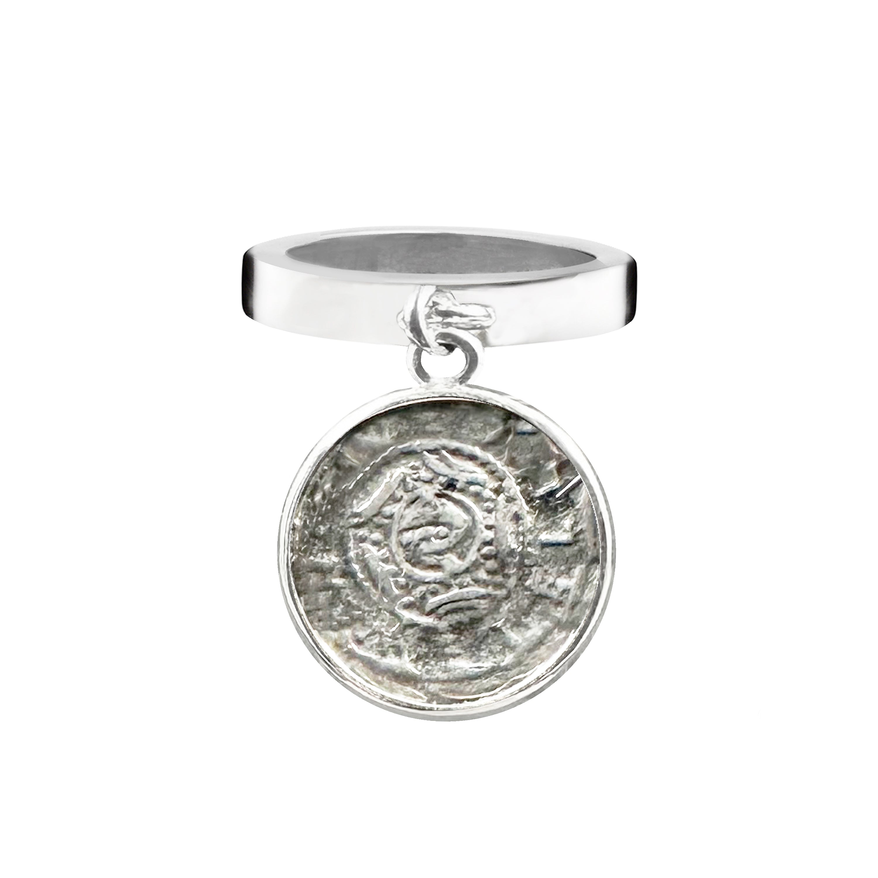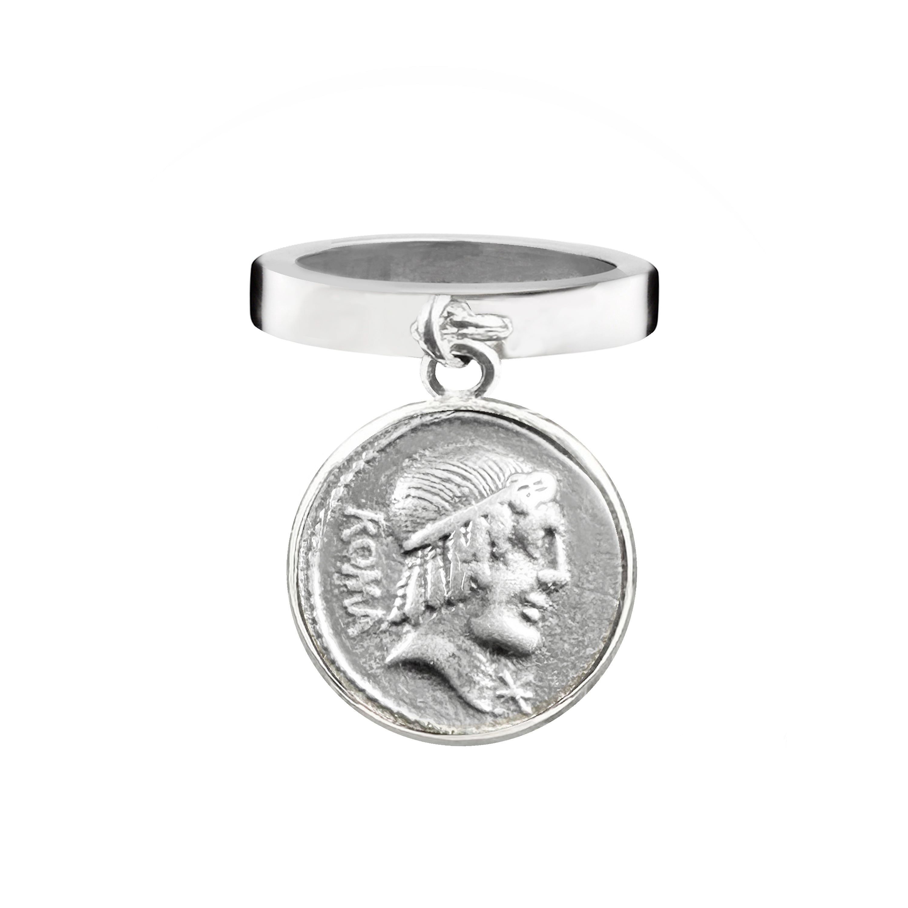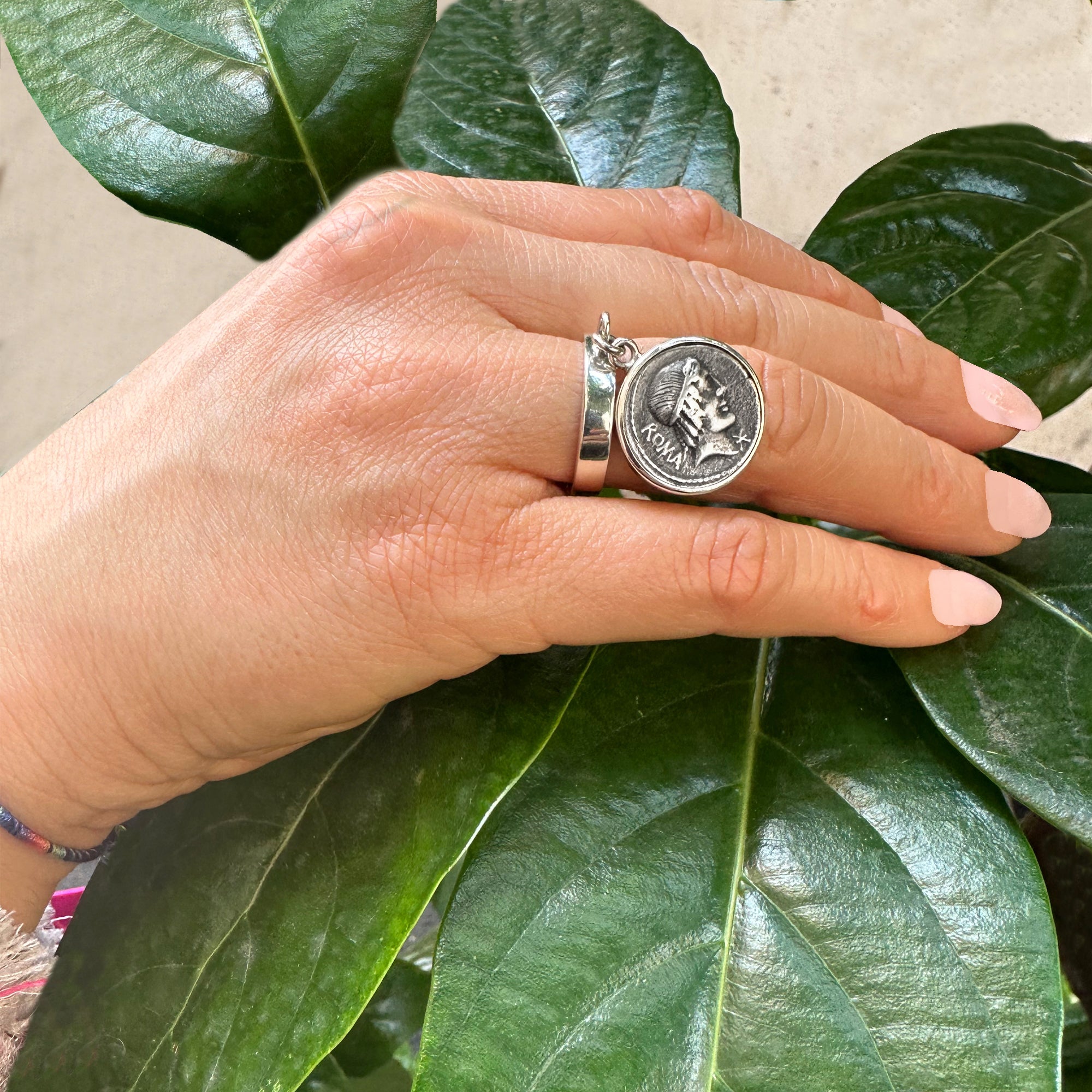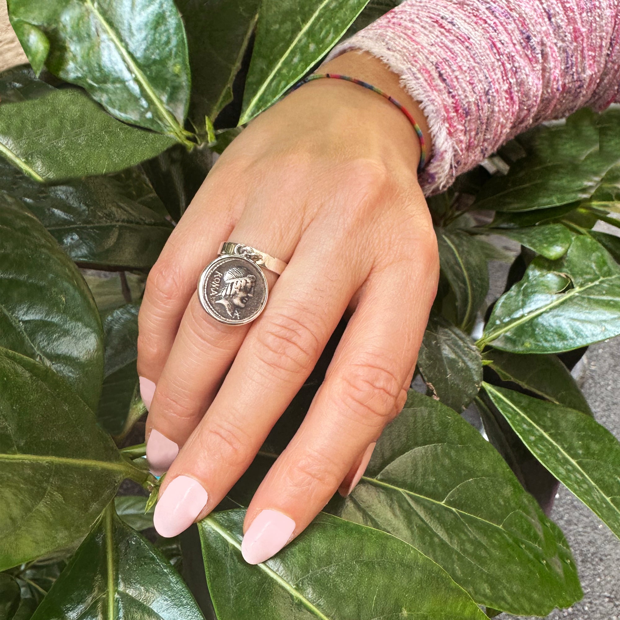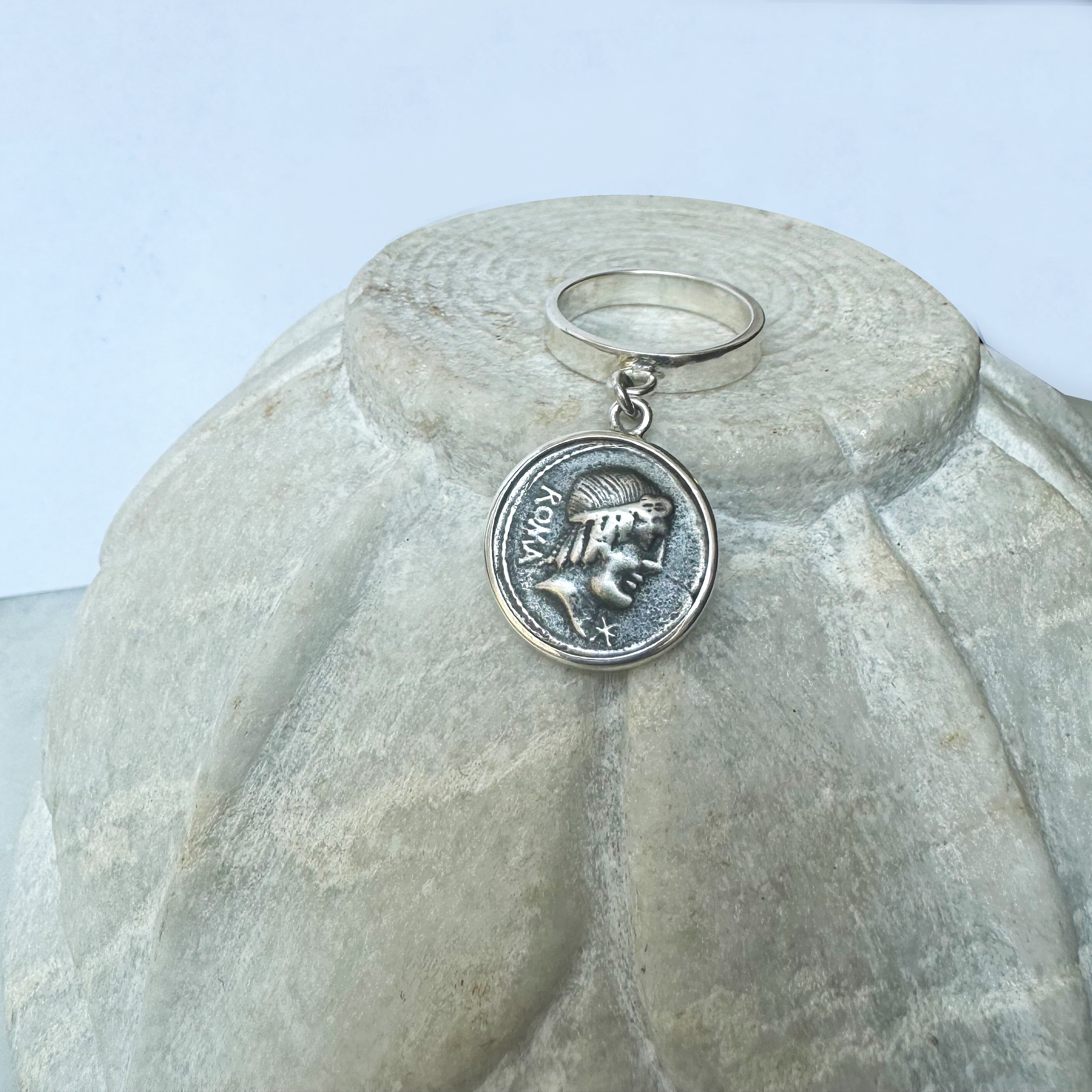 One of Apollo's most renowned attributes is his connection to the Oracle of Delphi, where individuals from far and wide across the Greek world journeyed to seek guidance and foretell their destinies. This sterling silver ring, with its Roman coin bearing Apollo's image, serves as a captivating tribute to the multifaceted and influential deity from antiquity.