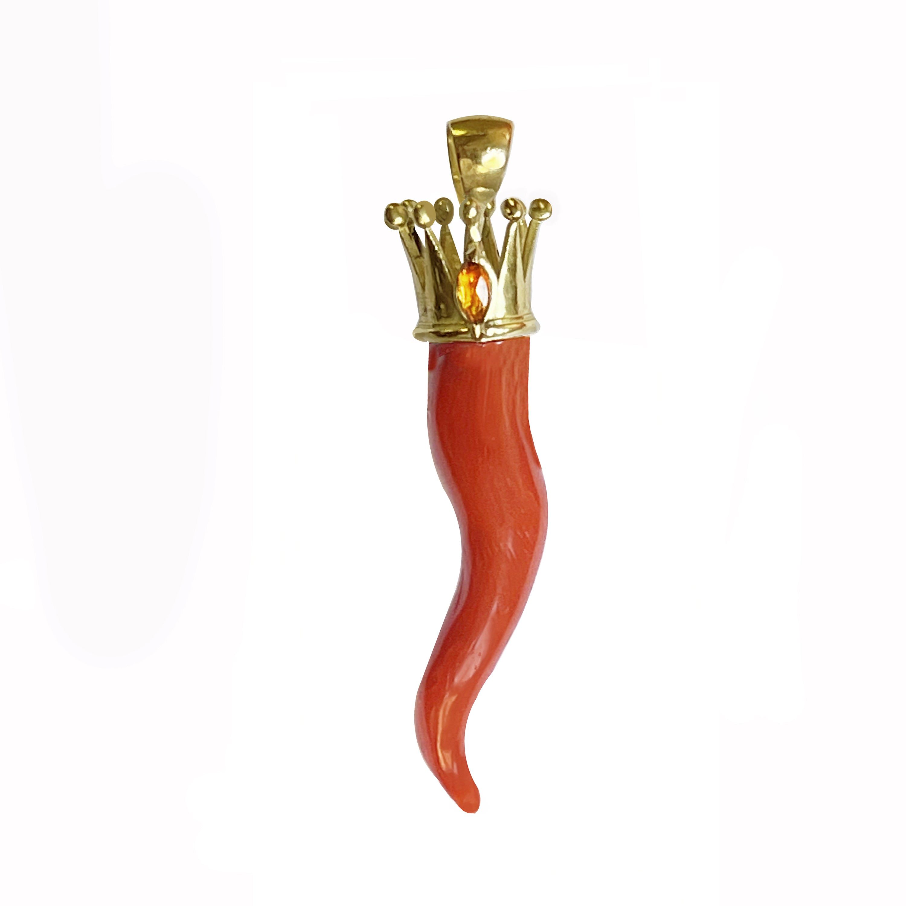 This exquisite coral and 18 Kt gold horn originates from the Italian sea and was acquired in Torre del Greco, renowned for its long-standing tradition in coral jewelry. It has been skillfully adorned with an 18 Kt gold crown and a small topaz by our expert goldsmiths. Traditionally, the coral horn is considered an amulet that brings good luck and is often given to children for protection. Many paintings from the 1500s depict children wearing a small horn or a coral branch. Notably, in Piero della Francesca's famous painting "Madonna di Senigallia" (1470, Urbino, Galleria Nazionale), Jesus is shown wearing coral.