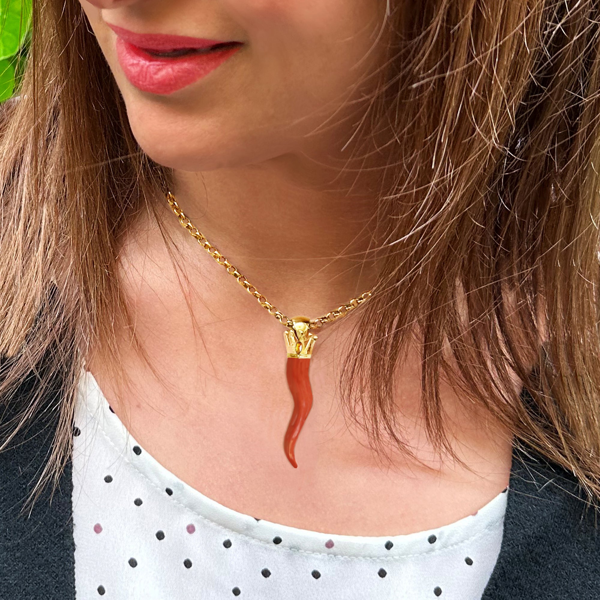 The use of the "corno" dates back to the Neolithic period around 3500 B.C. in the Mediterranean region. Ancient peoples regarded the horn as a symbol of good fortune and fertility. At that time, fertility was seen as a blessing for the community, and bull's horns symbolized male strength and virility. In ancient times, horns were also offered as votive gifts to the goddesses Venus and Luna. Red coral, often used to craft these charms, is sacred to Venus, the goddess of love. The red color and phallic shape are linked to the male fertility god Priapus. Jewelry remains a popular way to wear the horn, serving as a keepsake to pass down or a gift of luck and protection.