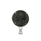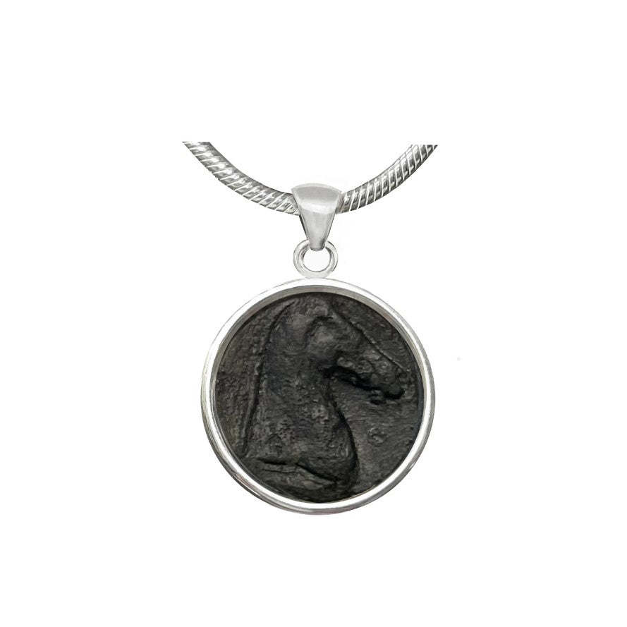 This pendant features an ancient coin from Carthage, dating back to the 4th century B.C., showcasing a horse's head on one side and the Goddess Tanit on the other.