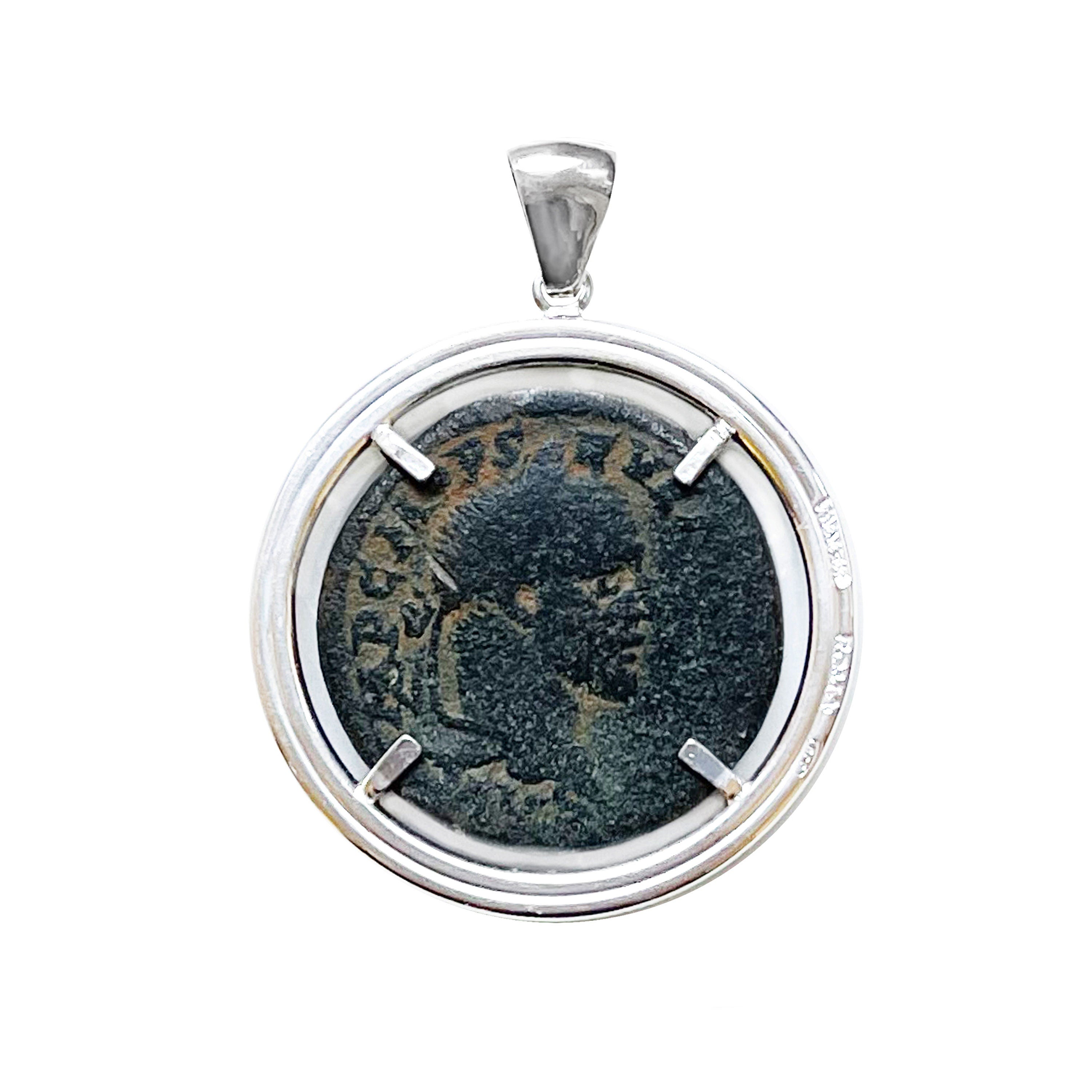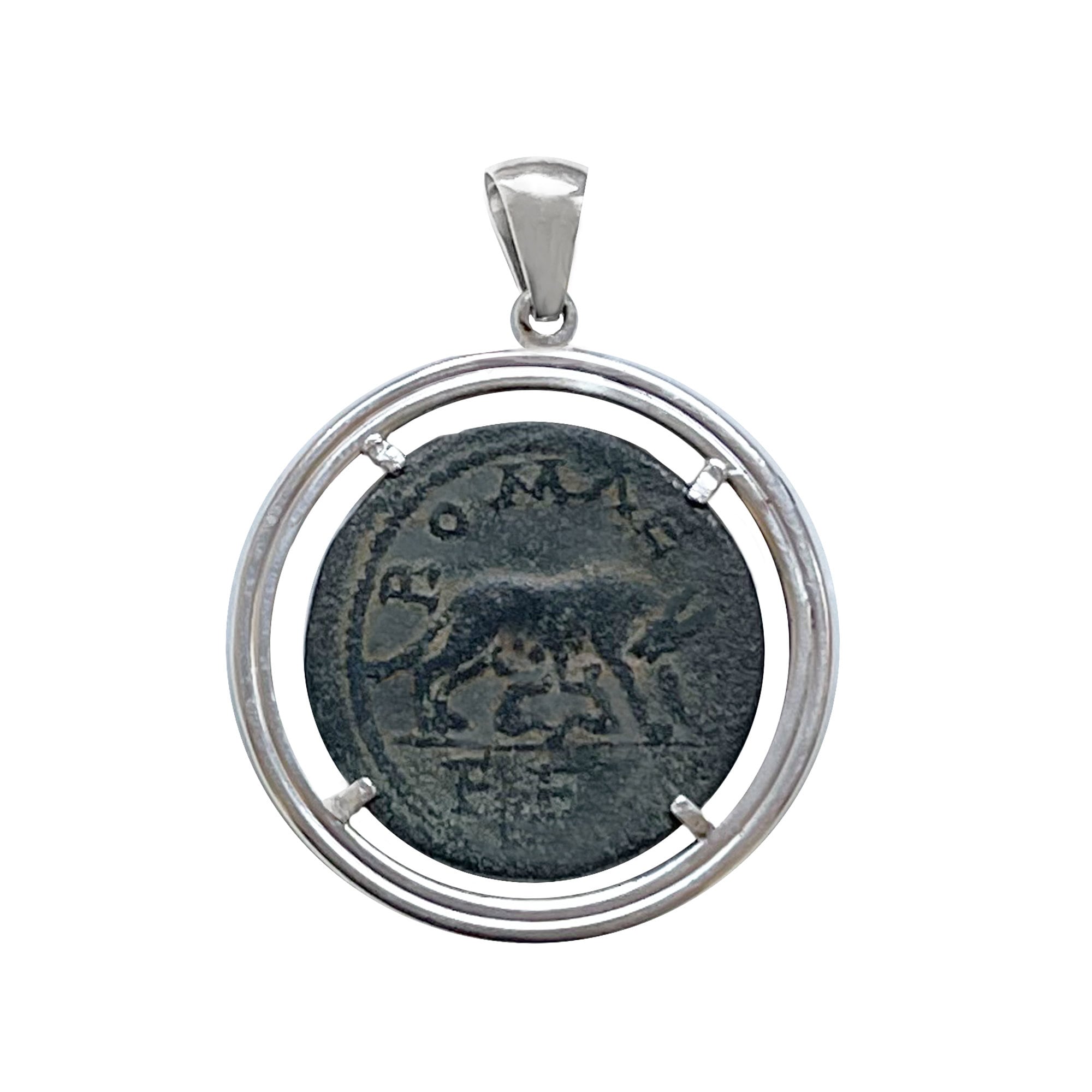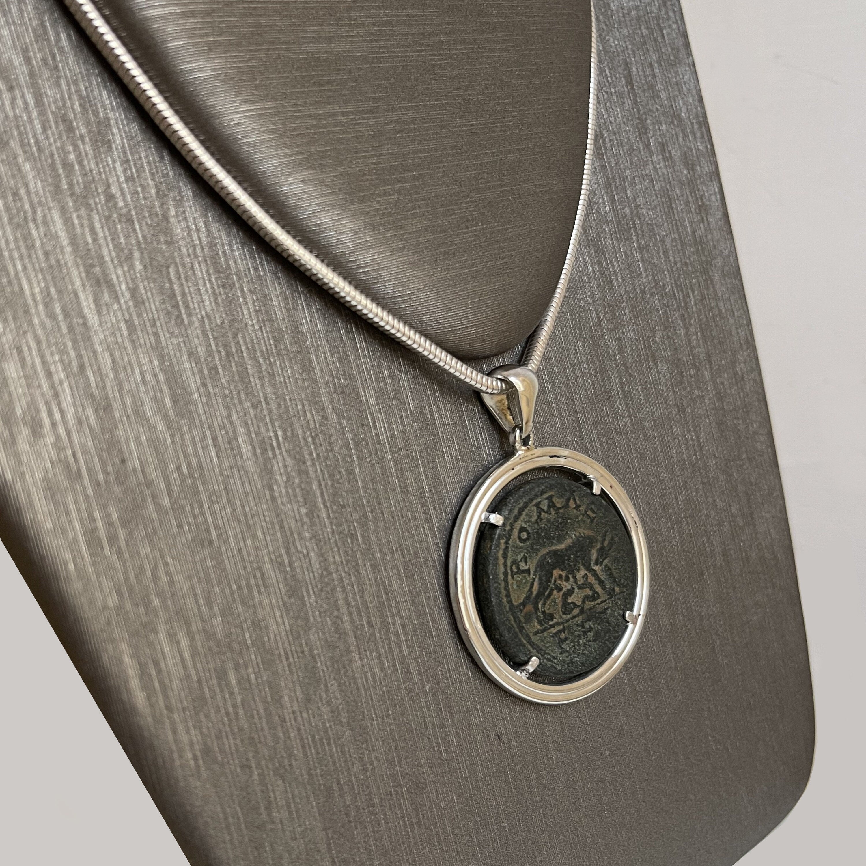 Within this sterling silver pendant rests an authentic Roman coin dating back to the 2nd century AD, depicting the iconic imagery of the She-wolf nurturing the twins Romulus and Remus. On the reverse side of the coin, the bust of Emperor Macrinus is featured.