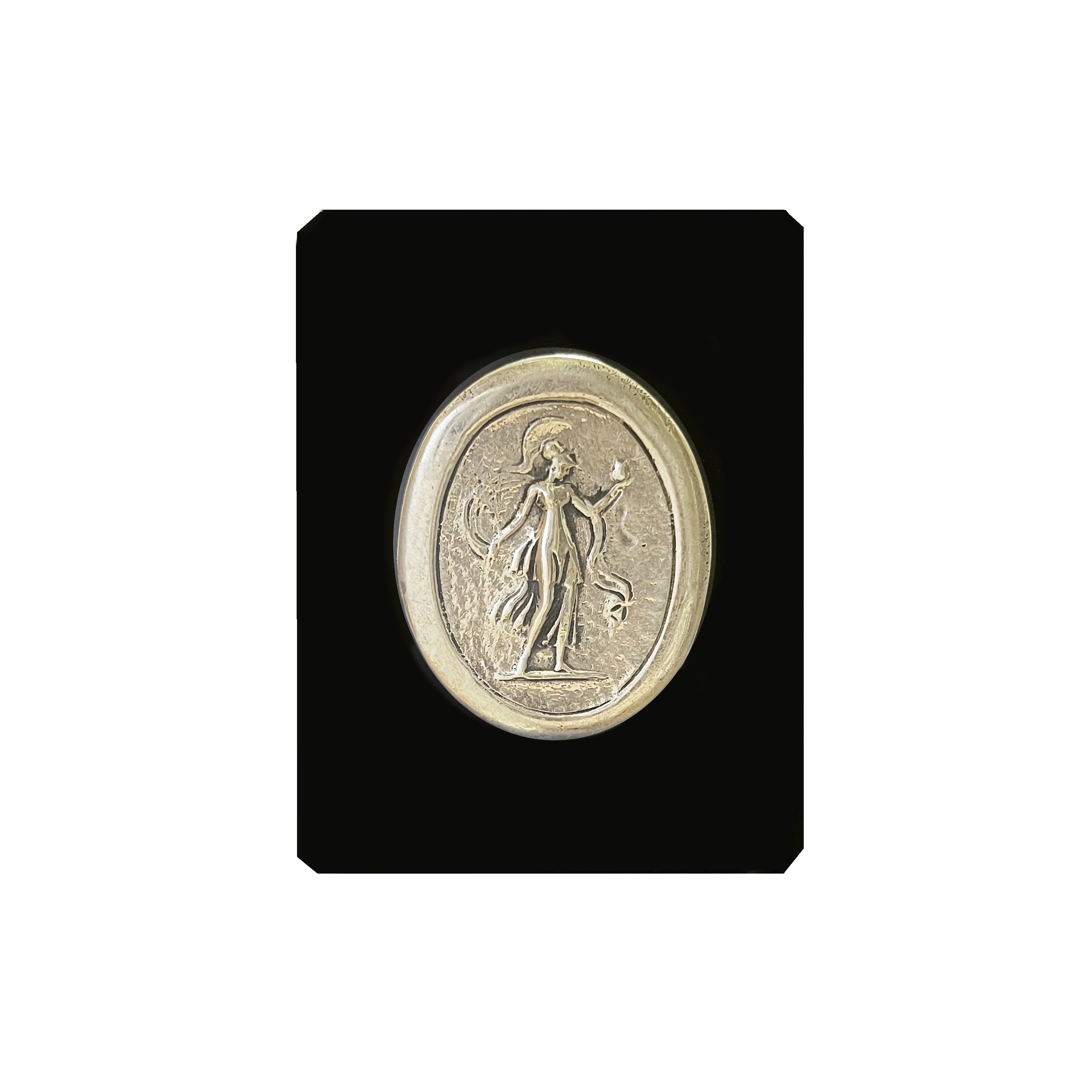 This 925 silver plaque was mounted on a fragment of Black Belgium marble, to make a paperweight. It represents the Goddess Athena with her typical attributes: the Corinthian helmet, the owl in her left hand and an olive branch, a tree sacred to Athena, in her right hand.