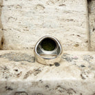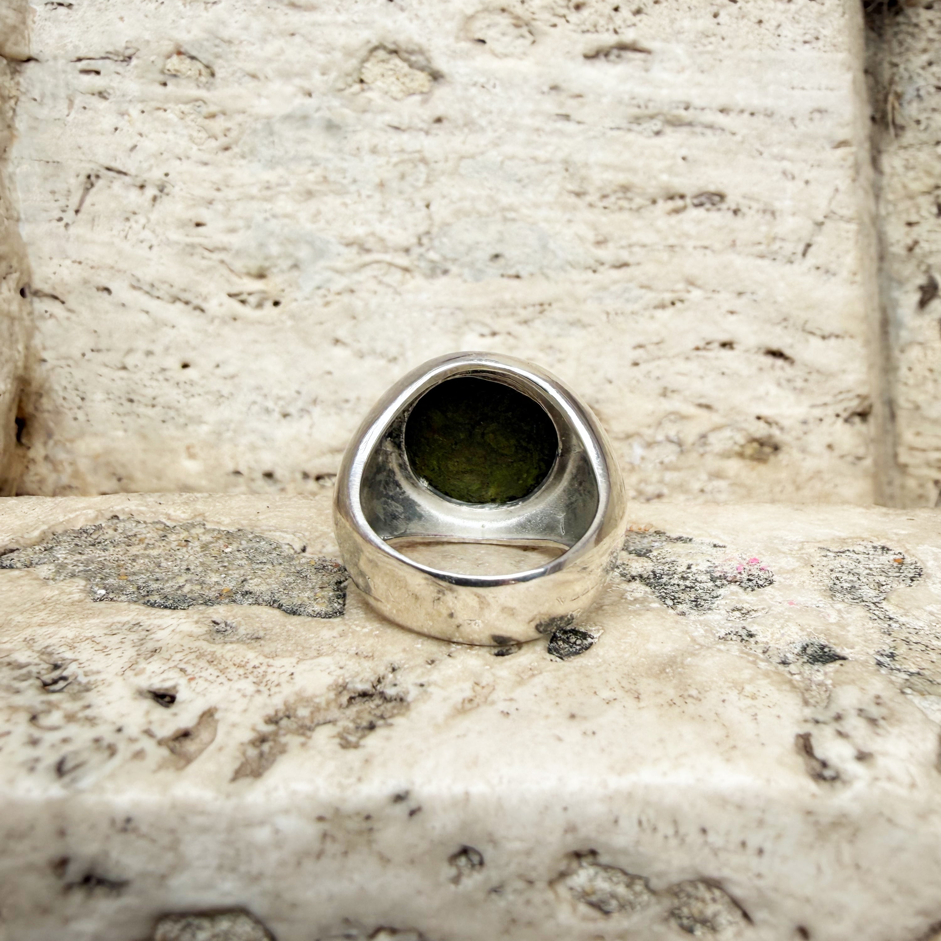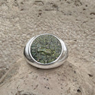 This unique ring showcases an authentic bronze Roman coin, carefully set in a handcrafted 925 sterling silver band. On the front, the coin features the dextrarum iunctio, the iconic joining of two right hands—a timeless symbol of love, friendship, and marital bonds. The reverse bears the mark “SC” (Senatus Consulto), signifying its issuance under the authority of the Roman Senate, adding historical authenticity and significance.