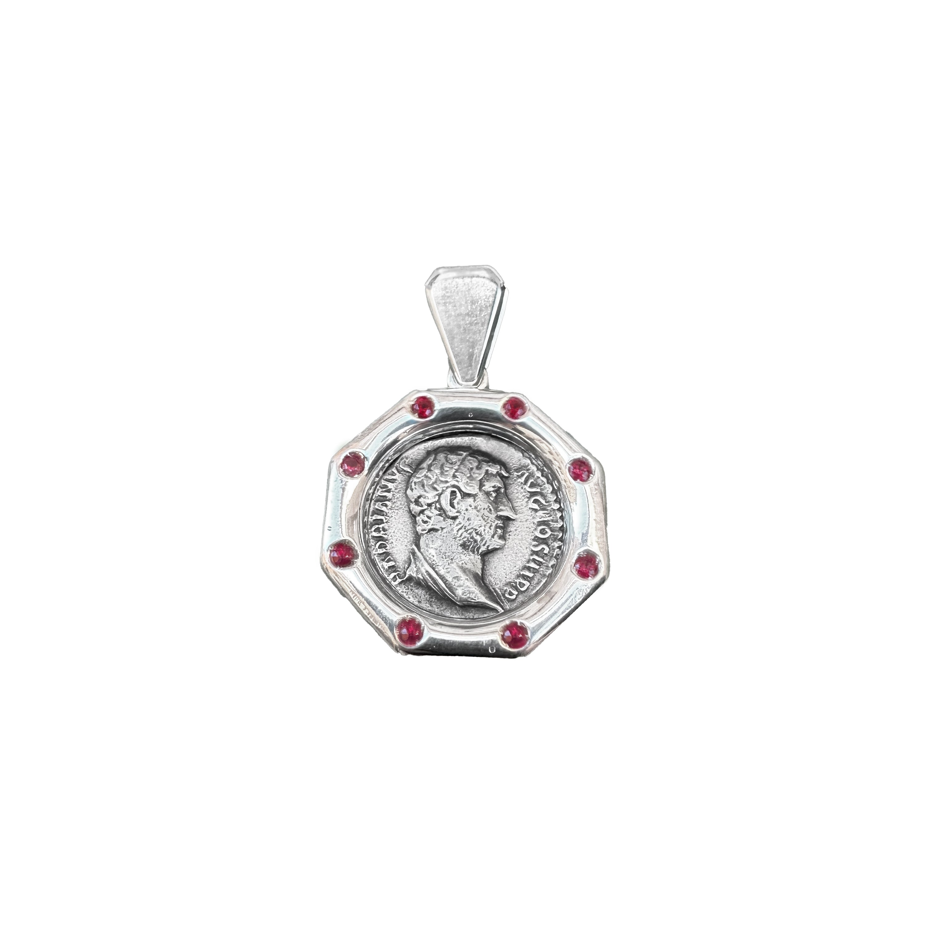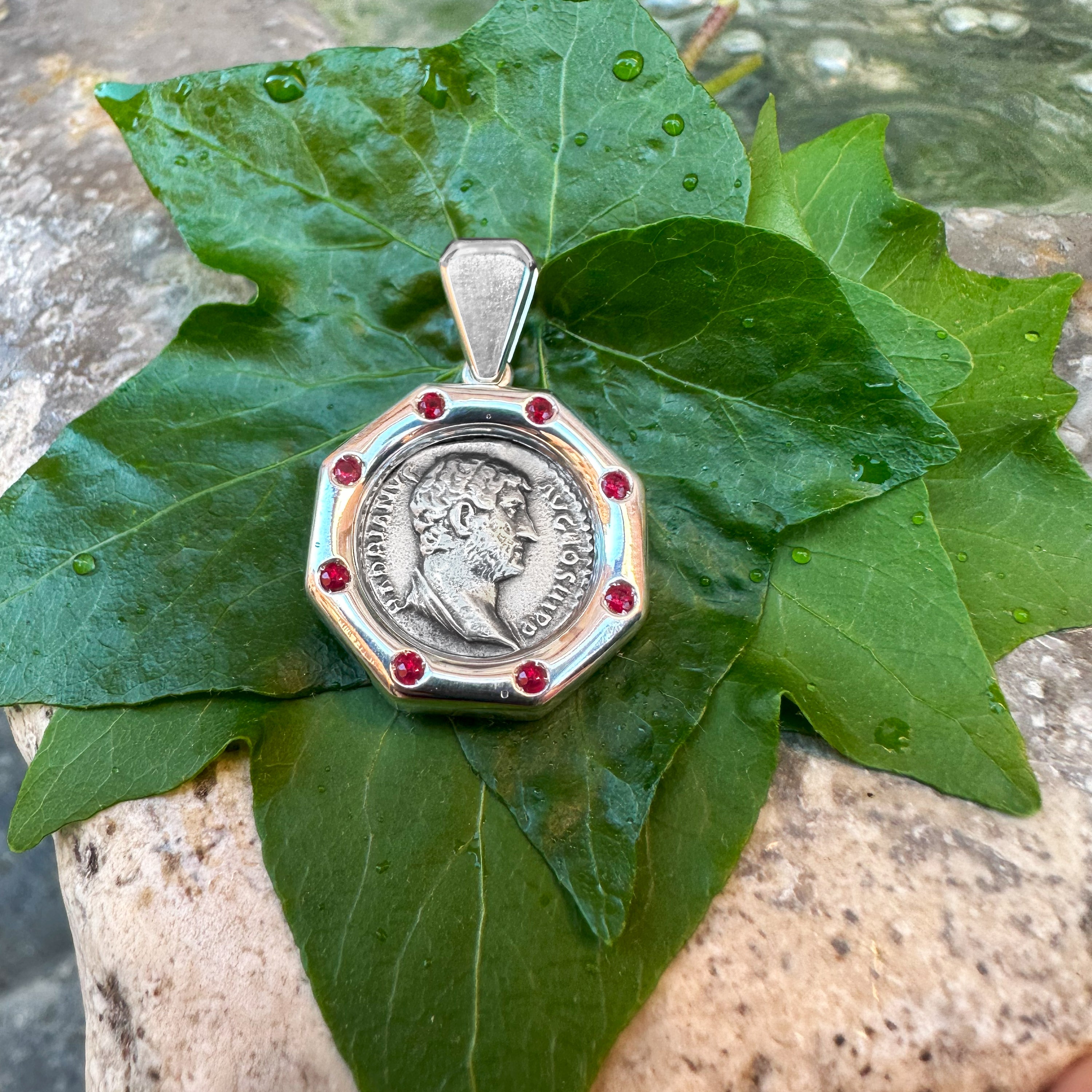 EMPEROR HADRIAN Genuine Ancient Roman coin 2nd cent. AD Pendant adorned with 8 Rubies 0,60 KT