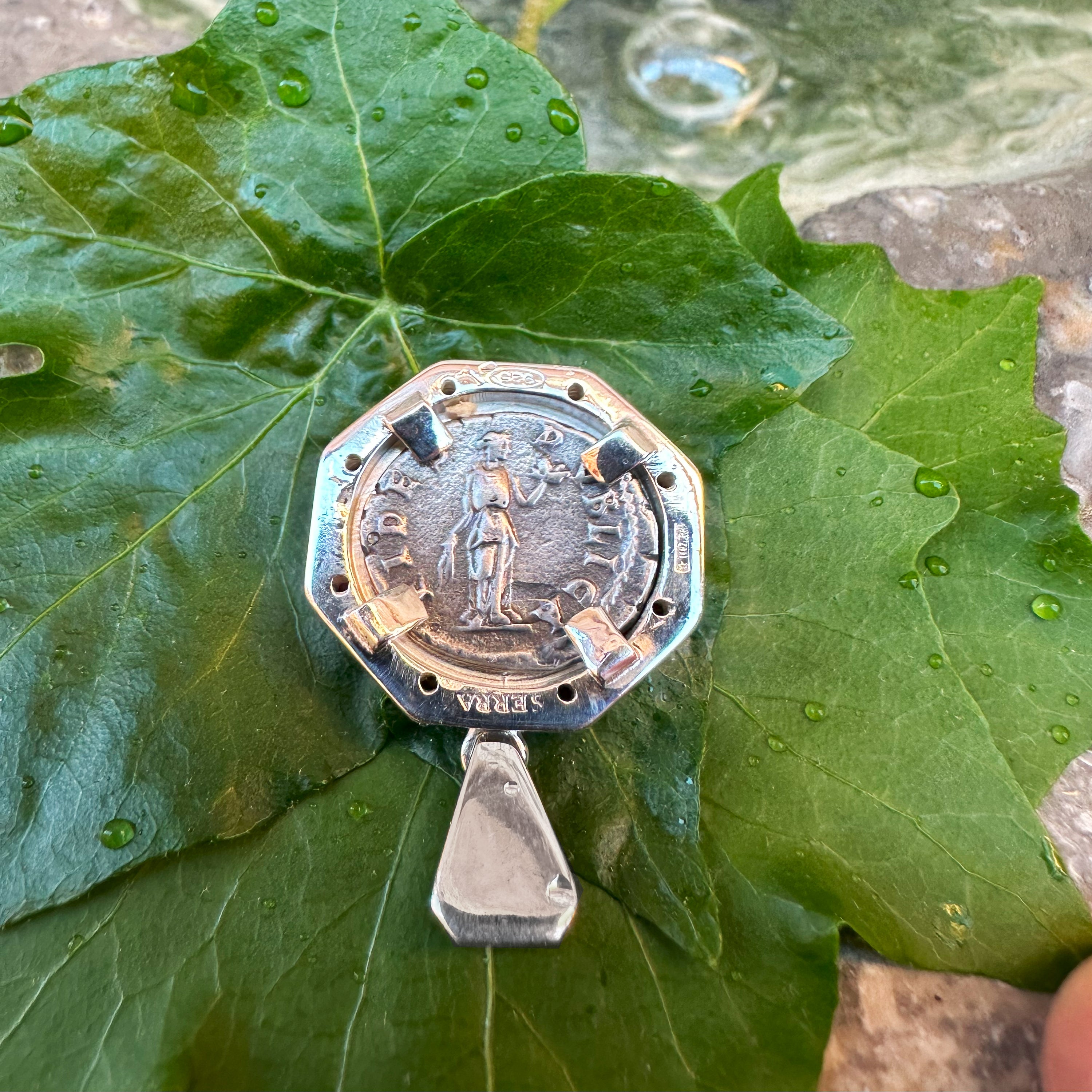 This sterling silver pendant holds an authentic Roman coin dating back to the 2nd century AD, depicting Emperor Hadrian, surrounded by 8 Rubies totaling 0.60 KT. The reverse side features the goddess Fides, the divine personification of trust and loyalty in Ancient Roman religion. Fides was a key virtue in Roman society and especially revered within the Imperial Cult as a symbol of the emperor’s fidelity to the Roman people and the gods.