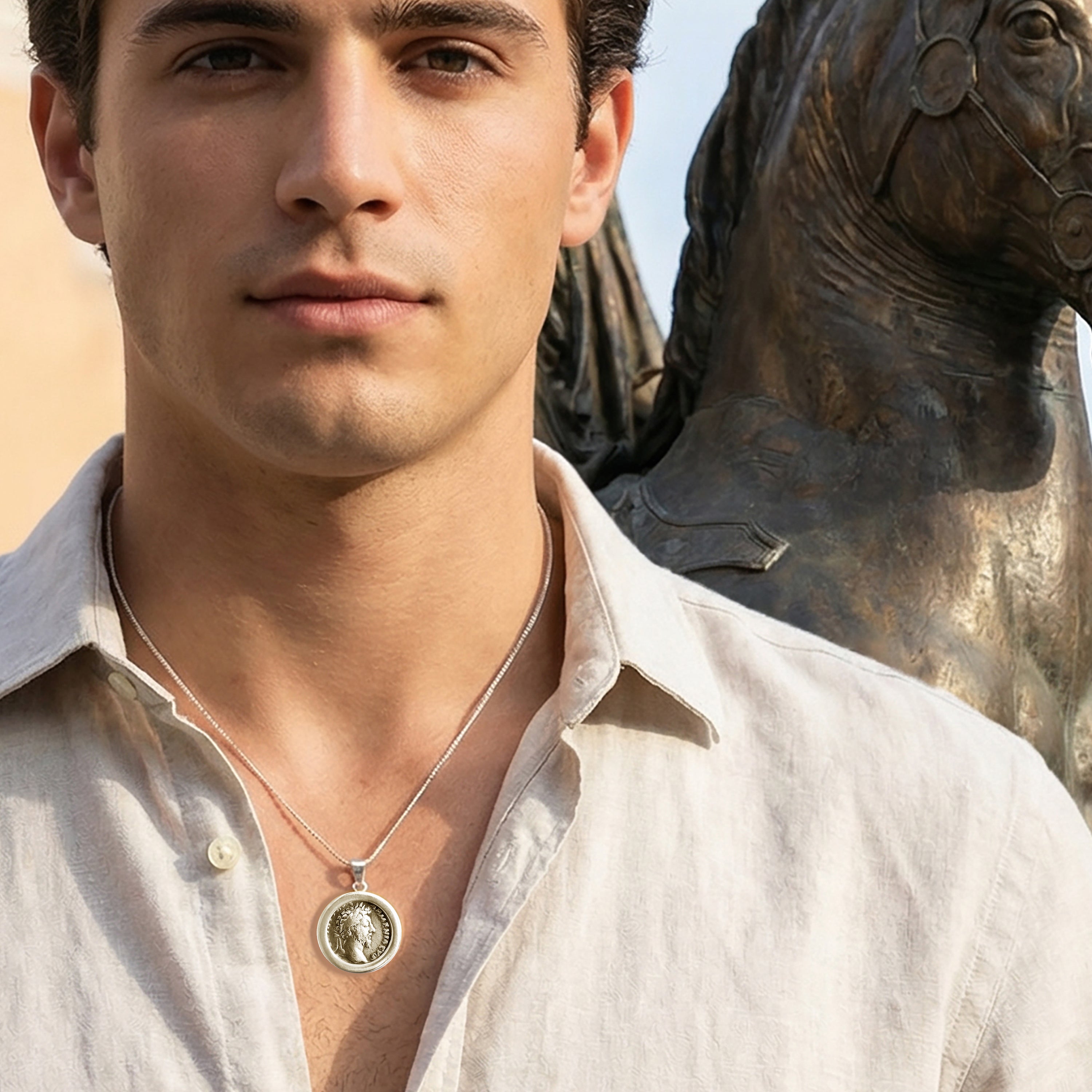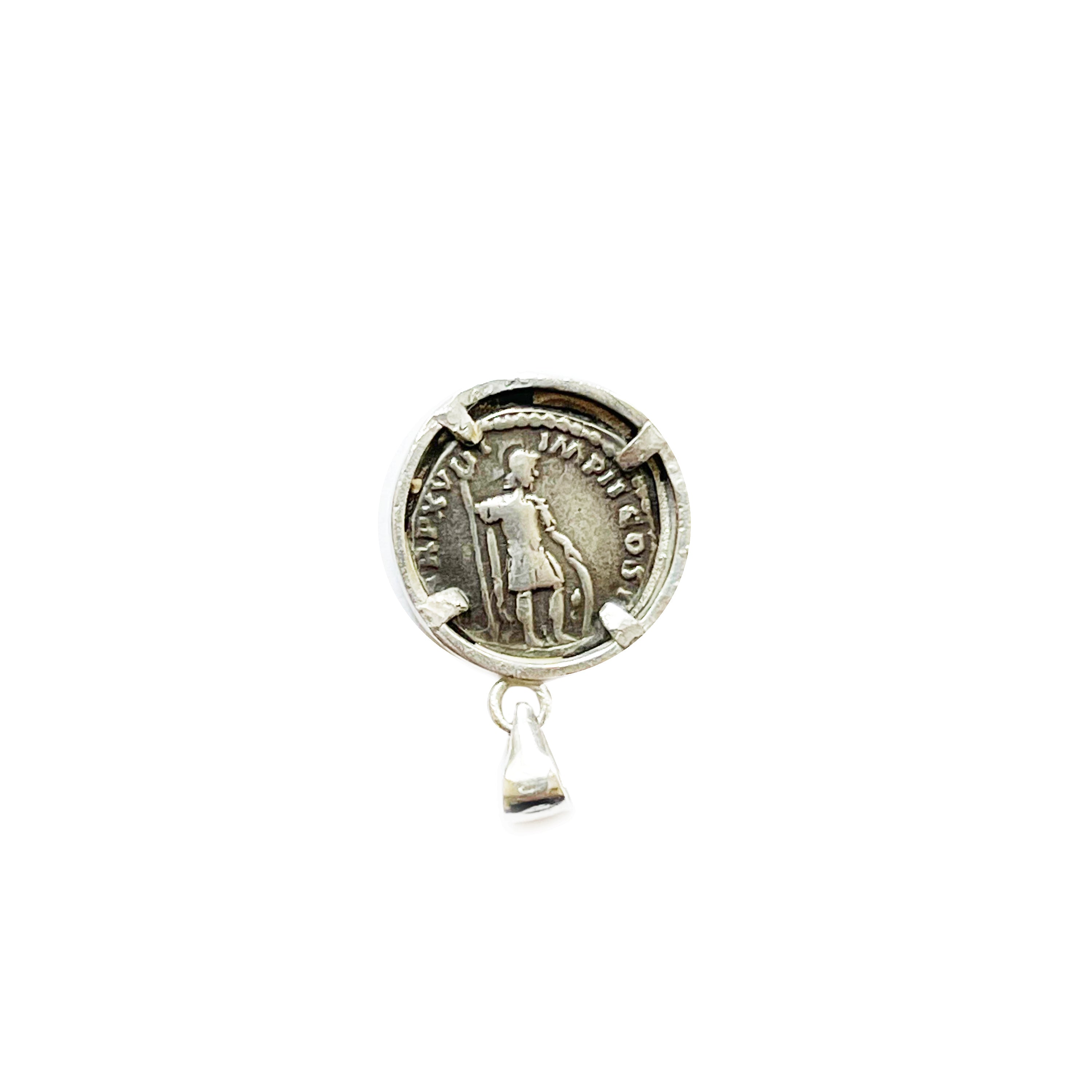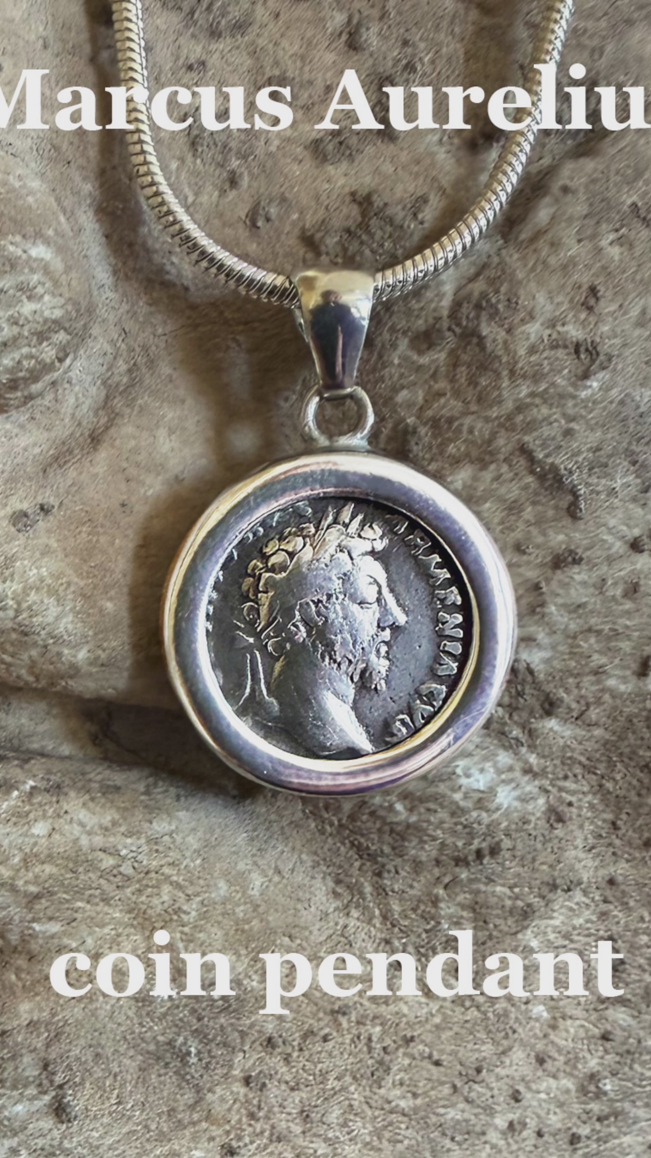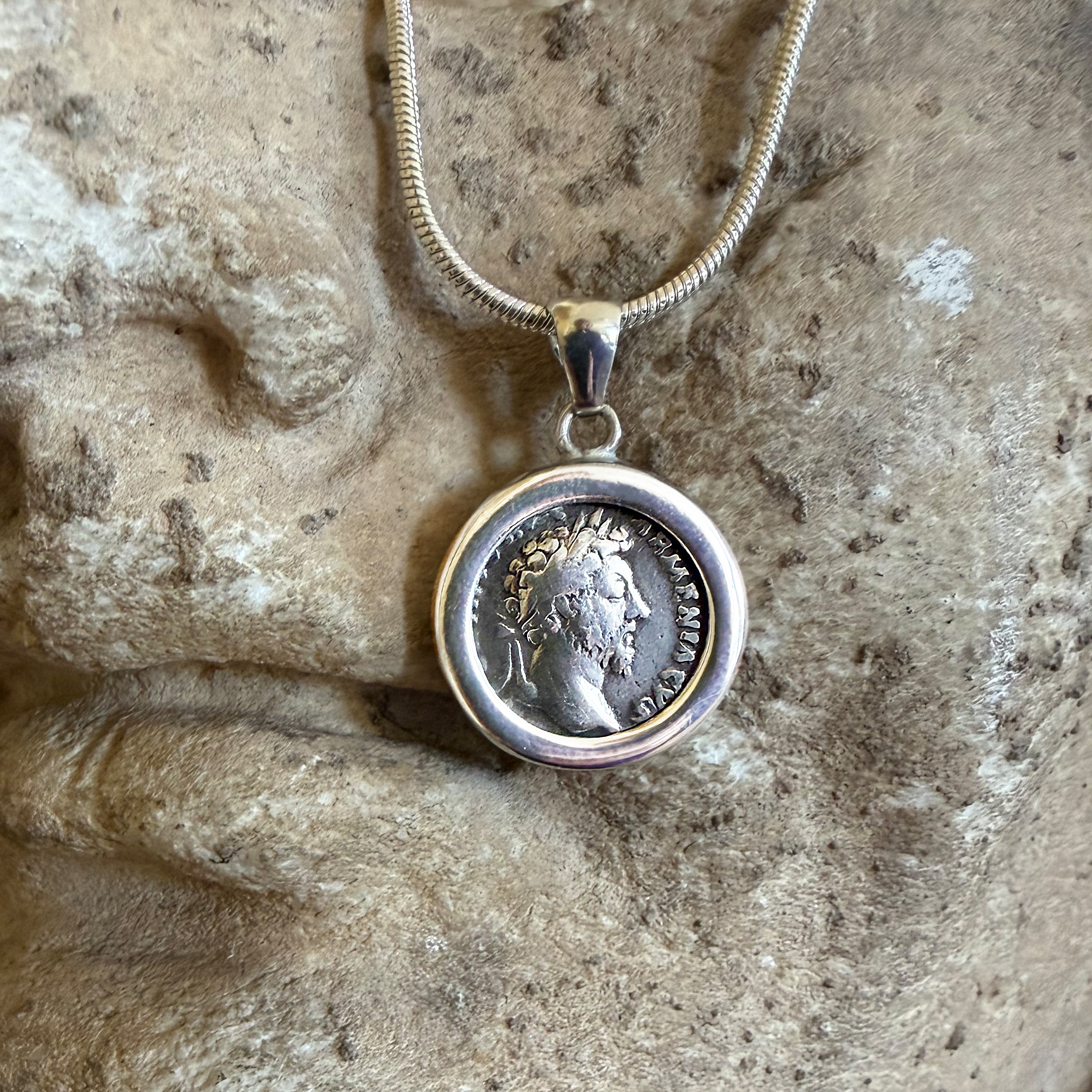 This exquisite coin Pendant features an original Roman coin dating back to the 2nd century AD, showcasing Emperor Marcus Aurelius. The coin's reverse side displays a depiction of God Mars.