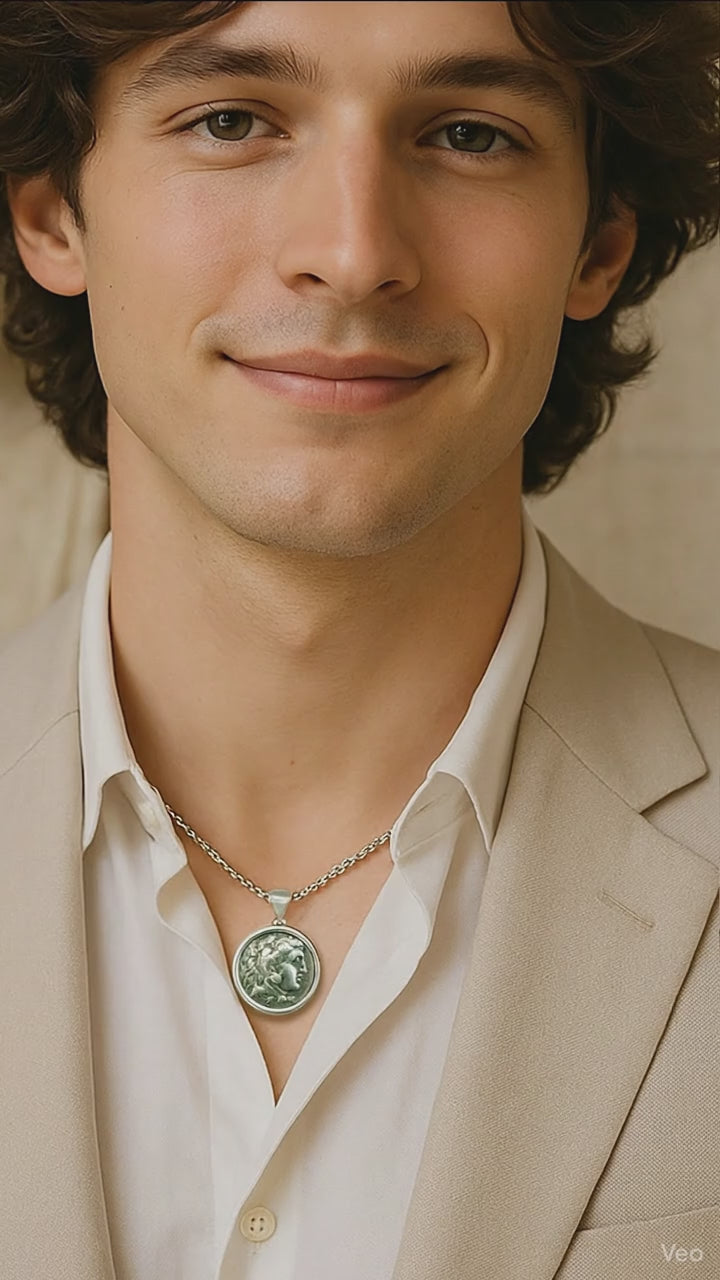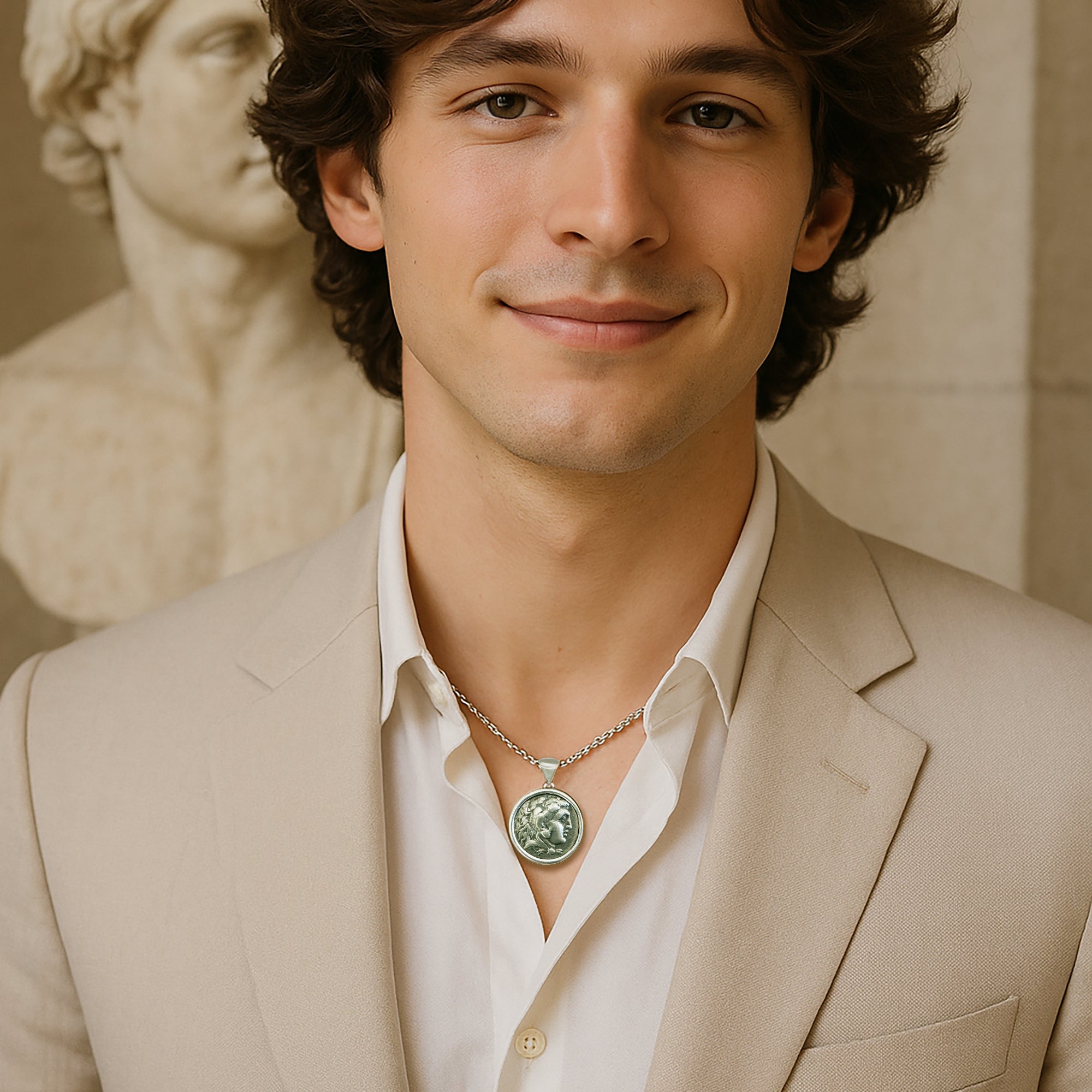 This pendant features a stunning 4th-century BC Greek silver coin minted by Alexander the Great. The coin depicts the legendary hero Heracles (known as Hercules in Roman mythology) wearing lion skin. On the reverse side, we can see Zeus seated on a throne, holding a scepter and accompanied by an eagle.