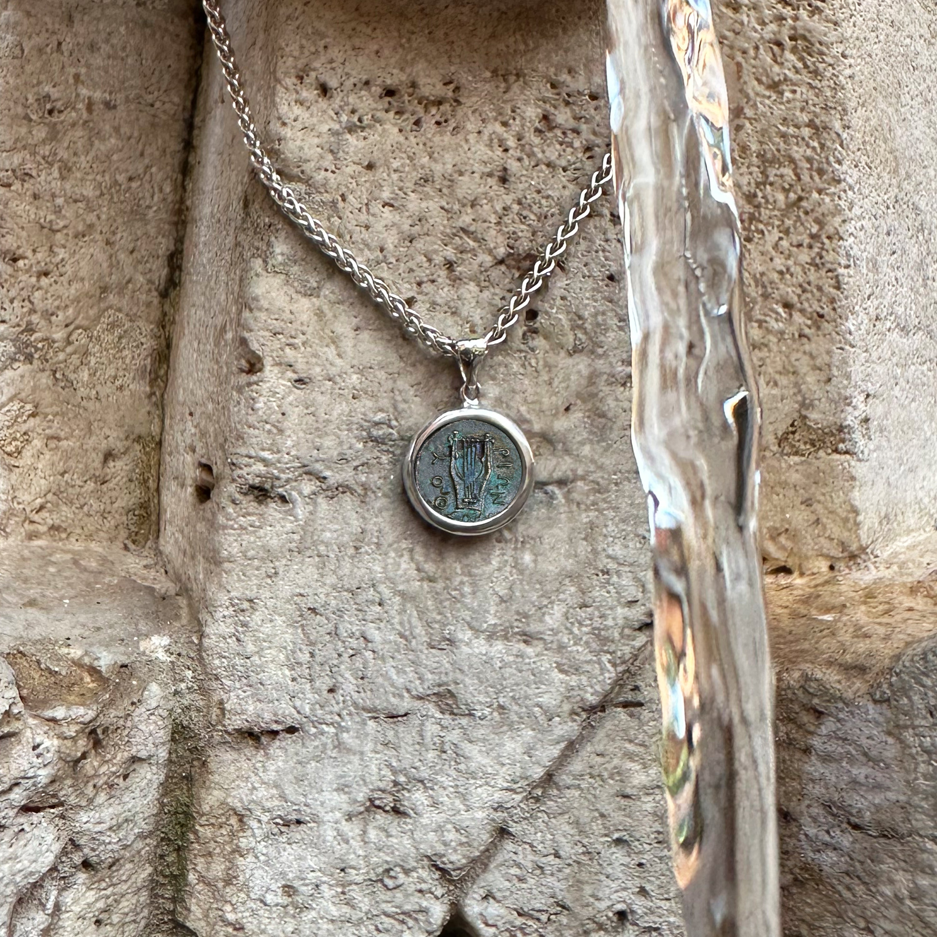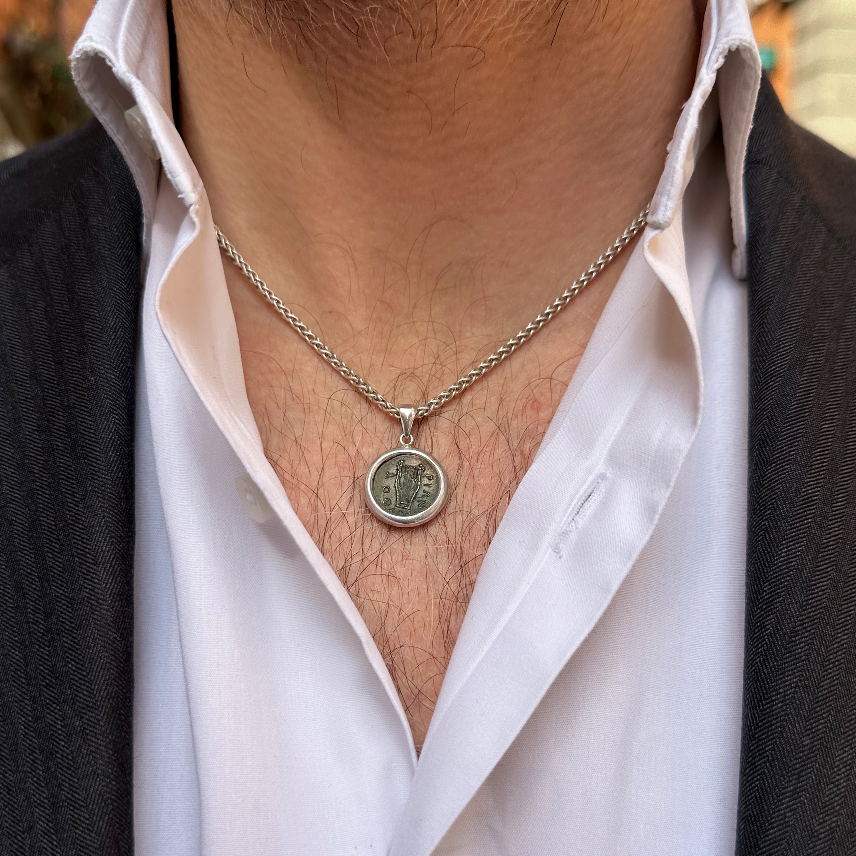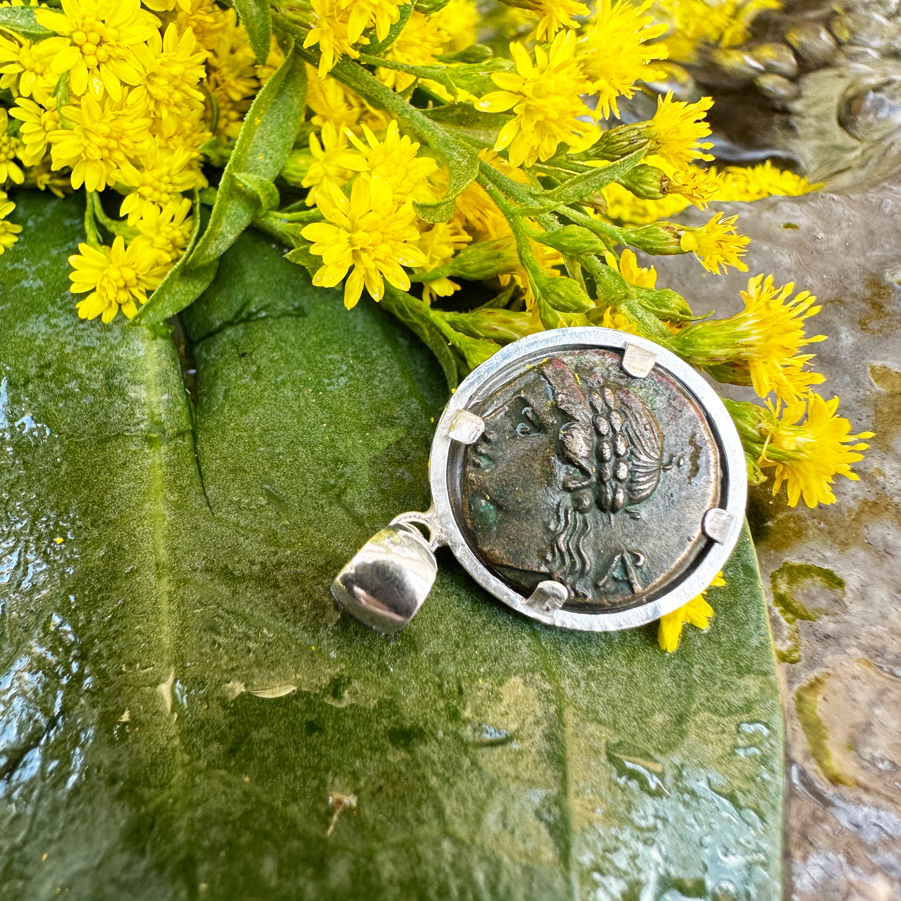 An authentic Greek bronze coin from the 2nd century BC has been set in this sterling silver pendant. The coin depicts a lyre on one side and the head of Apollo on the other.