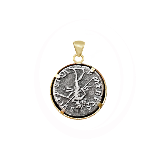 The pendant features an authentic silver denarius from the 1st century, depicting Emperor Trajan. On the reverse side of the coin, we find the figure of Mars, the Roman god of war, holding a spear and a trophy.