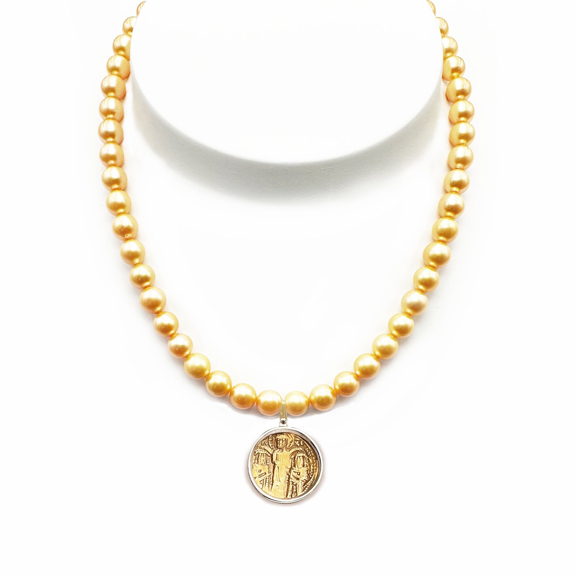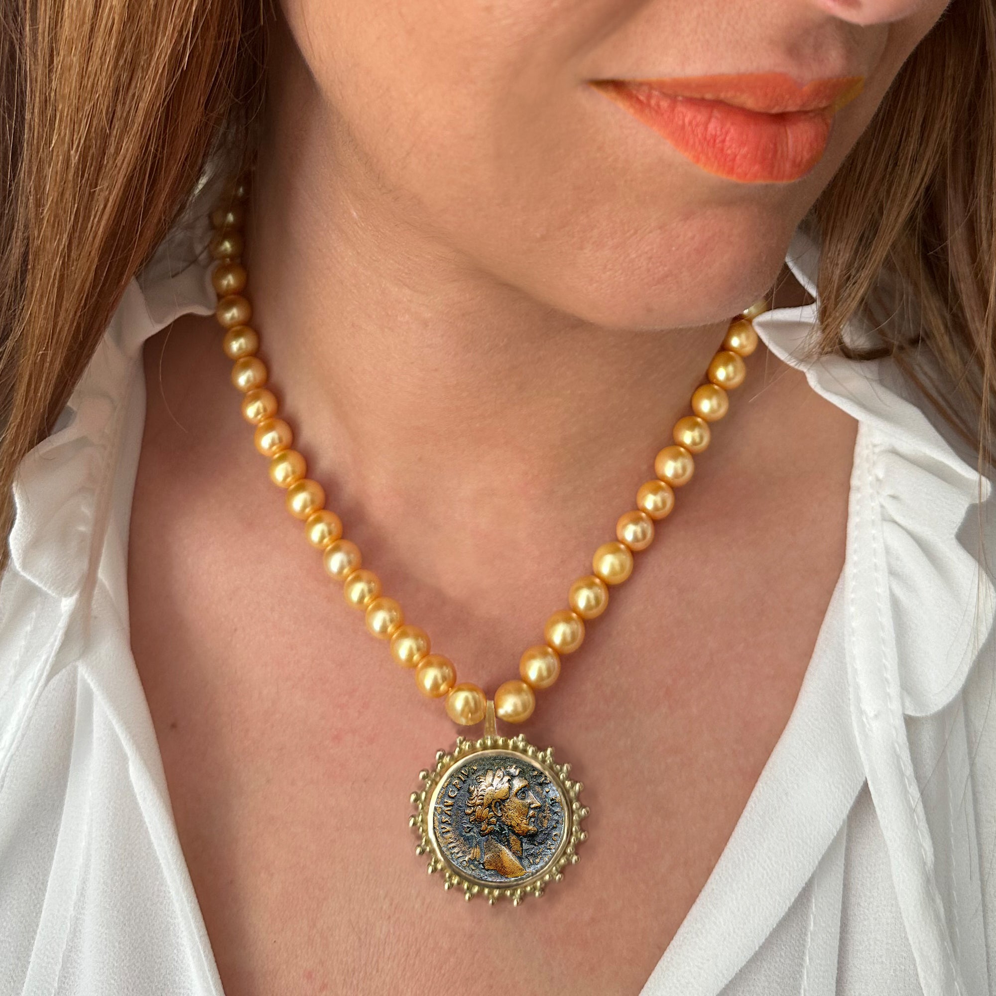 The necklace becomes even more exceptional with the option of adding an authentic Roman coin pendant to the pearls, seamlessly connected through a removable hook.