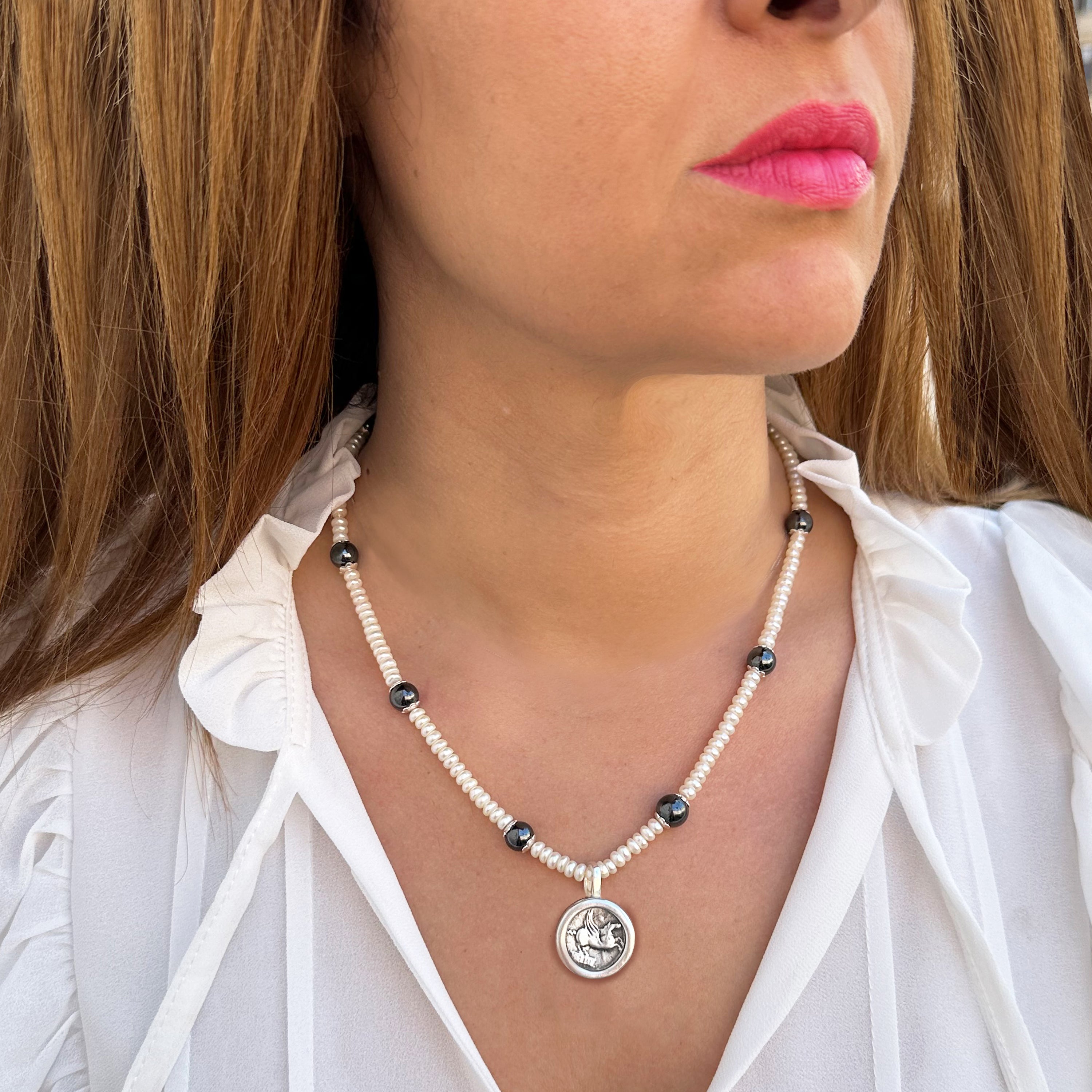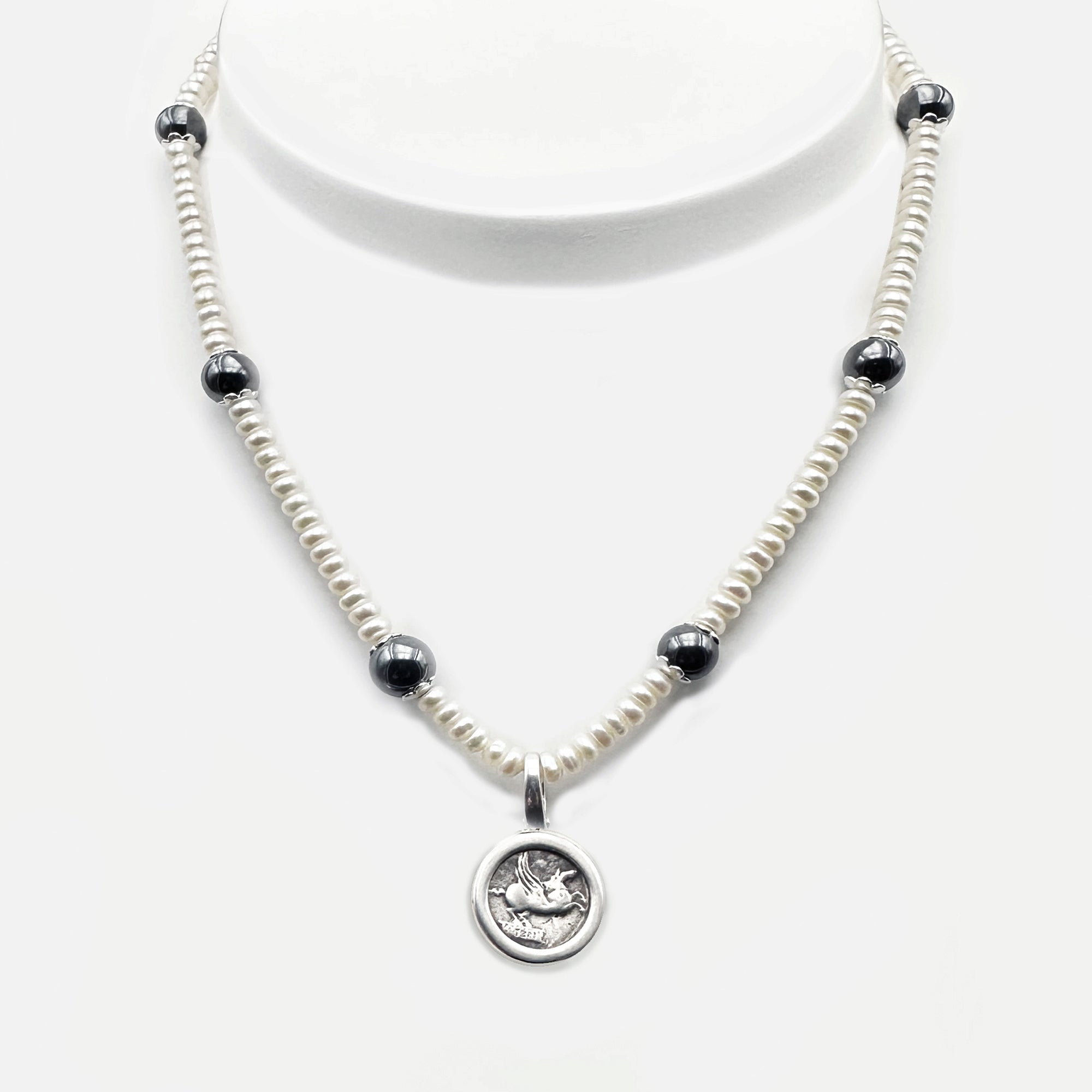 Our skilled artisans have meticulously handcrafted this necklace using freshwater pearls with a distinctive "onion" shape, complemented by hematite and sterling silver. What sets this necklace apart is its versatility, as any of our archaeological pendants can be easily attached to its center through an openable hook.