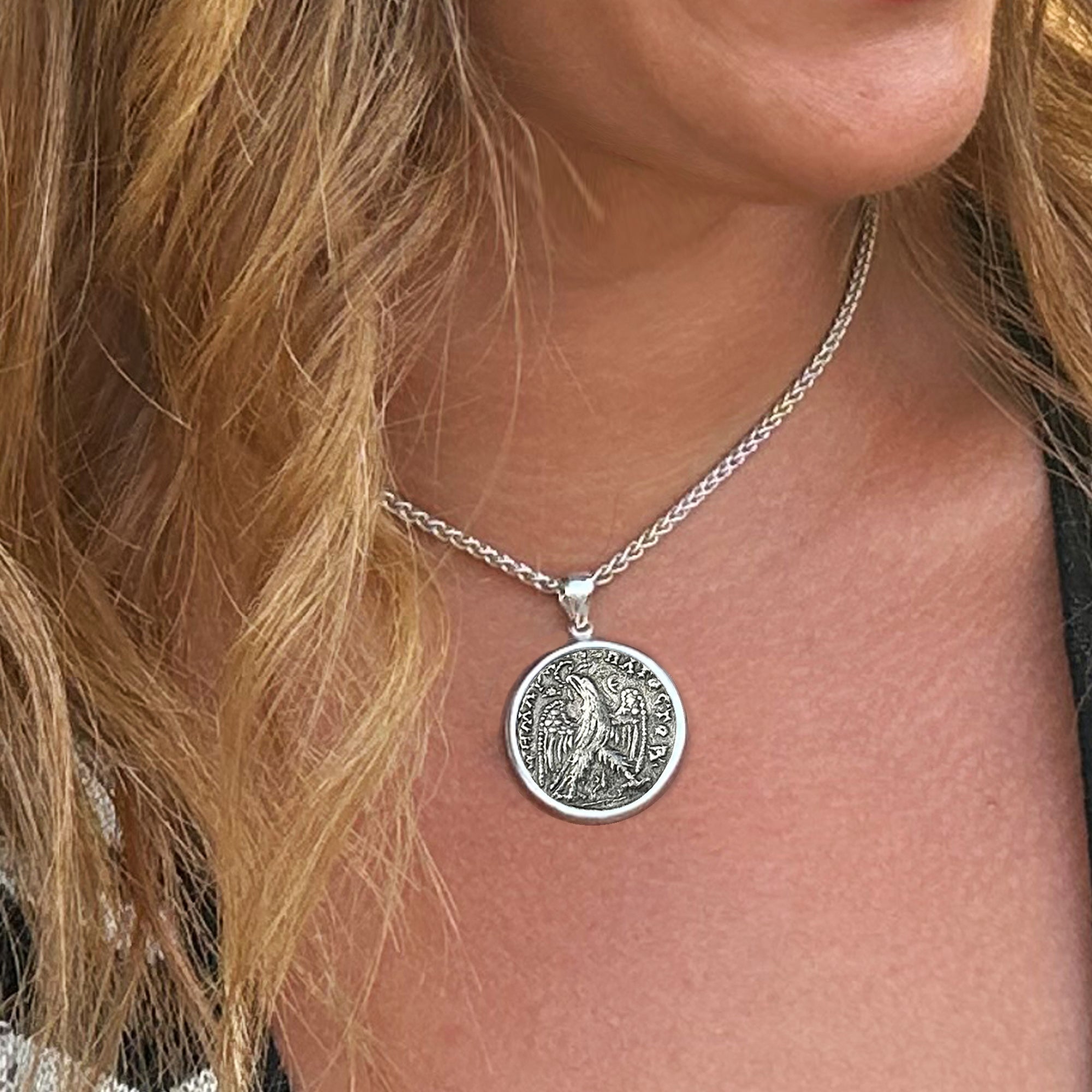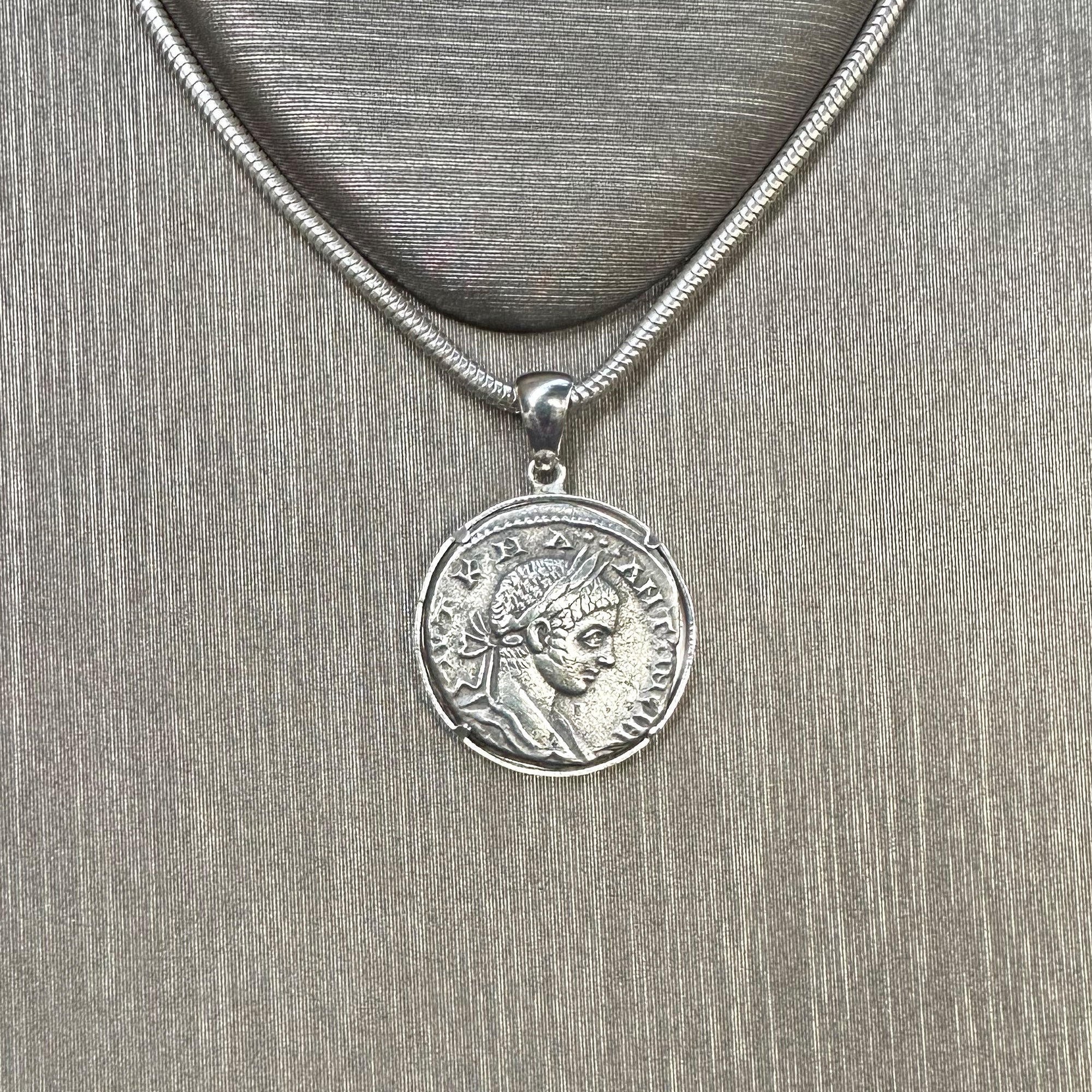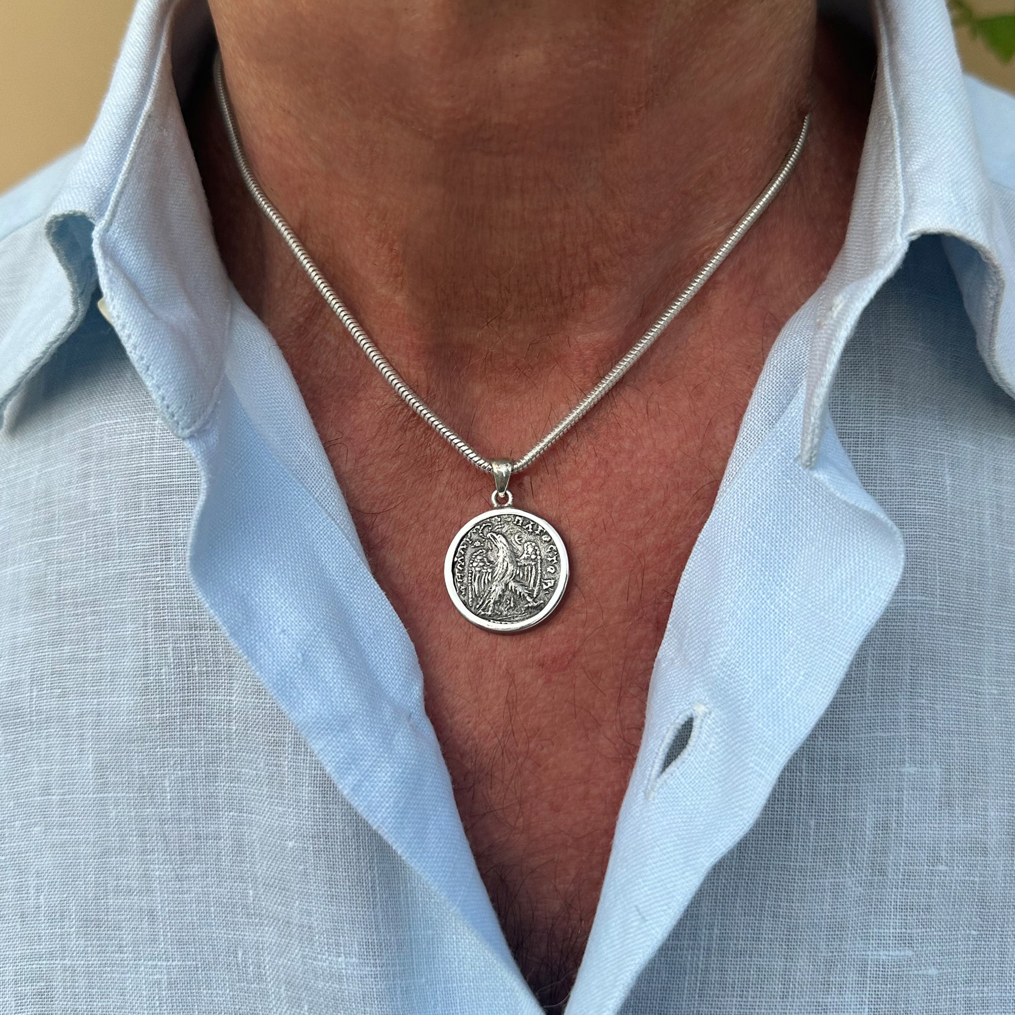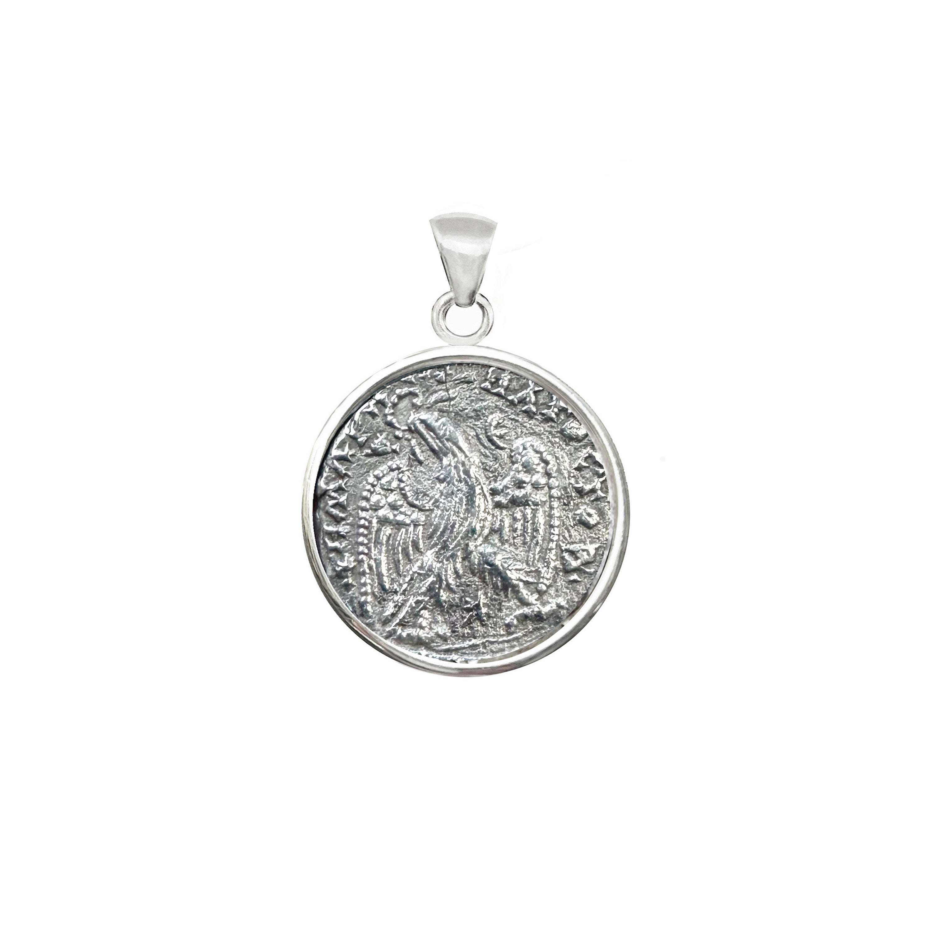 This sterling silver pendant features an authentic Roman coin dating back to the 3rd century AD, specifically a tetradrachm portraying an eagle grasping a laurel wreath in its beak, while the reverse showcases the bust of Emperor Elagabalus.