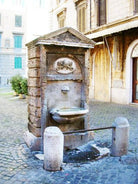 The fountain, protected by two small columns connected by an iron bar, consists of a simple rectangular aedicule in travertine, gabled at the top and leaning against a brick construction. The upper arch has a papal coat of arms, with the tiara and the decussed keys, while the central part is made up of a simple cinnamon that pours the water into the underlying oval hanging basin, from which it falls into the drainage system at ground level delimited by a semicircular frame formed by a stone border that encloses a paving with cobblestones. Note the inscription placed immediately above the cinnamon, ACQUA MARCIA, which of course refers to the water that feeds the fountain. But this writing also suggests the dating of the fountain: it was built around 1870 by Pope Pius IX on the occasion of the restoration works of the ancient aqua Marcia and which was renamed Acqua Pia from the name of the pope.