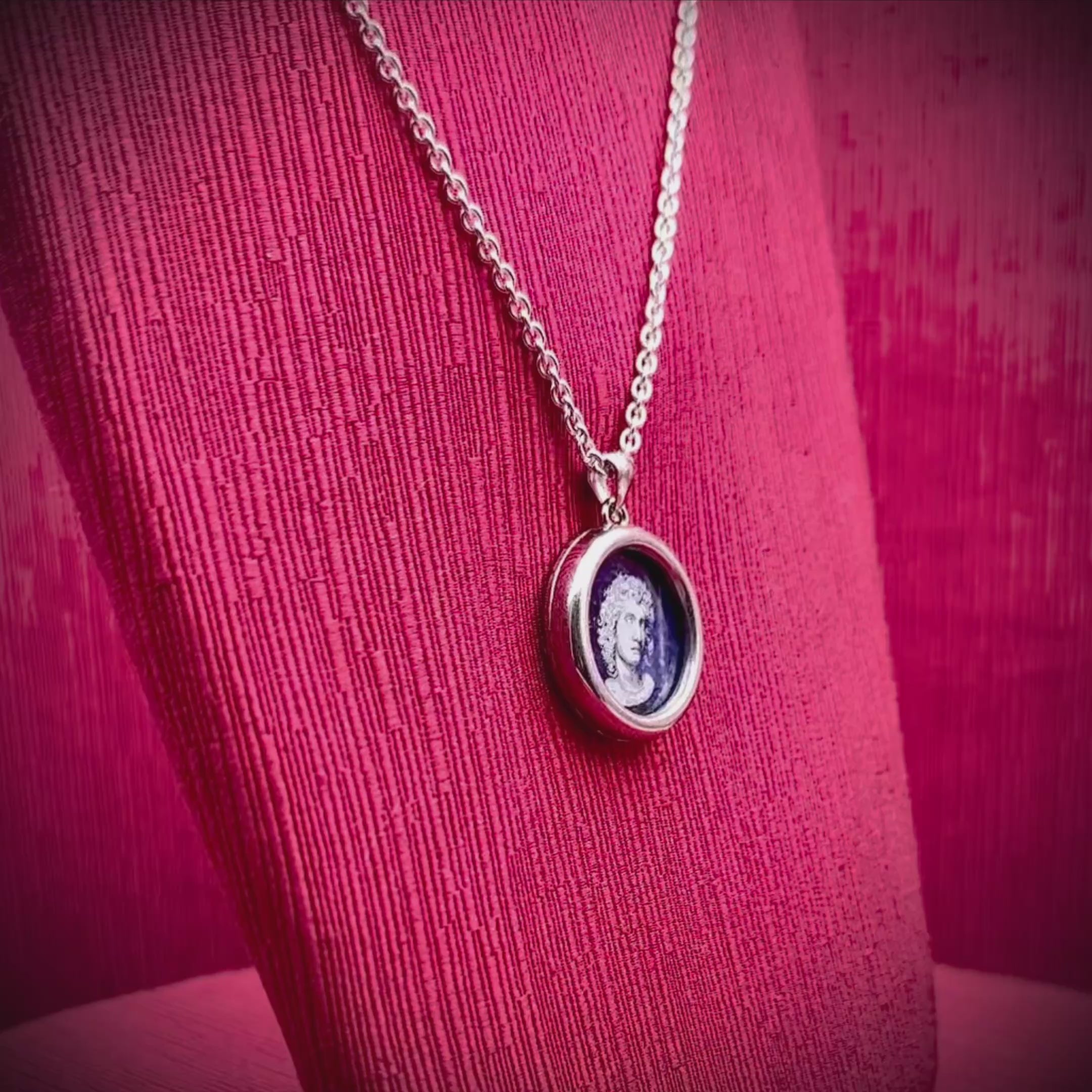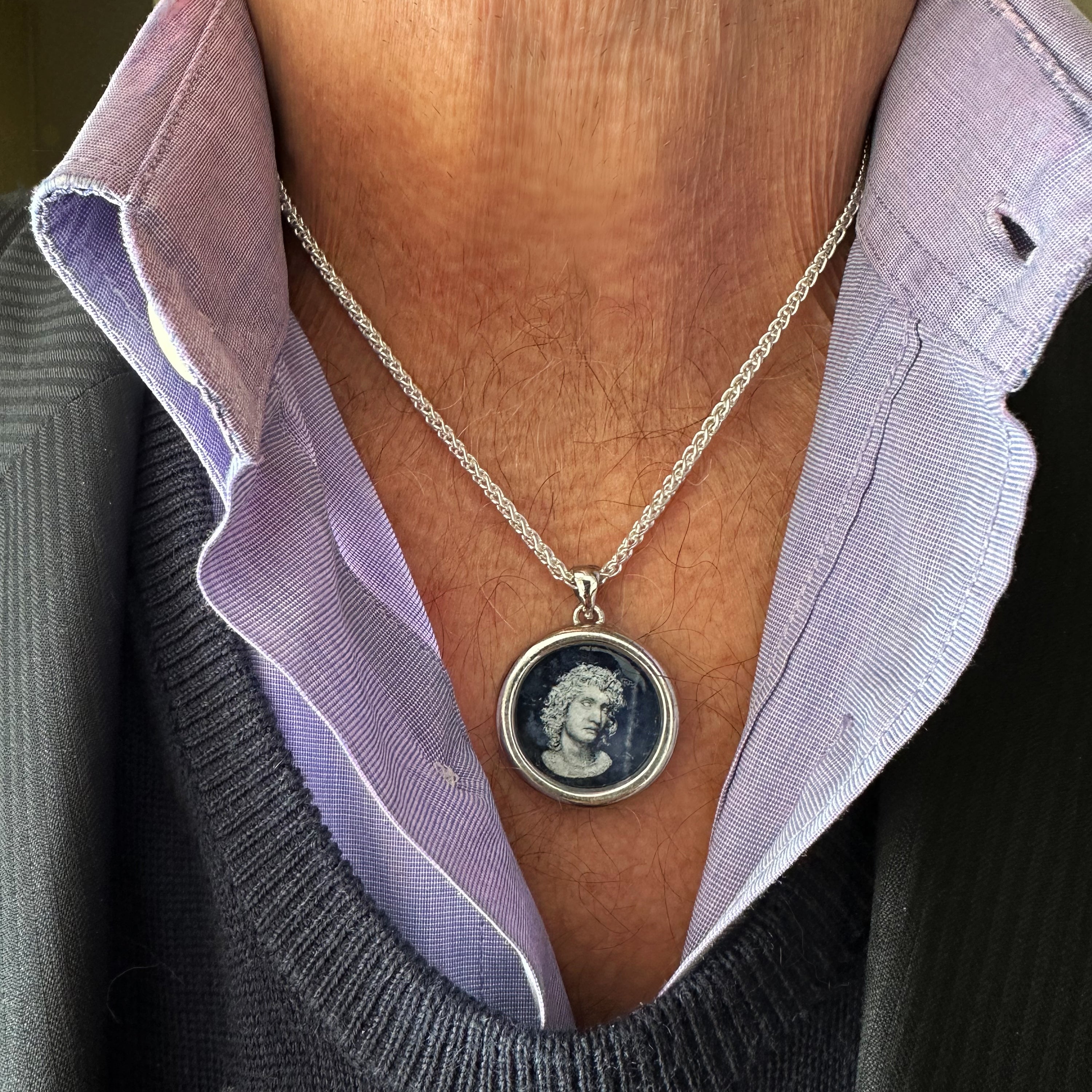 This pendant features a hand-painted image of Alexander the Great, skillfully rendered by the artist Tommaso Rossi on Onyx. The artwork is set in solid silver, merging historical grandeur with fine jewelry. The dark black Onyx provides a captivating backdrop, accentuating the intricate details of Alexander's depiction, symbolizing leadership, courage, and conquest. This piece harmoniously combines ancient history with expert craftsmanship, delivering a unique and meaningful work of wearable art.
