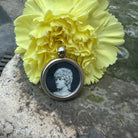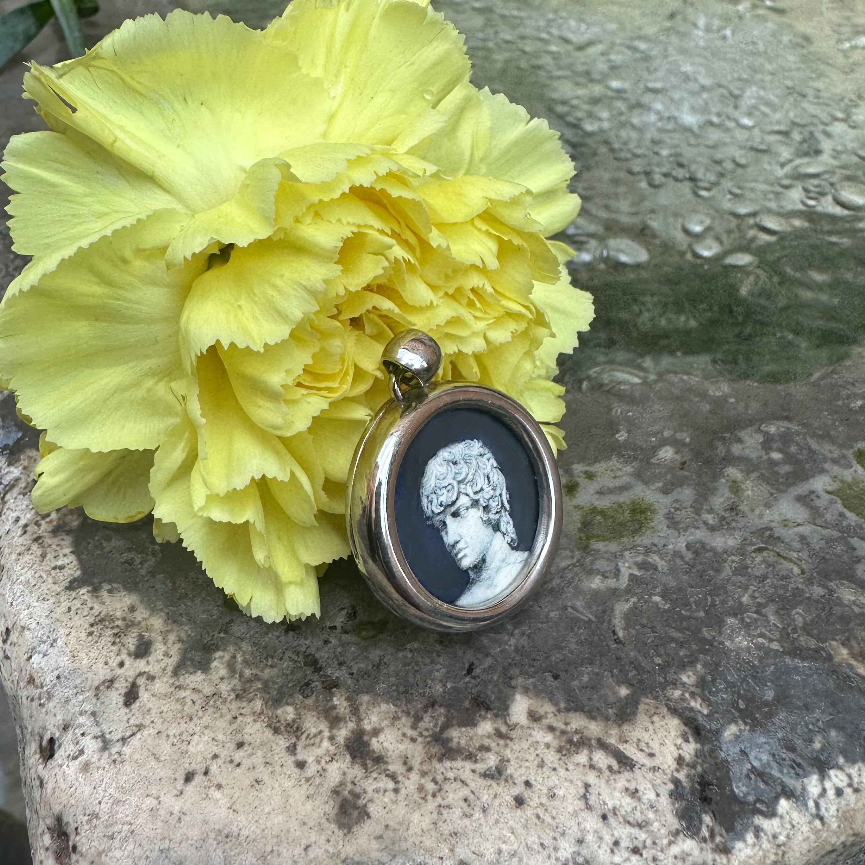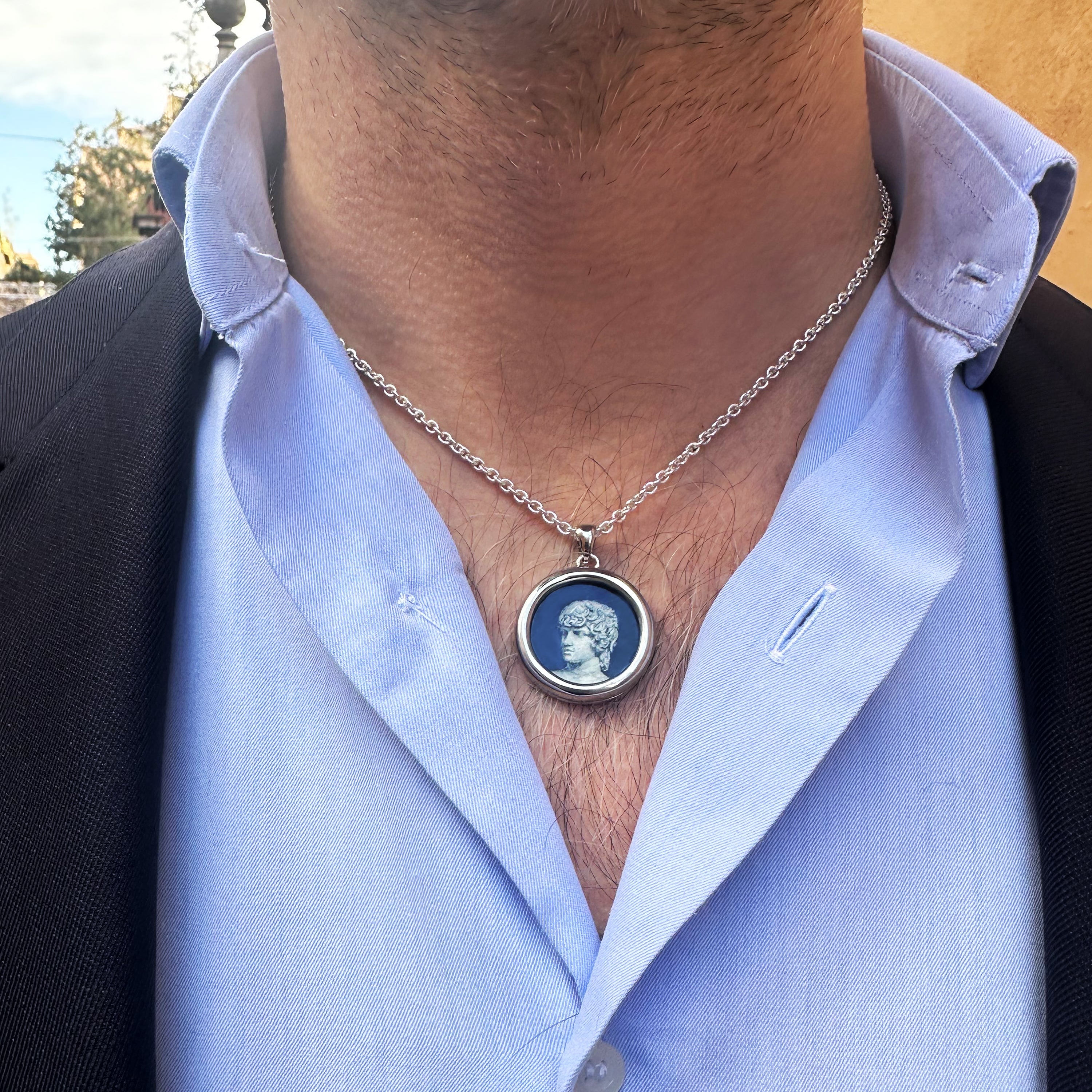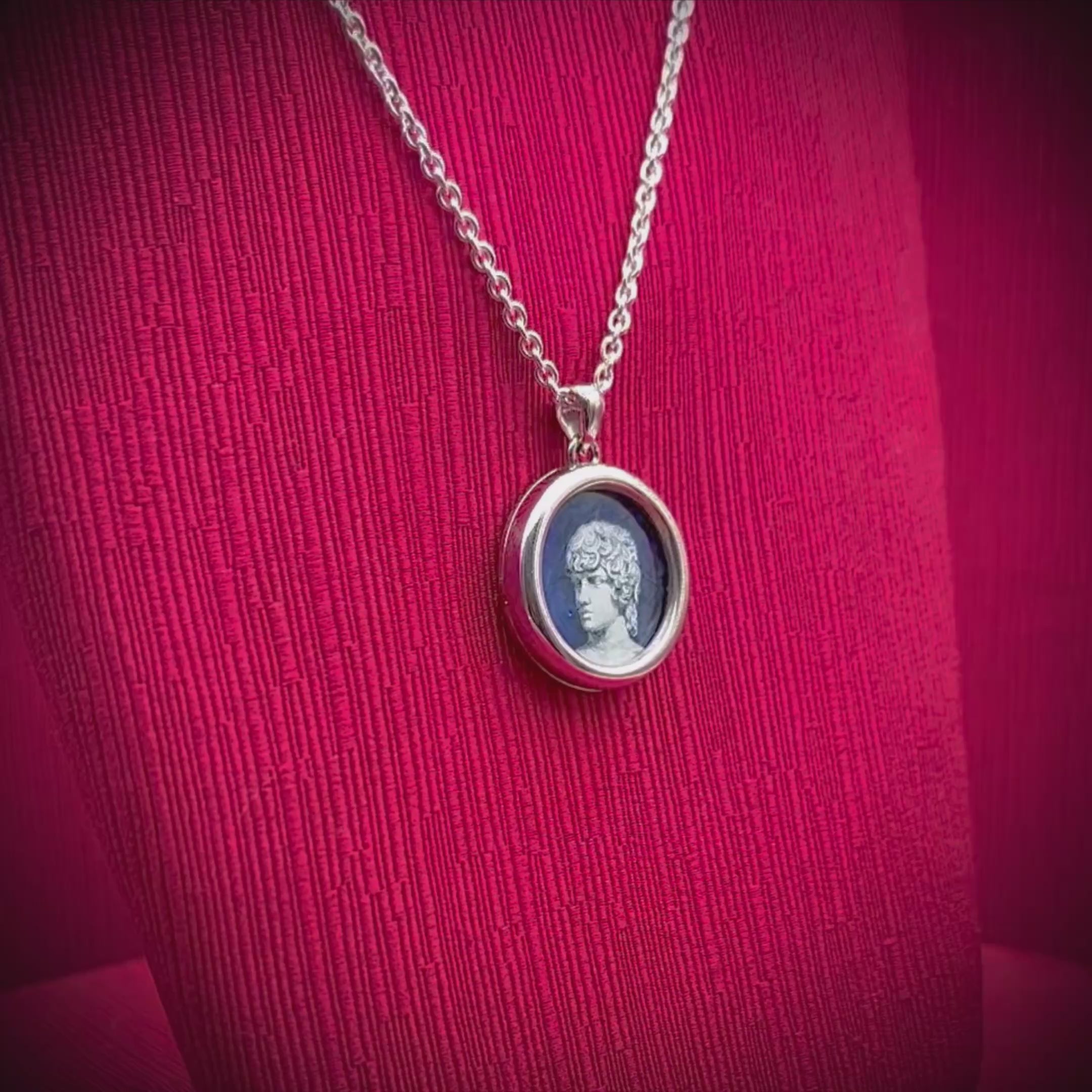 This pendant features a hand-painted representation of Antinous, skillfully painted by the artist Tommaso Rossi on Lapis Lazuli. Set in solid silver, it captures the timeless beauty and mystique of Antinous, a figure renowned for his association with love, youth, and divine beauty in ancient mythology. The rich blue hue of Lapis enhances the striking artwork, while the silver setting adds an elegant touch. This pendant blends mythology with fine craftsmanship, offering a meaningful and visually captivating piece of jewelry.