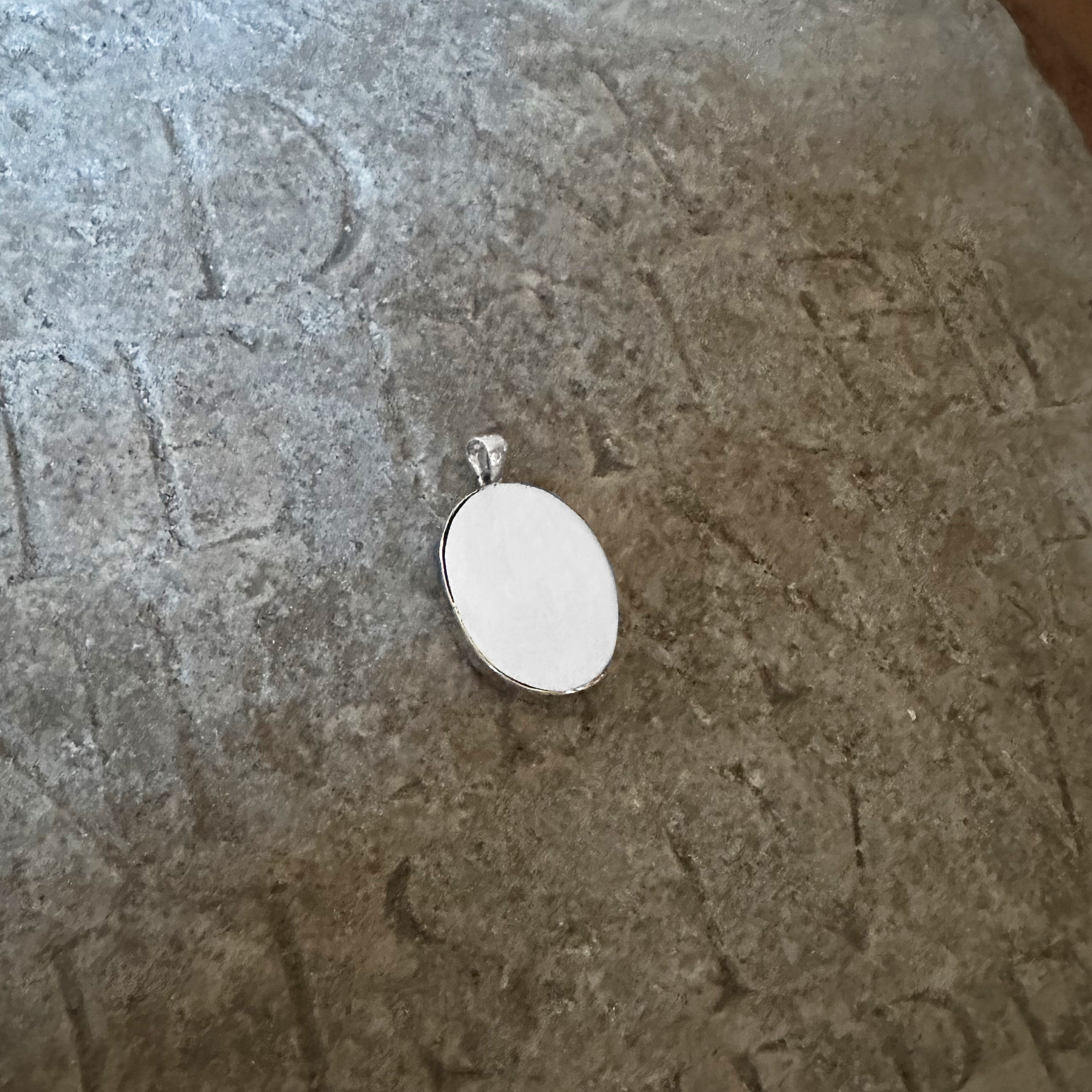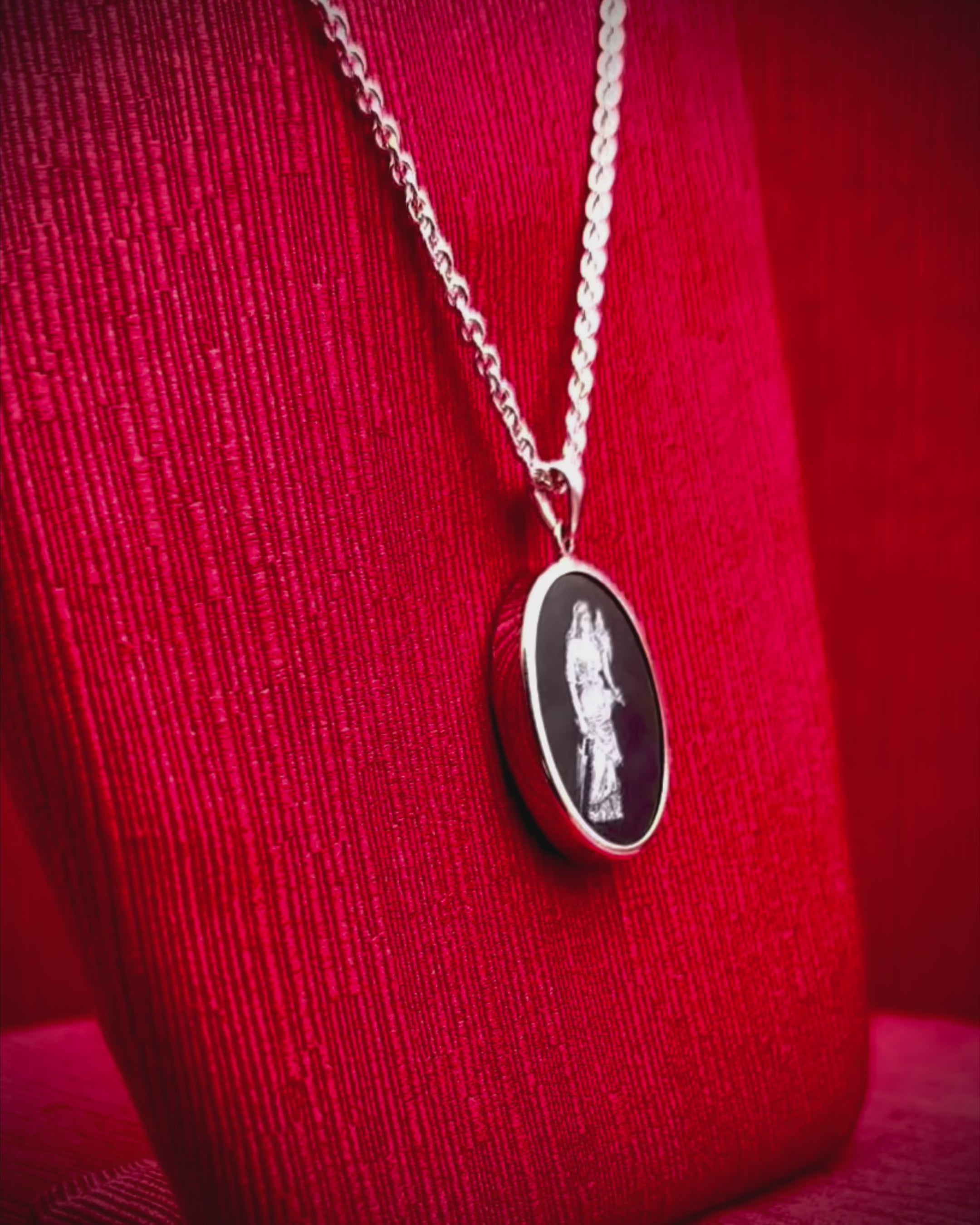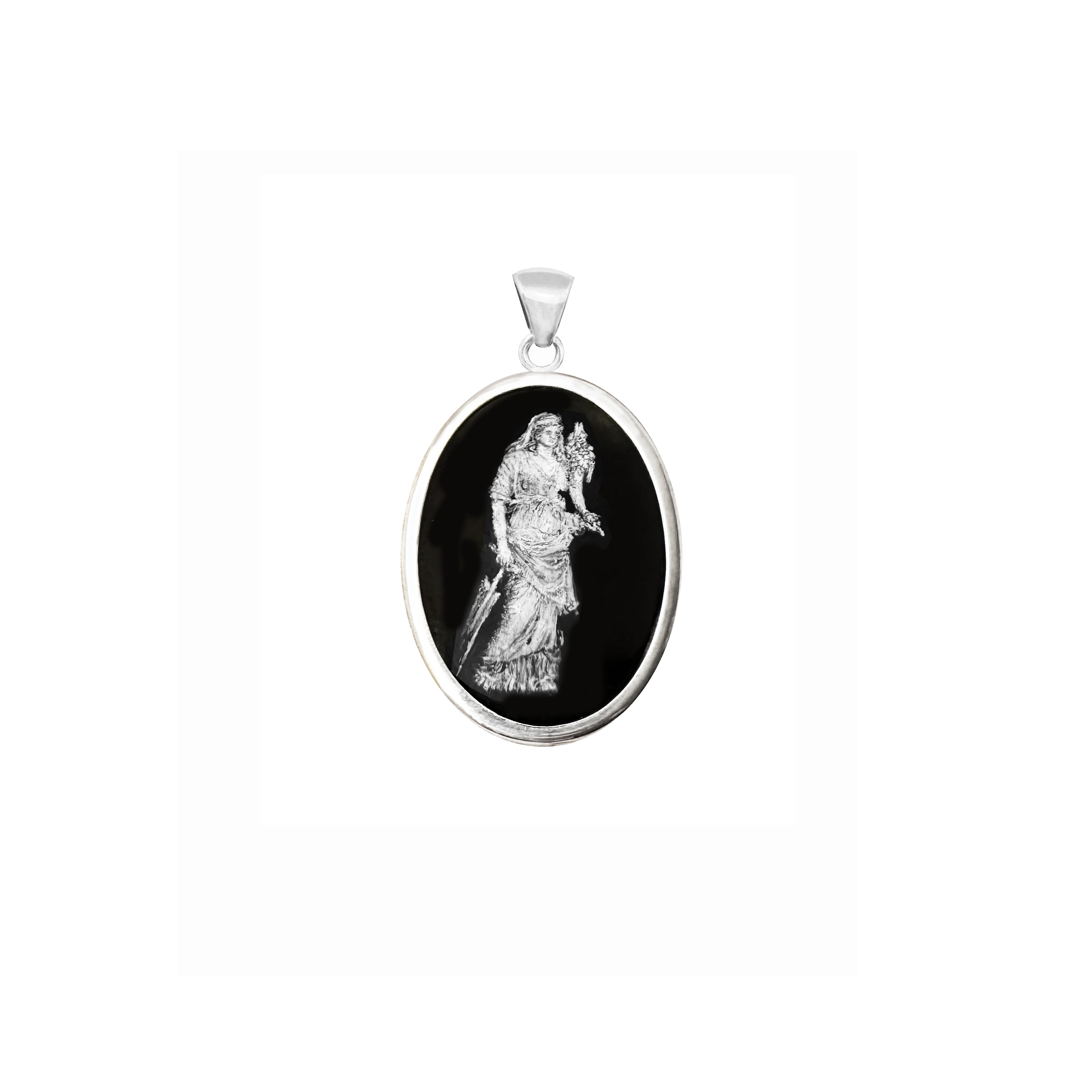 This pendant showcases a hand-painted portrayal of the Roman goddess Fortuna, beautifully painted by the artist Tommaso Rossi on Onyx. Set in solid silver, the design captures Fortuna’s essence as the goddess of luck, fate, and fortune, often depicted with her cornucopia and wheel. The deep black Onyx background highlights the intricate details of the artwork, while the sterling silver setting adds an elegant touch. A blend of mythology and craftsmanship, this pendant offers a timeless piece of jewelry symbolizing luck and prosperity.