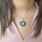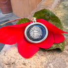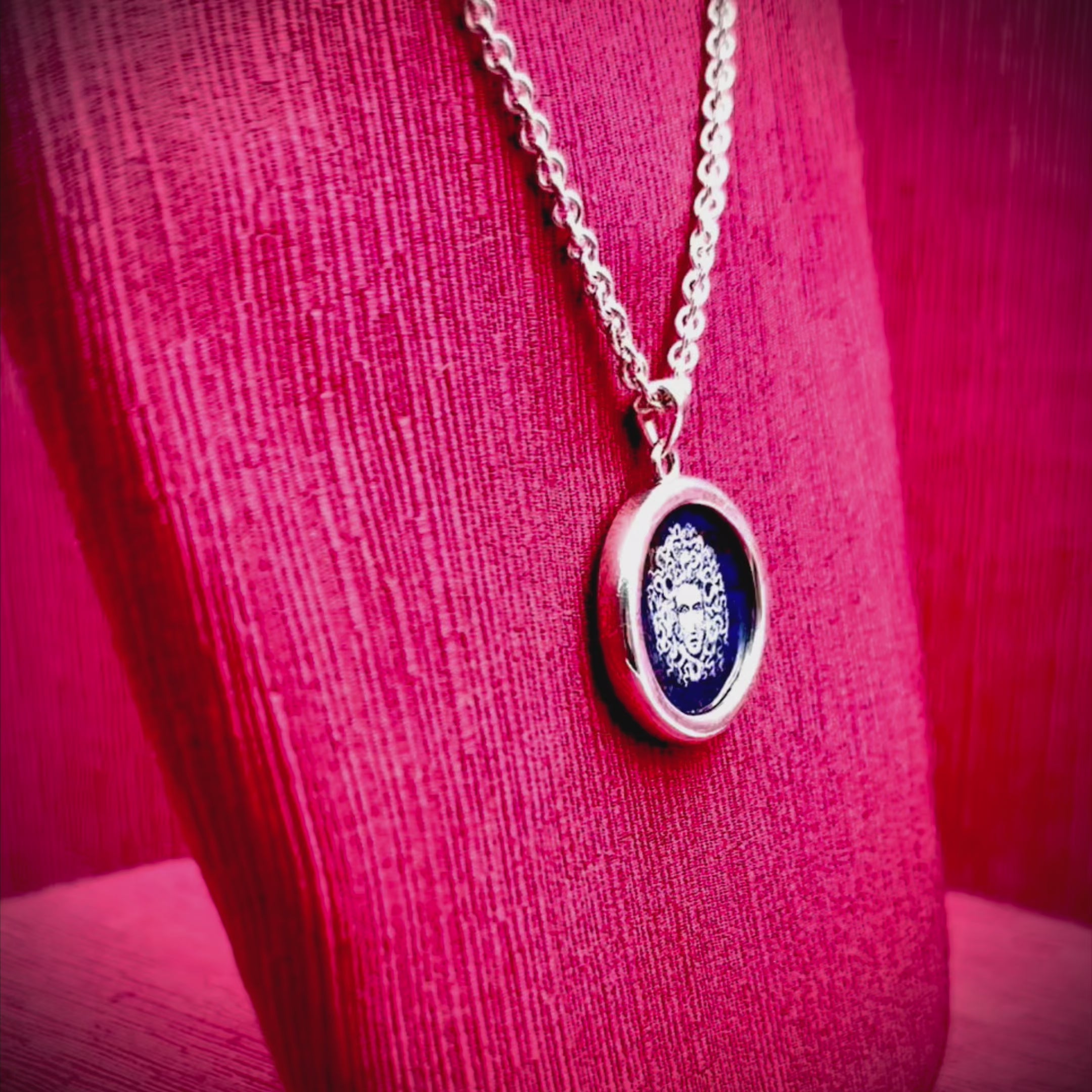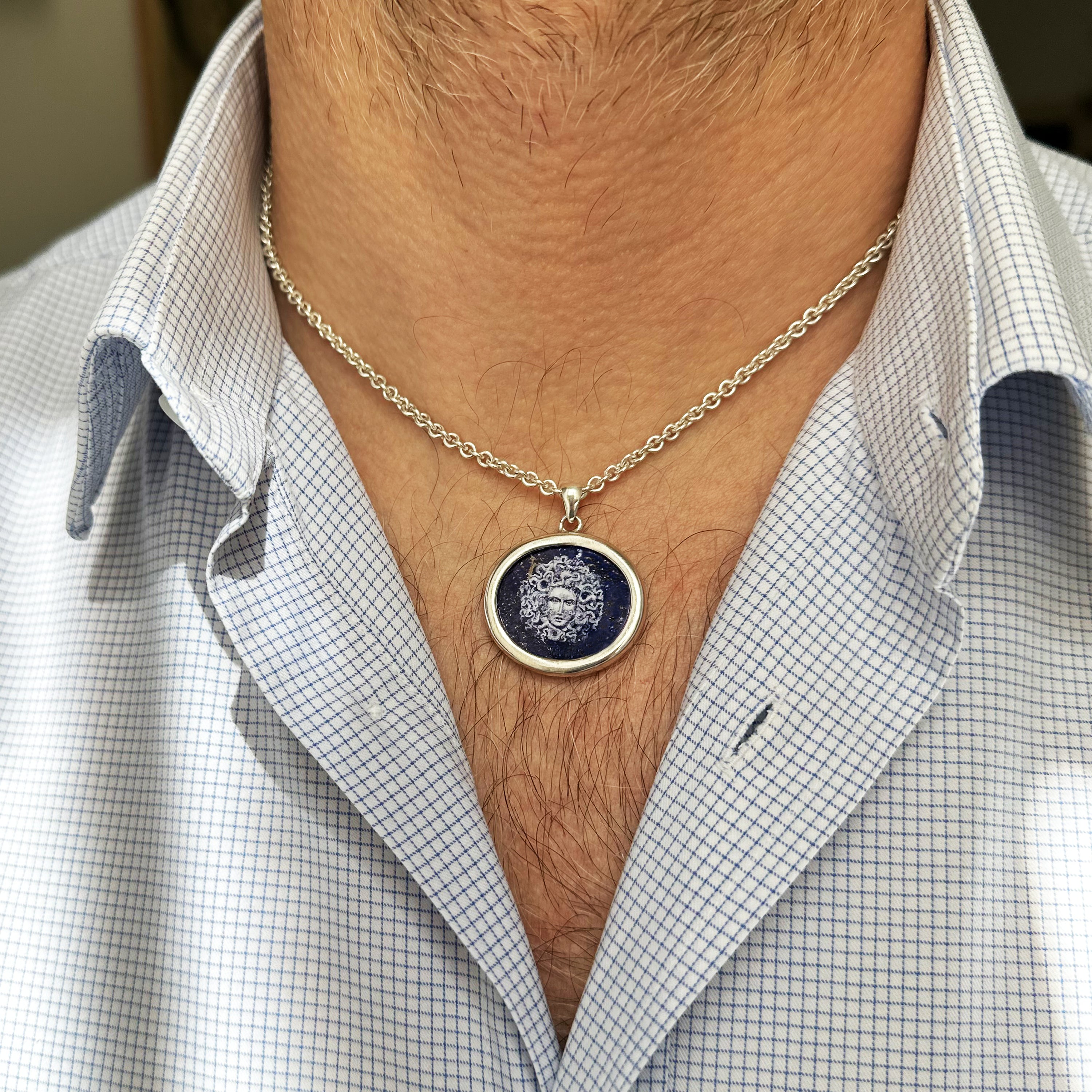 This pendant showcases a hand-painted image of the Gorgon Medusa, meticulously painted by the artist Tommaso Rossi on Lapis Lazuli. The artwork is set in solid silver, blending ancient mythology with fine jewelry. Lapis Lazuli's deep blue tones provide a striking backdrop, highlighting the intricate detailing of Medusa, a figure of both beauty and danger in Greek mythology.