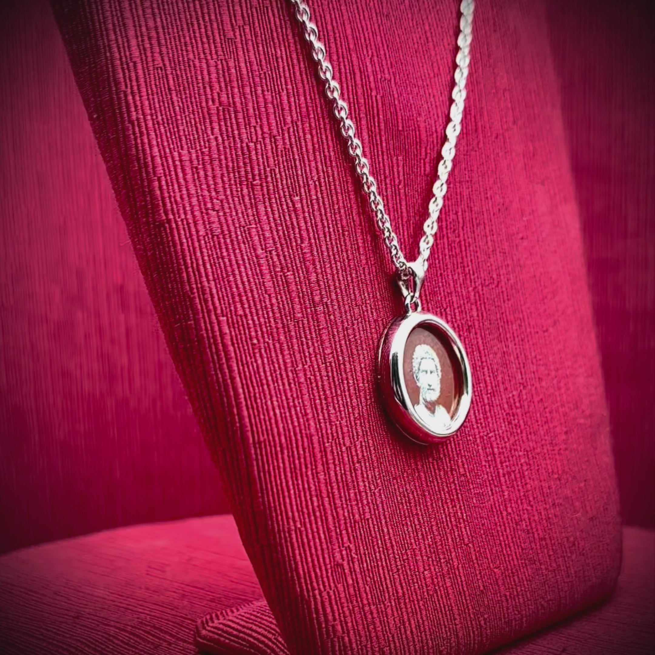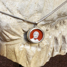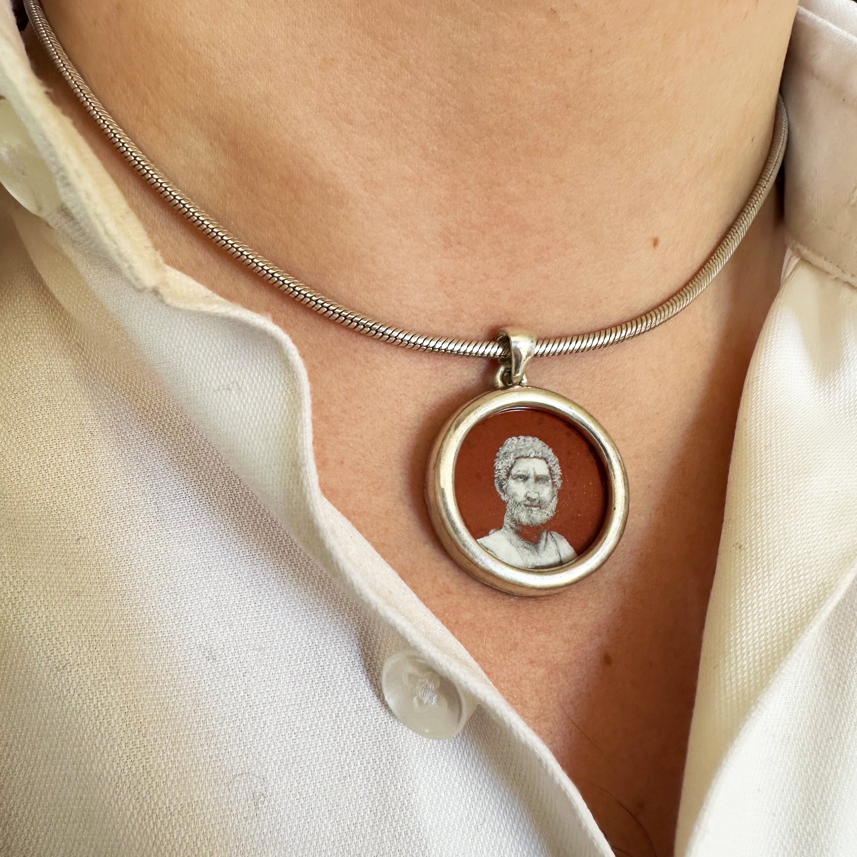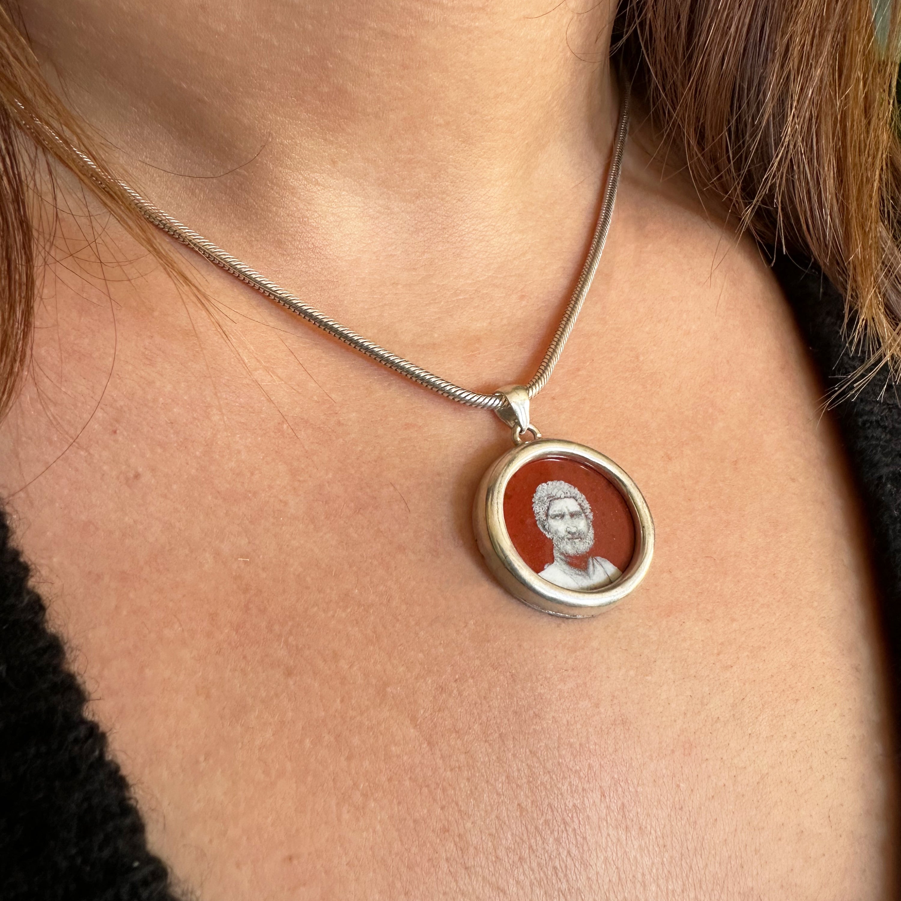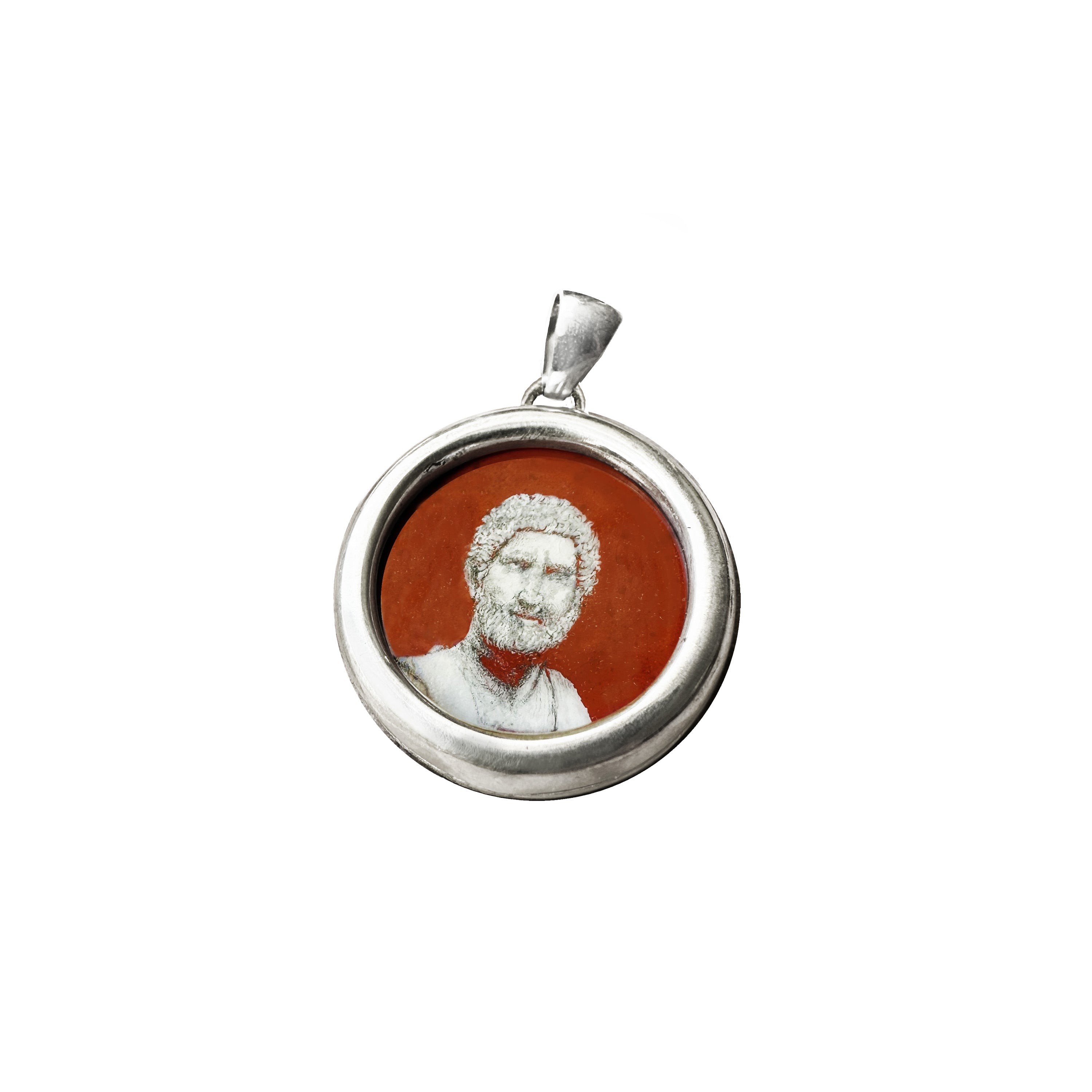 This pendant features a hand-painted depiction of Emperor Hadrian, skillfully painted by the artist Tommaso Rossi on Egyptian Jasper. Set in solid silver, it highlights intricate artistry and historical craftsmanship. The combination of precious stone and silver enhances the vivid portrayal of the Roman emperor, making it both a unique collectible and a wearable piece of art. Egyptian Jasper's natural hues and texture further elevate the pendant’s distinctive appeal, blending ancient history with fine jewelry craftsmanship.