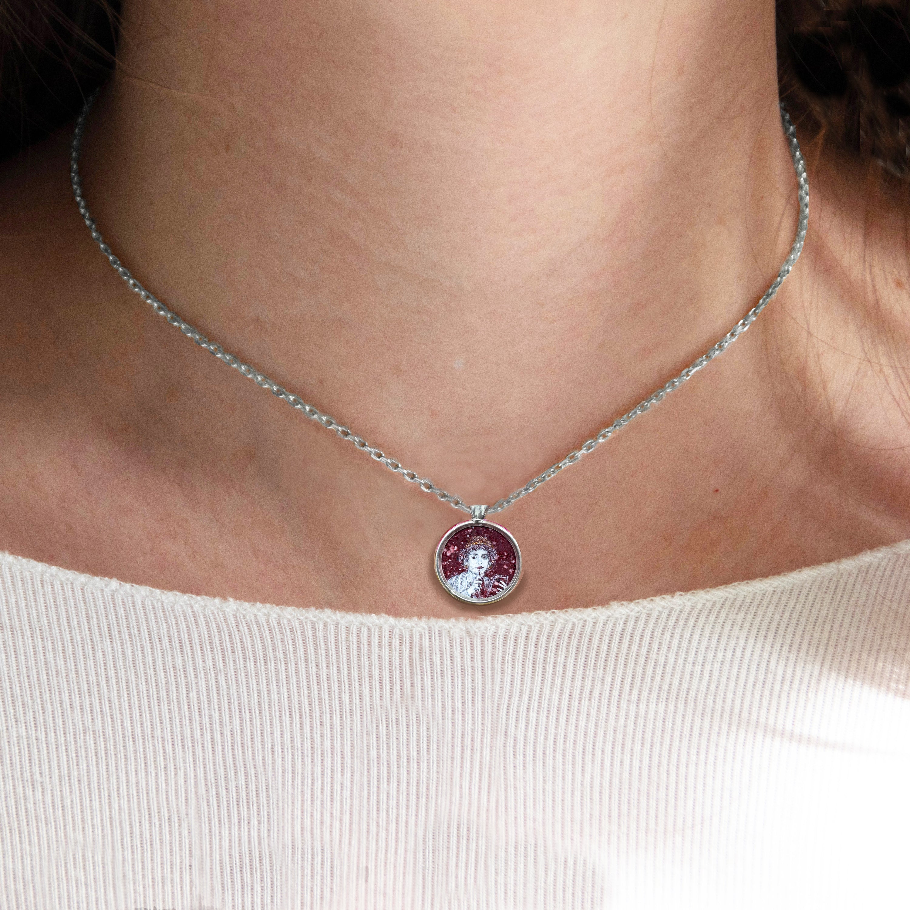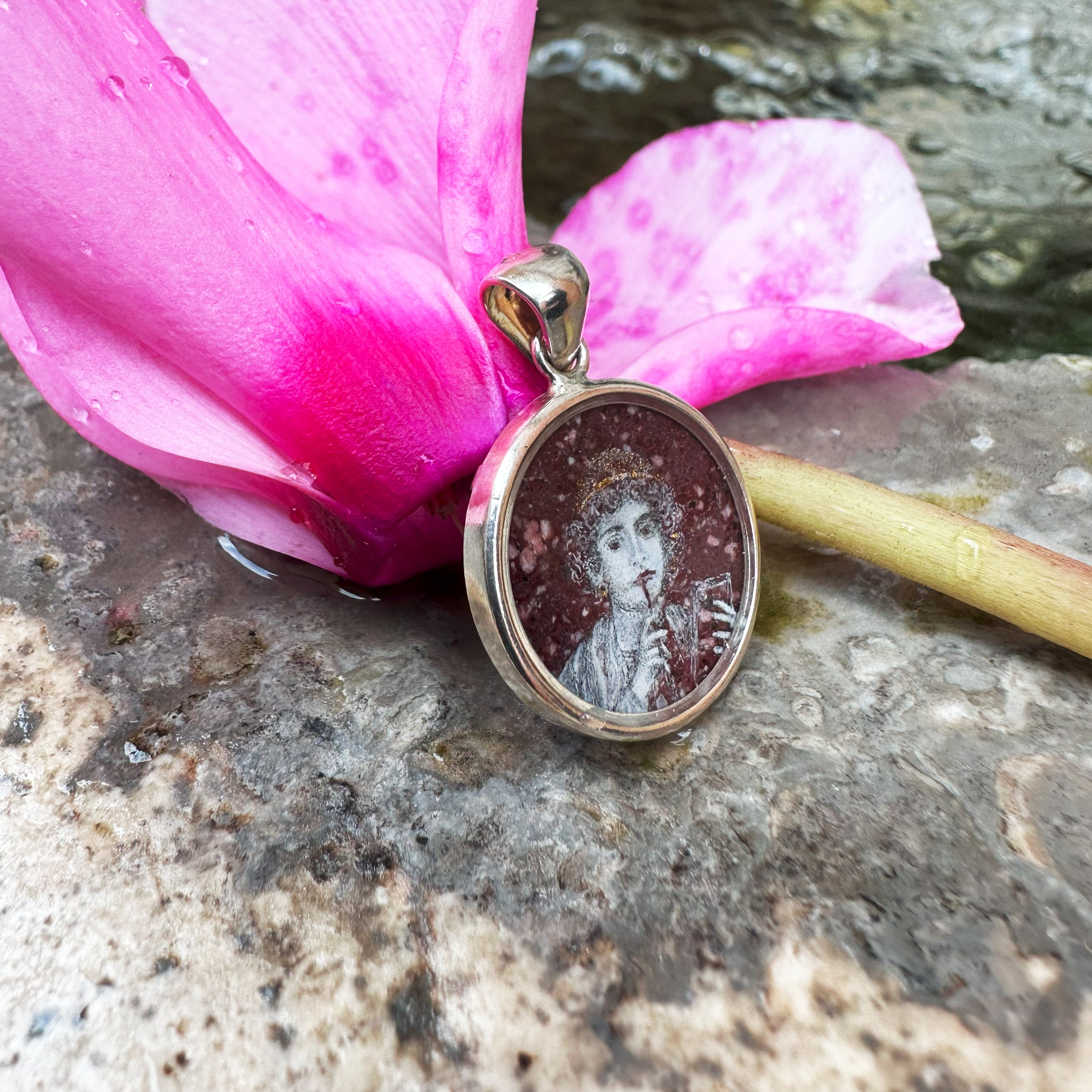 This pendant features a hand-painted representation of the ancient Greek poetess Sappho, expertly crafted by artist Tommaso Rossi, on rich red porphyry. Set in solid silver, it honors Sappho, the legendary lyric poet whose work continues to transcend the boundaries of time and culture. The deep red tone of the porphyry creates a striking backdrop, enhancing a delicate, enchanting portrayal of Sappho, her pen in hand.