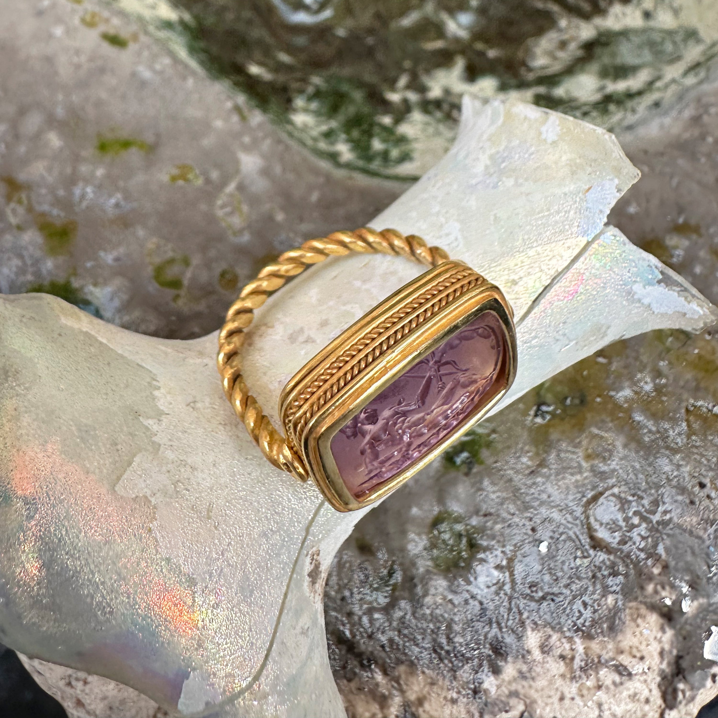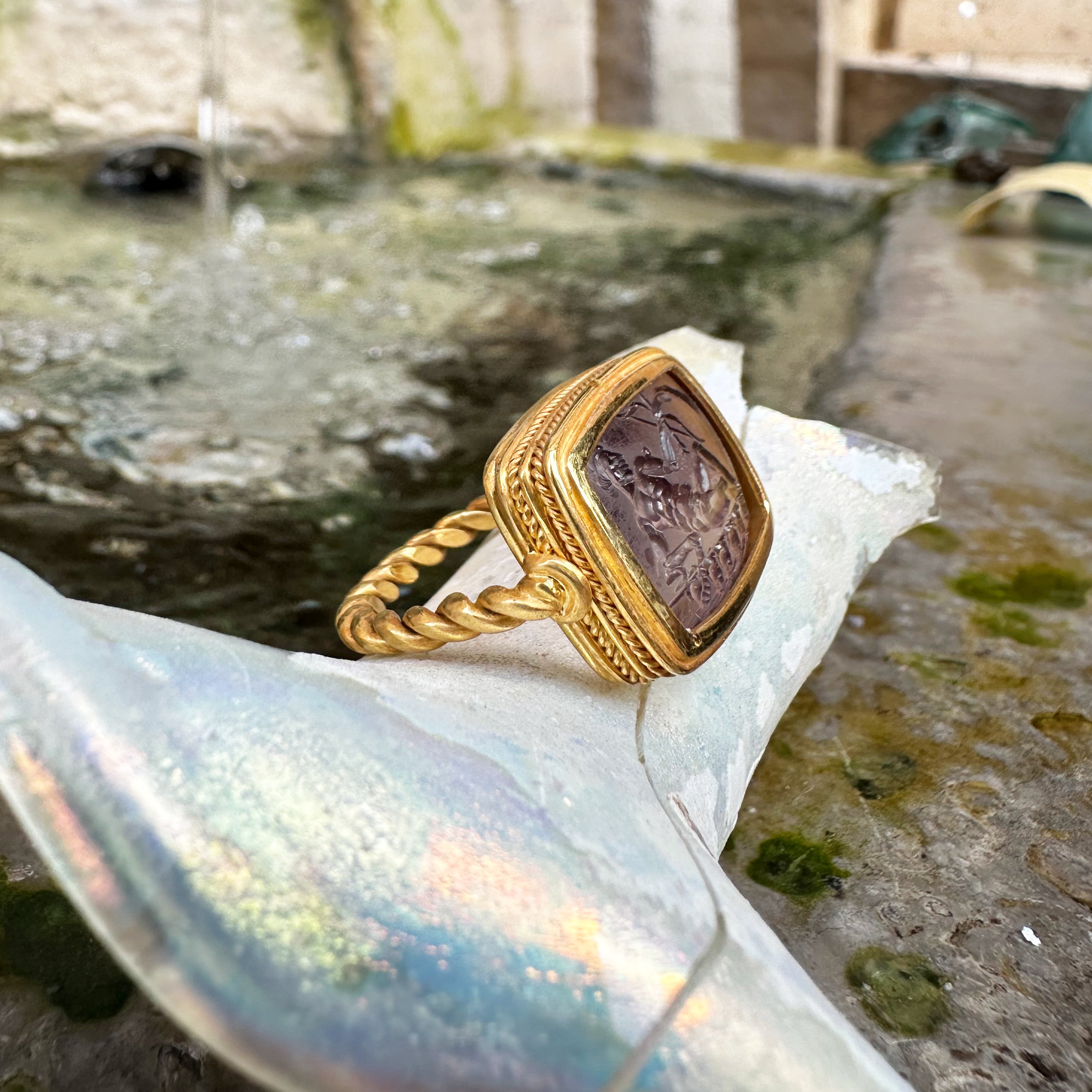 • Handmade 100% Made in Italy • Authentic Intaglio 1st-2nd cent AD • Gemstone: Amethyst • Size: 7 1/2 US Adjustable • Band material: Gold 18KT • Order Processing Time: 1 Business Day • Worldwide Delivery Time: 1-5 Business Days