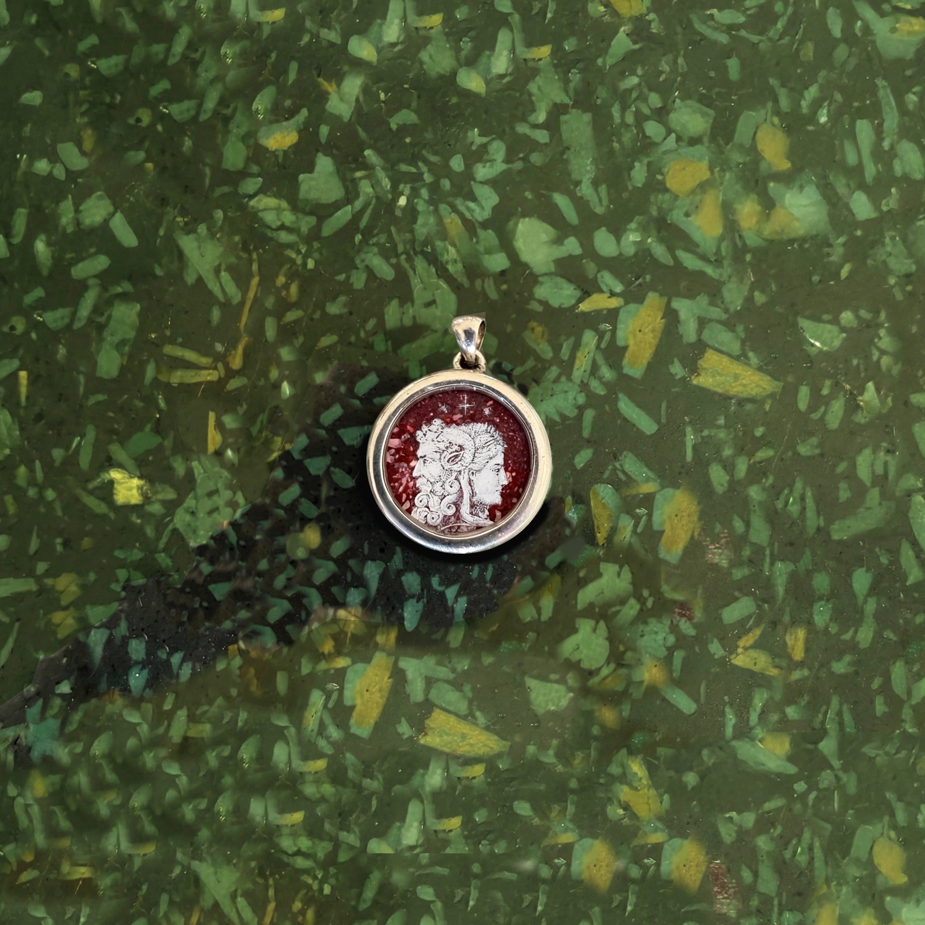 GOD JANUS Hand-Painted Silver Pendant on Red Porphyry YOUNG/WISE EDITION