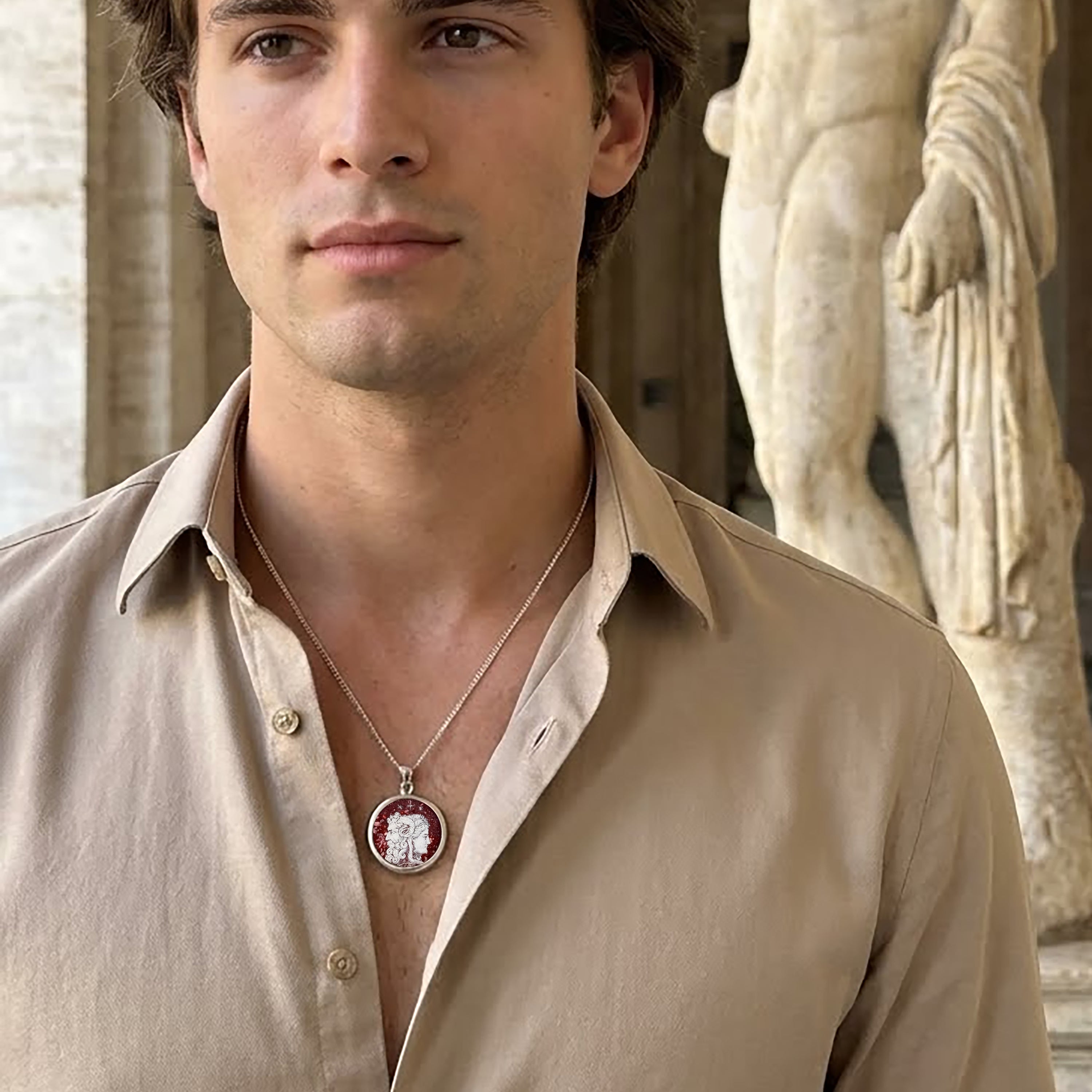 This pendant features a hand-painted representation of the Roman god Janus, skillfully painted by the artist Tommaso Rossi on Red Porphyry. Known for its deep reddish-purple hue and association with imperial Rome, Red Porphyry brings a regal and historical depth to the piece. Set in solid silver, it captures the duality of Janus—the god of beginnings, transitions, and duality—traditionally depicted with two faces. The richness of the stone enhances the artwork’s intensity, while the silver setting adds a refined elegance. This pendant merges Roman mythology with masterful craftsmanship, creating a meaningful and visually striking piece of jewelry.