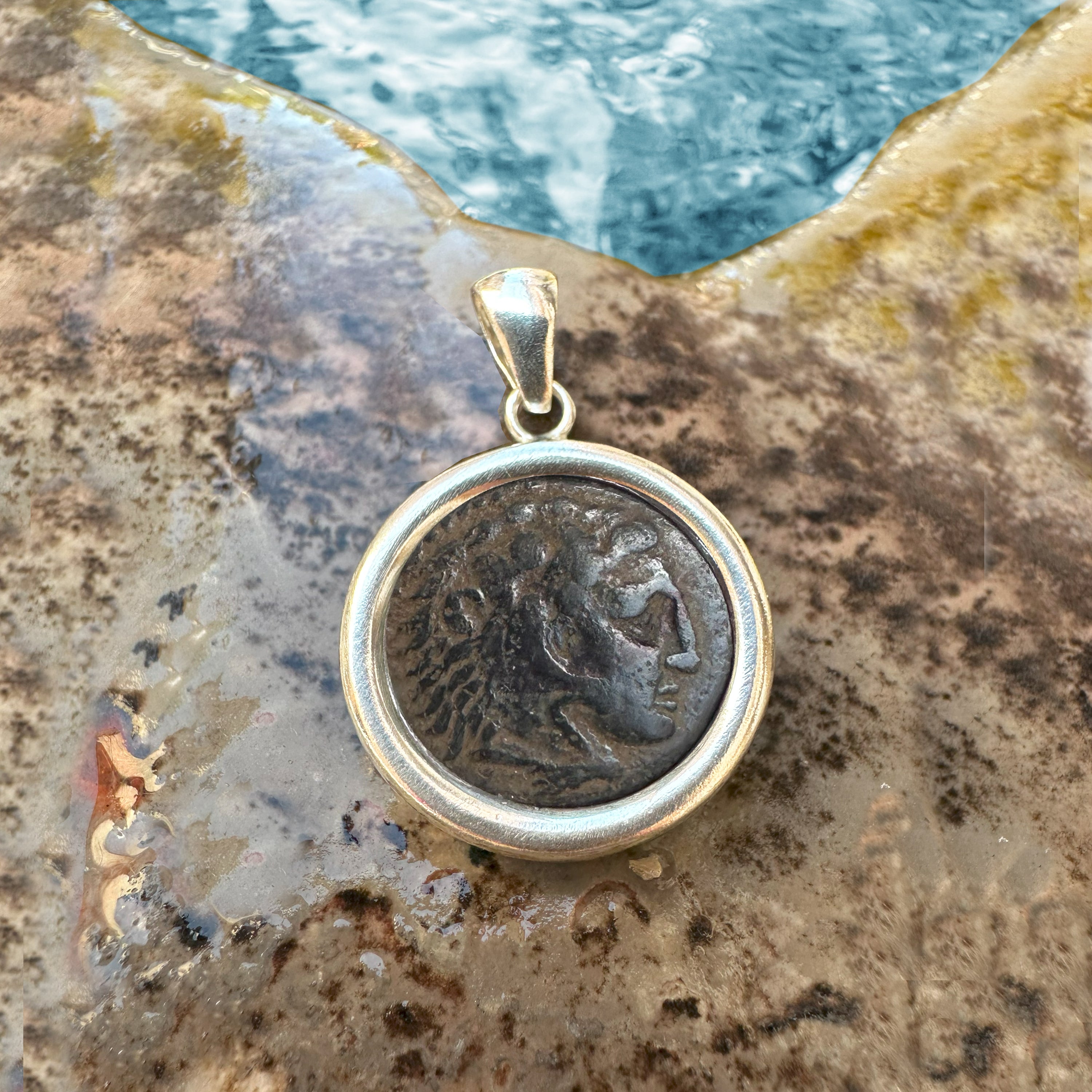 An incredible and authentic 4th century BC Greek bronze coin is set in this pendant, depicting Heracles (Hercules) wearing the lion skin on the obverse. On the reverse, the coin shows a club and quiver, traditional attributes of the hero and enduring symbols of his legendary strength and warrior spirit.