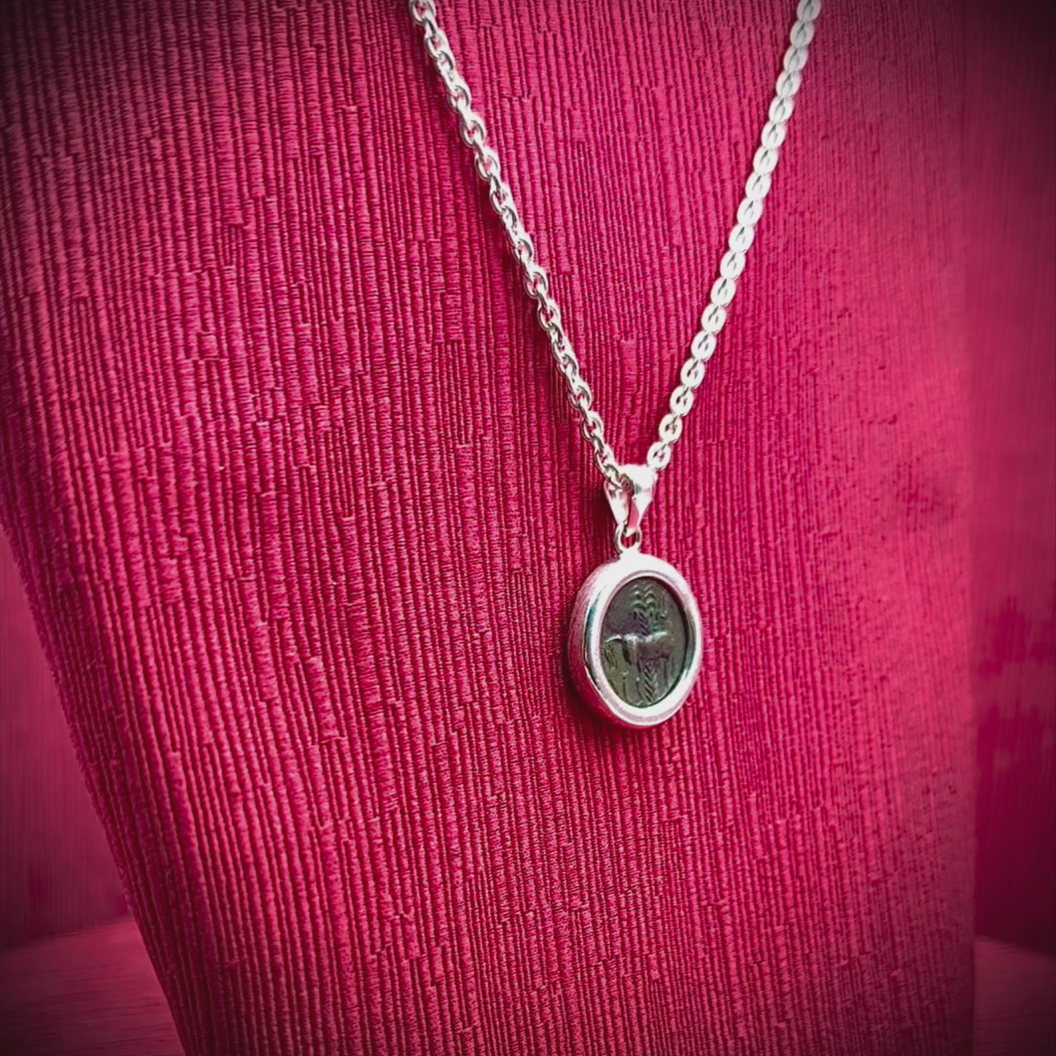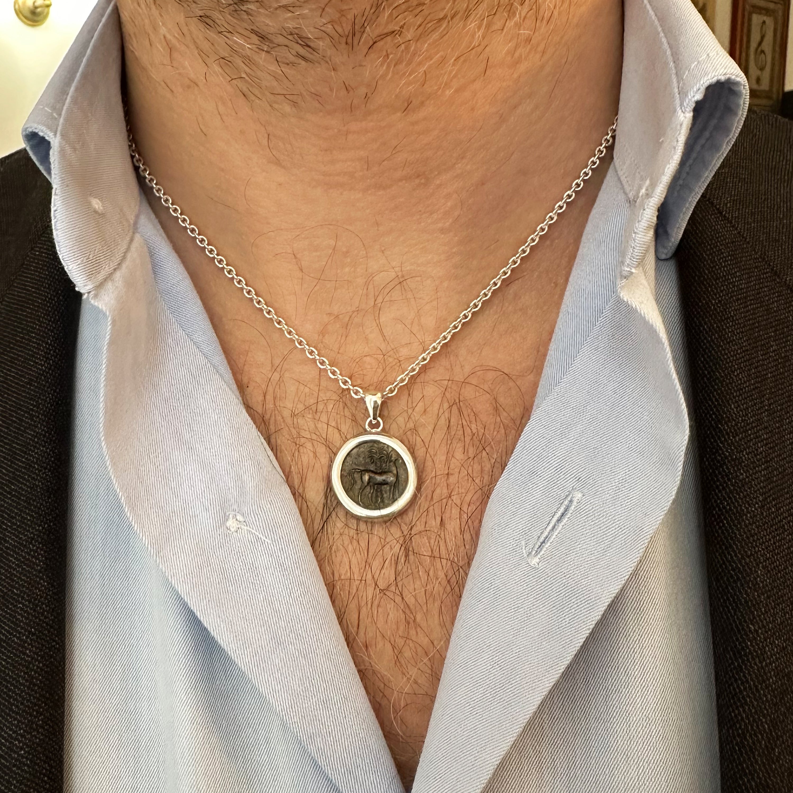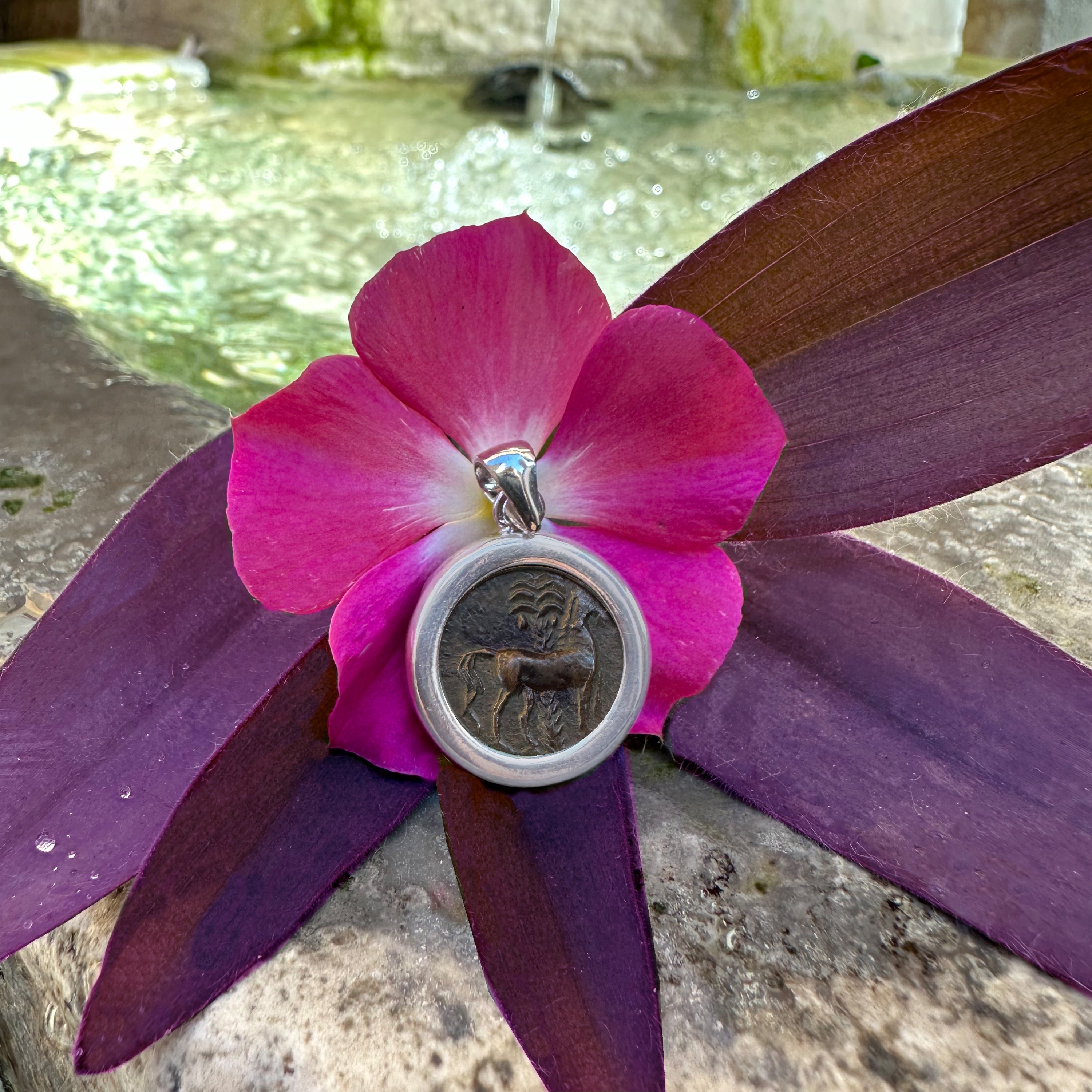 This pendant features an ancient coin from Carthage, dating back to the 4th century B.C., showcasing a prancing horse on one side and the Goddess Tanit on the other.