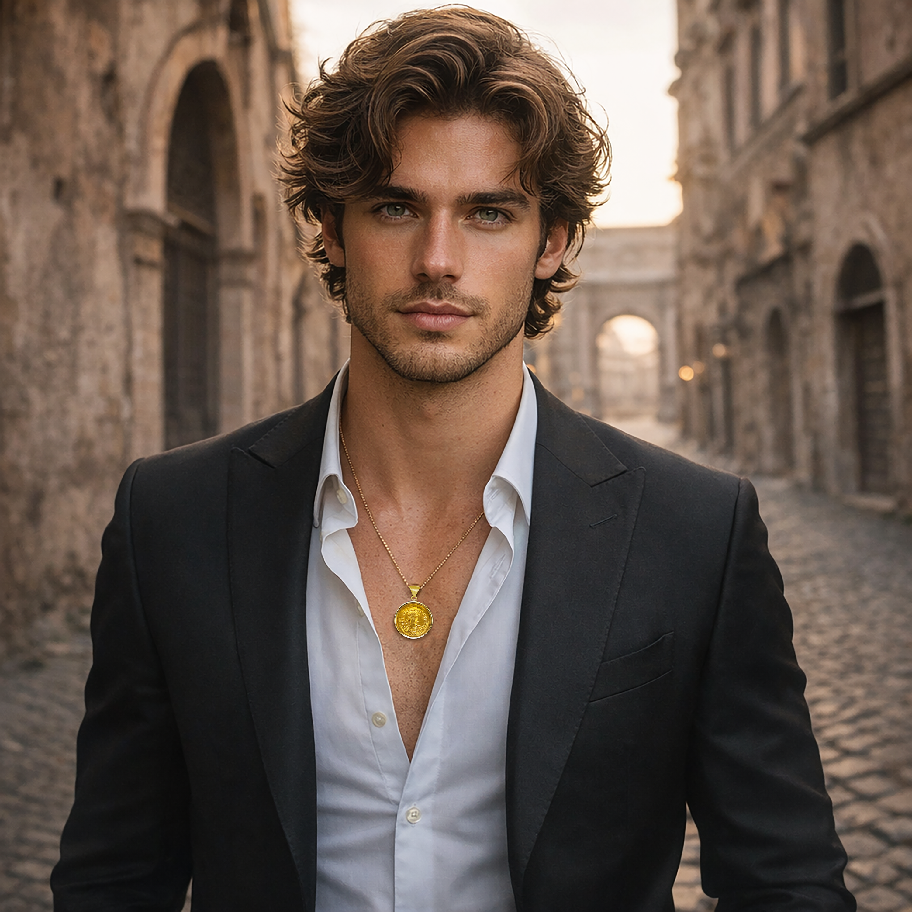 This exquisite 24 kt gold aureus pendant features an authentic Roman coin from the 4th century AD, showcasing the likeness of Emperor Leo I on the obverse.The coin's setting is 18 kt gold. Depicted in full armor, with a shield and lance, Leo stands as a symbol of strength and leadership. On the reverse side, the image of the goddess Victoria is portrayed holding a jeweled cross, a powerful symbol of divine favor and victory.