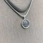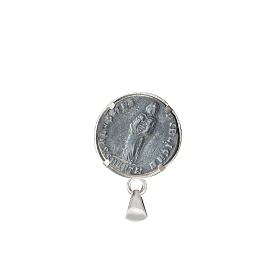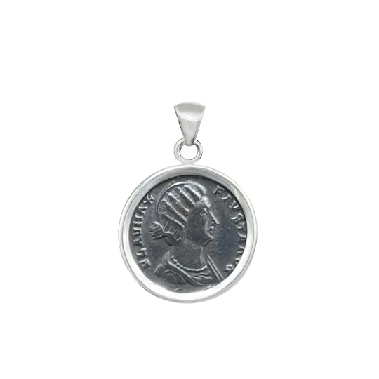 Within this elegant sterling silver pendant rests an authentic Roman bronze coin featuring Fausta, the esteemed wife of Emperor Constantine. Adorning the reverse side of the coin is the image of Salus, embodied by Fausta, cradling two of her children in her arms.