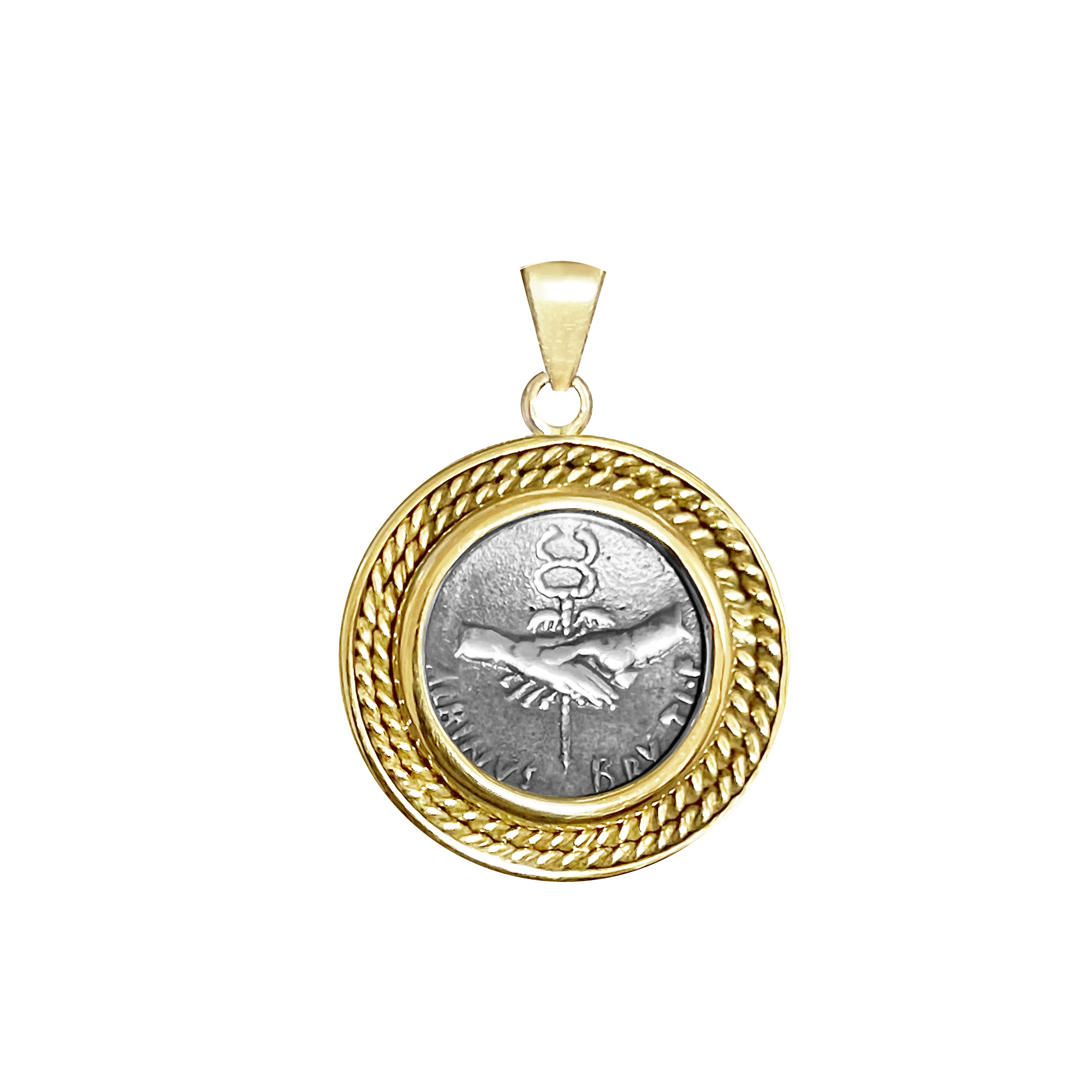 DEXTRARUM IUNCTIO, SYMBOL OF LOVE AND FRIENDSHIP Genuine Ancient Roman Coin 48 BC 18 Kt Gold Pendant
