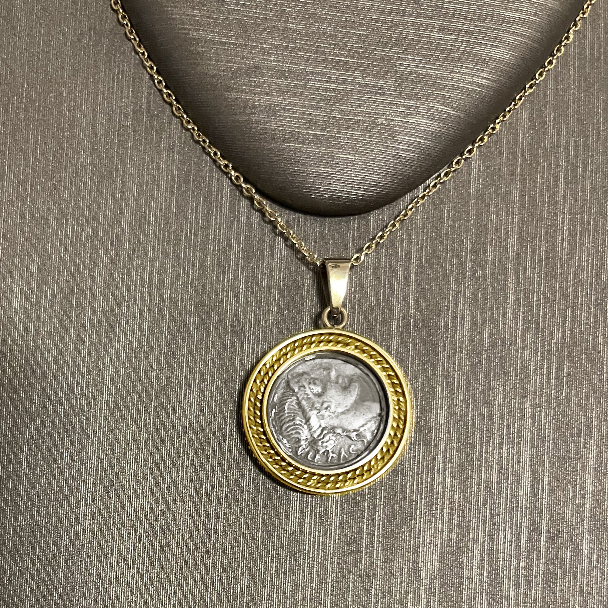 This exquisite 18 Kt Gold pendant showcases an authentic Roman coin minted by Albinus Bruti in 48 BC. The coin portrays a meaningful depiction known as Dextrarum iunctio, which features clasped hands holding a winged caduceus. On the reverse side of the coin, we can observe the figure of Pietas.