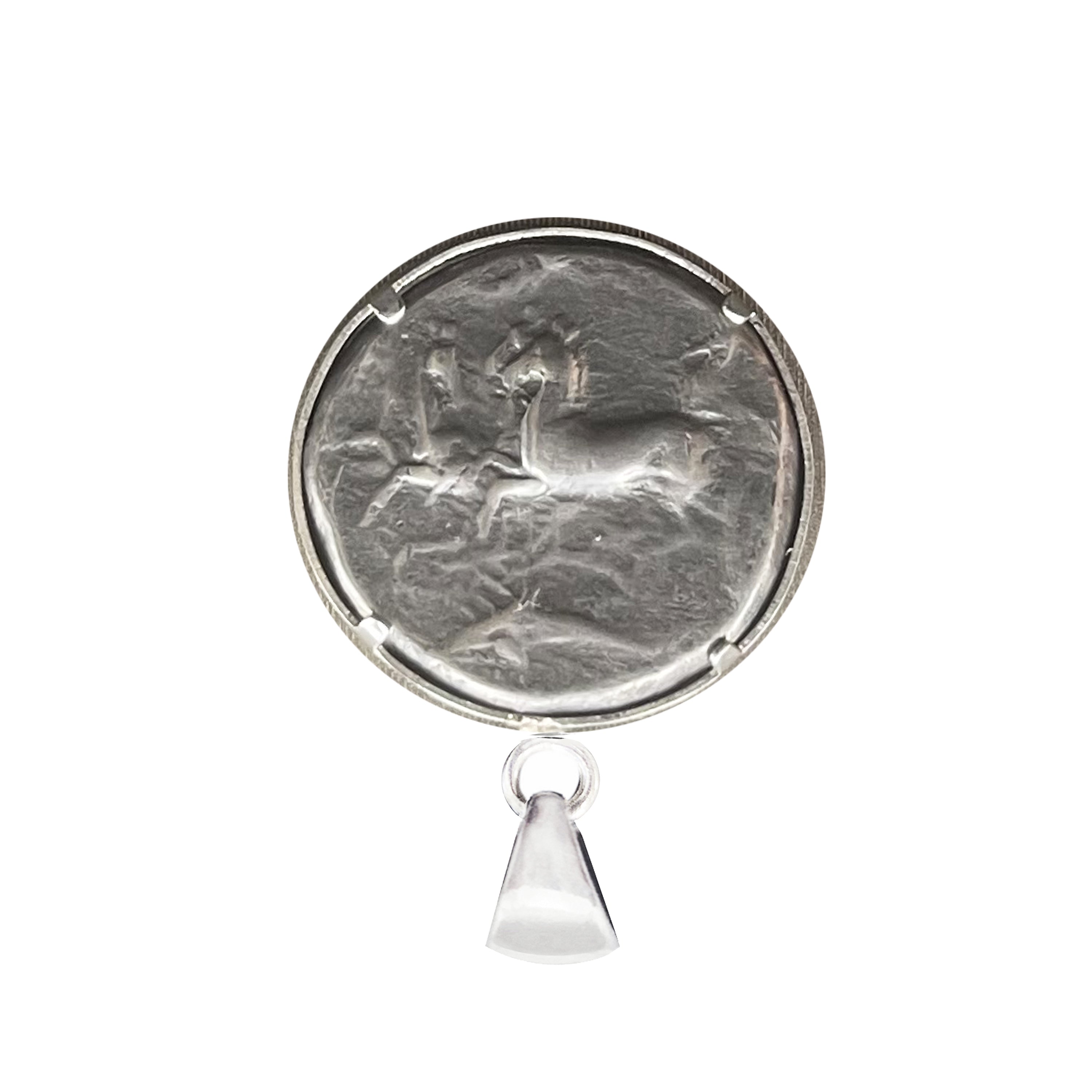 This pendant showcases an authentic Syracuse coin minted by Dionysus I (405-367 BC). One side of the coin depicts the Nymph Arethusa with dolphins, while the other side portrays a charioteer driving horses and a flying Nike.